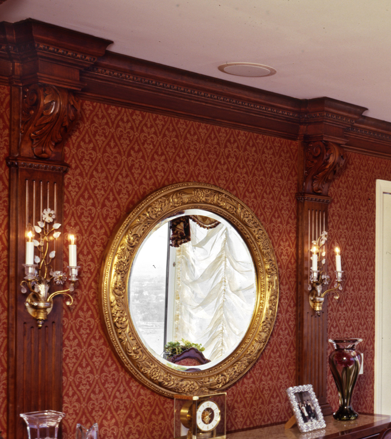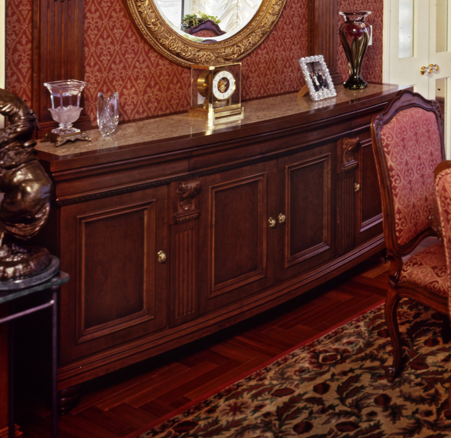 Grand Traditional Dining with handcrafted Bombay front buffet, rich fluted pilasters with carved corbels and raised panel wainscoting.