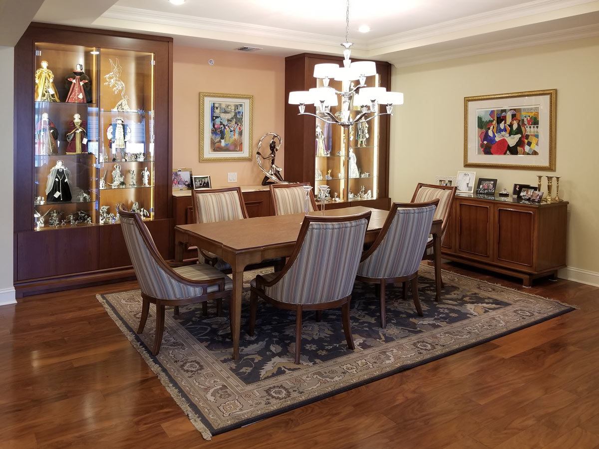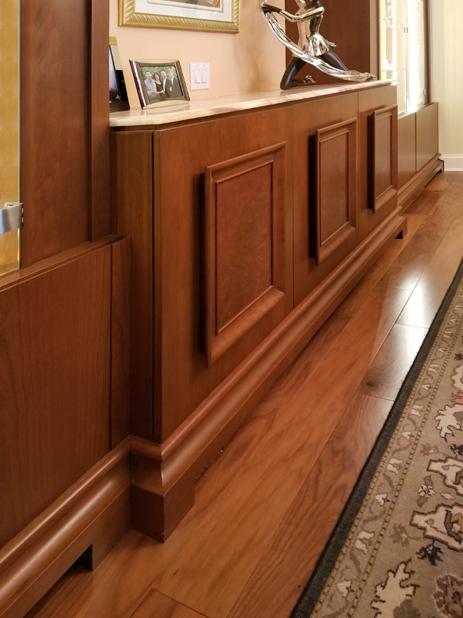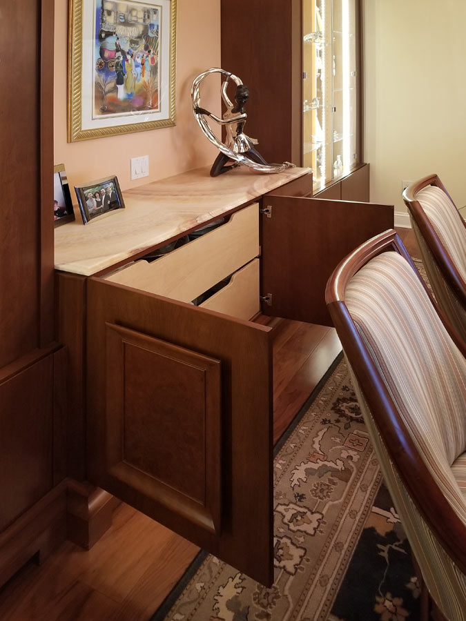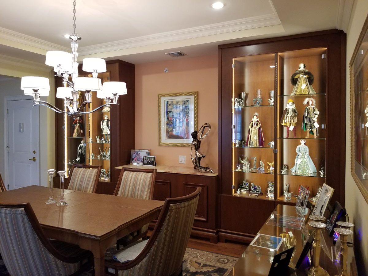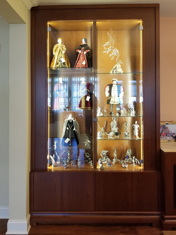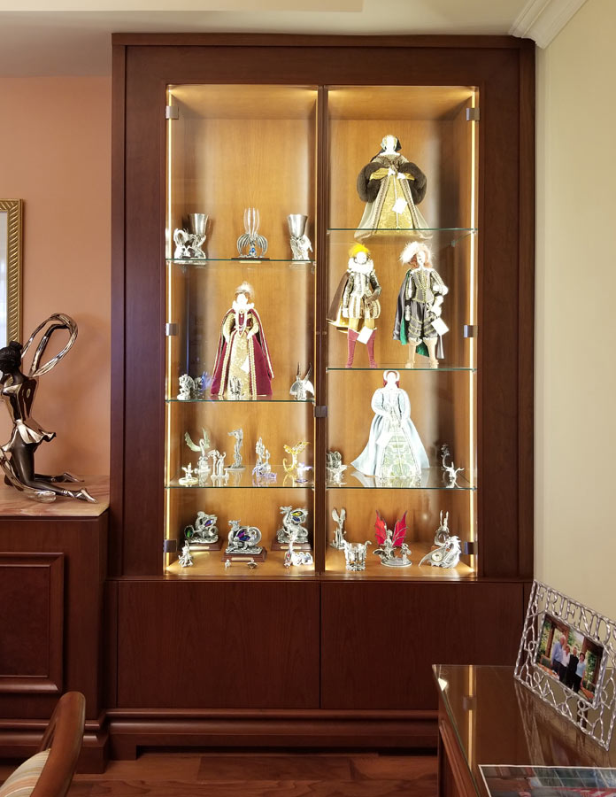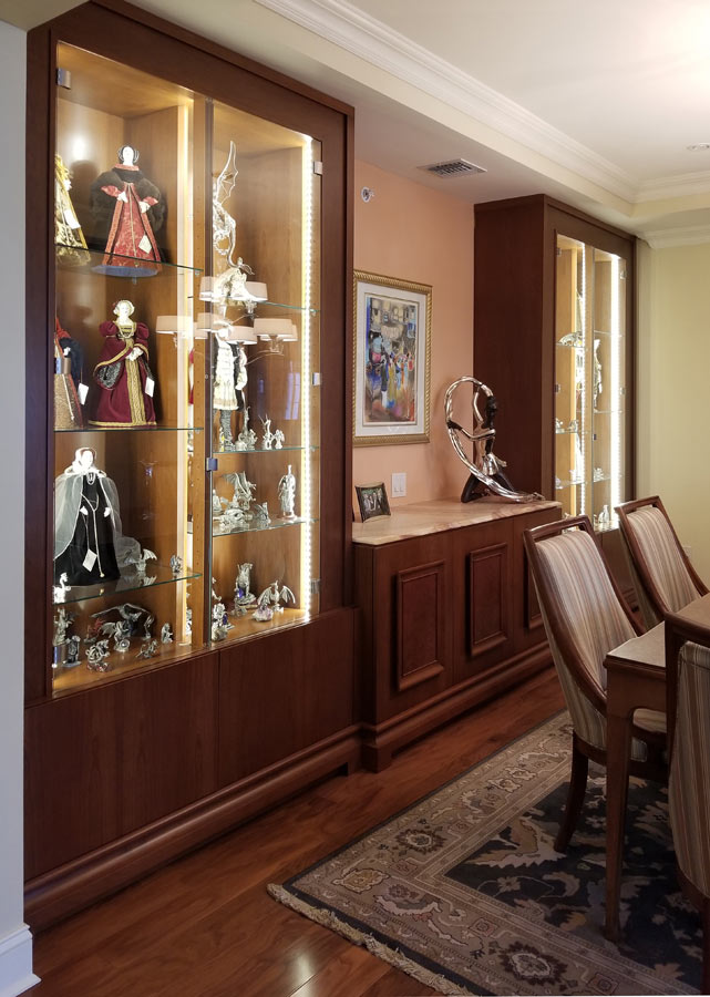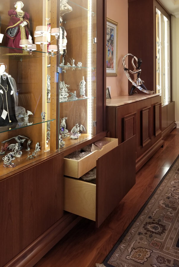 This Cherry wood wall to wall, floor to ceiling piece is designed to display rare porcelain dolls and figurines, while satifying the serving and storage requirements of a family dining room. Recessed LED lighting is provided for even illumination, and the finely crafted base, custom shaped wood handles and stone serving countermake this furniture unique, functional and timeless.