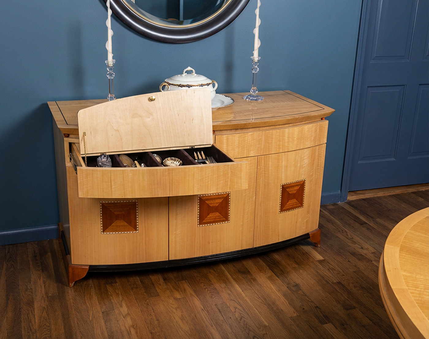 Coordinating with the Dining Table is a Curved Front Bombay Style Buffet with Lift Top Silverware Drawers lined with Pacific Cloth and accented with Diamond Mahogany Designs bordered with Inlays that are centered in the Curved Door Fronts.