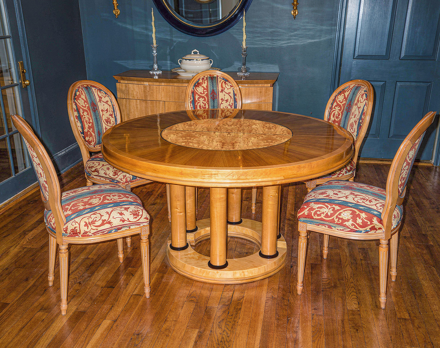 The Top of this Biedermeier Style Dining Table has an Outer Sunburst in Shimmering, Exotic Afromosia Veneer with the Center finished in beautifully burled Birds-Eye-Maple. A Maple Bull Nose Trim the Top Edge and Four Maple Columns with Black Lacquer Base Plinths support the top. A Maple Bull Nose also trims the circular base. The extension leaves are sequenced matched to continue the layups of the Afromosia and the Birds-Eye-Maple Veneer Designs.