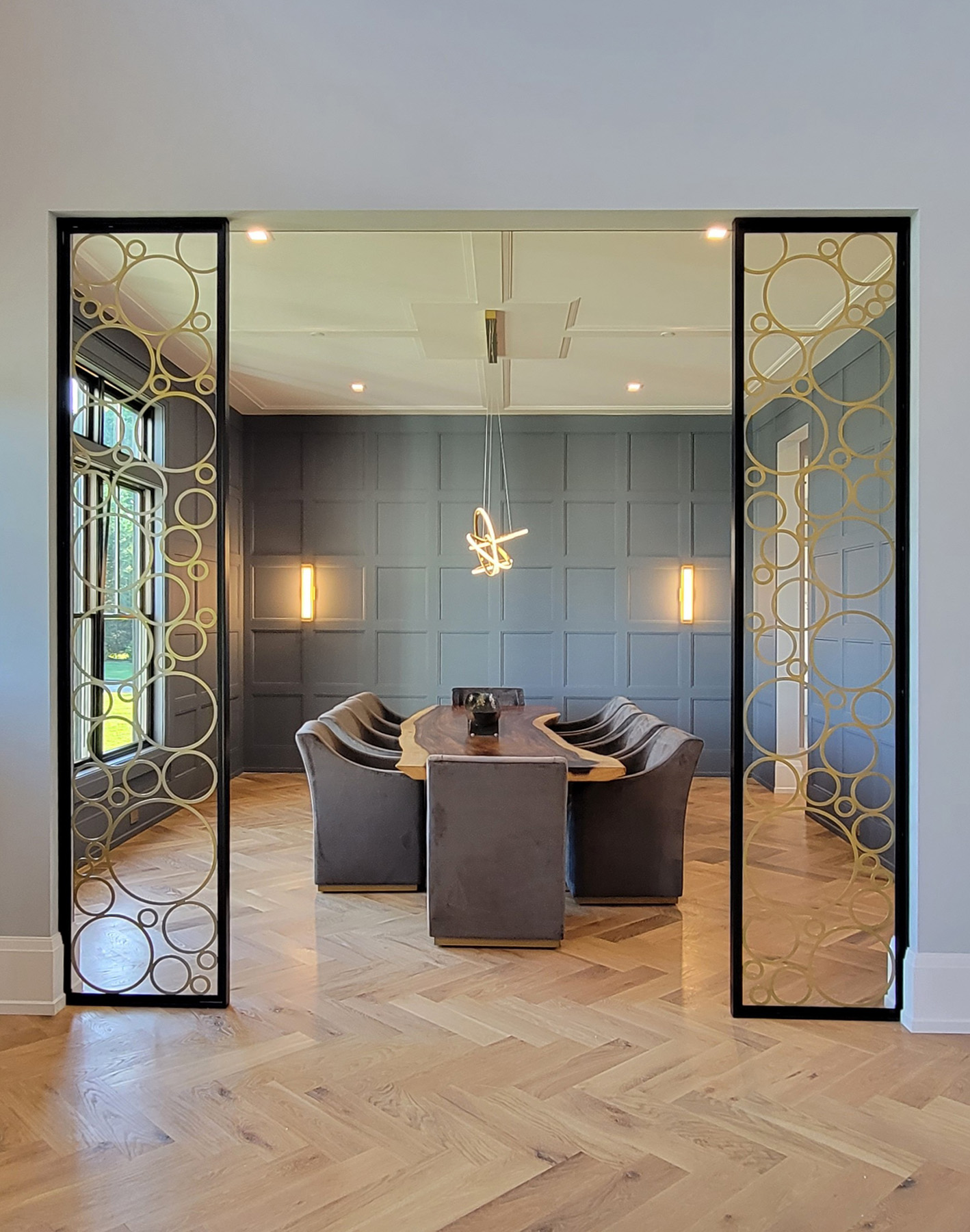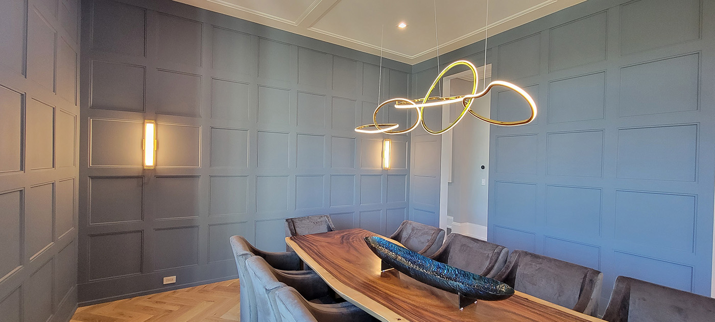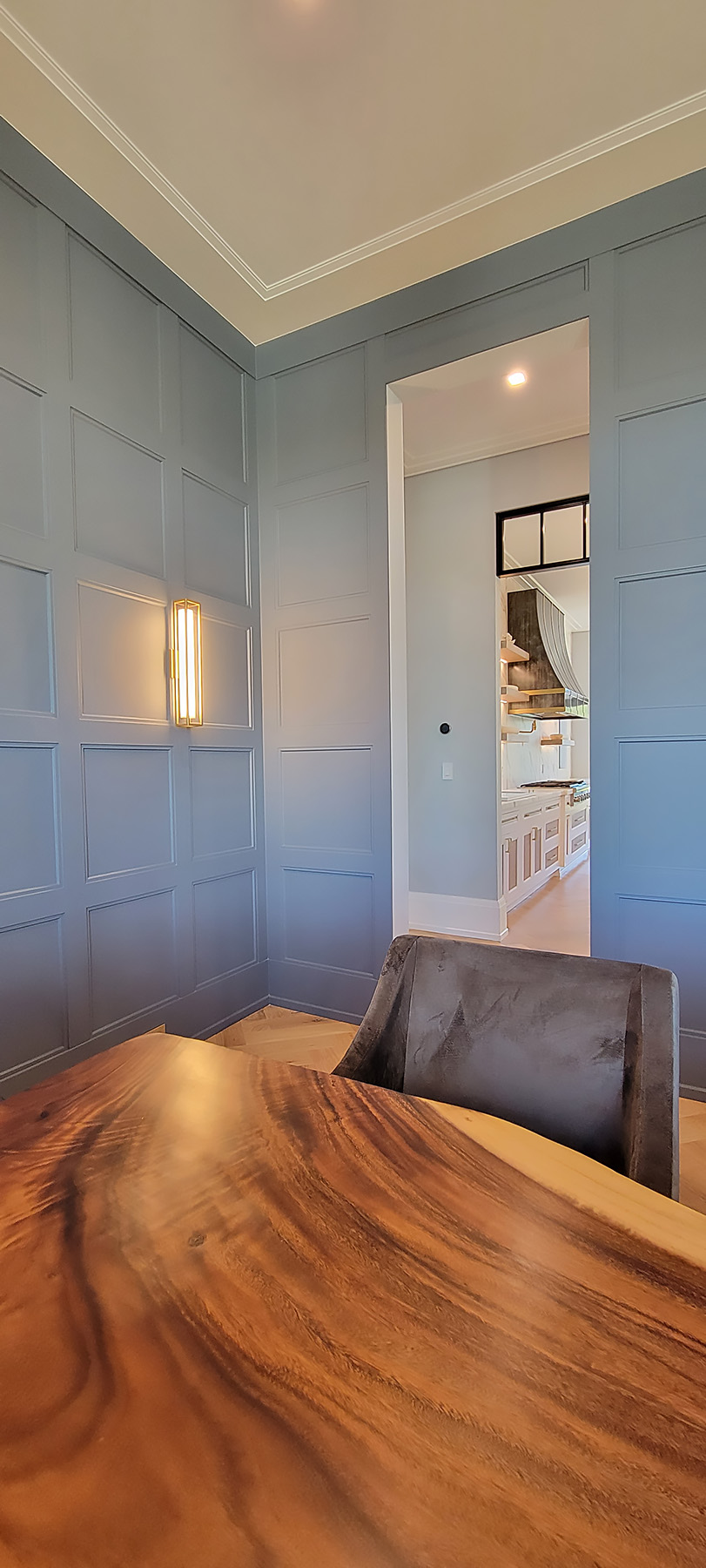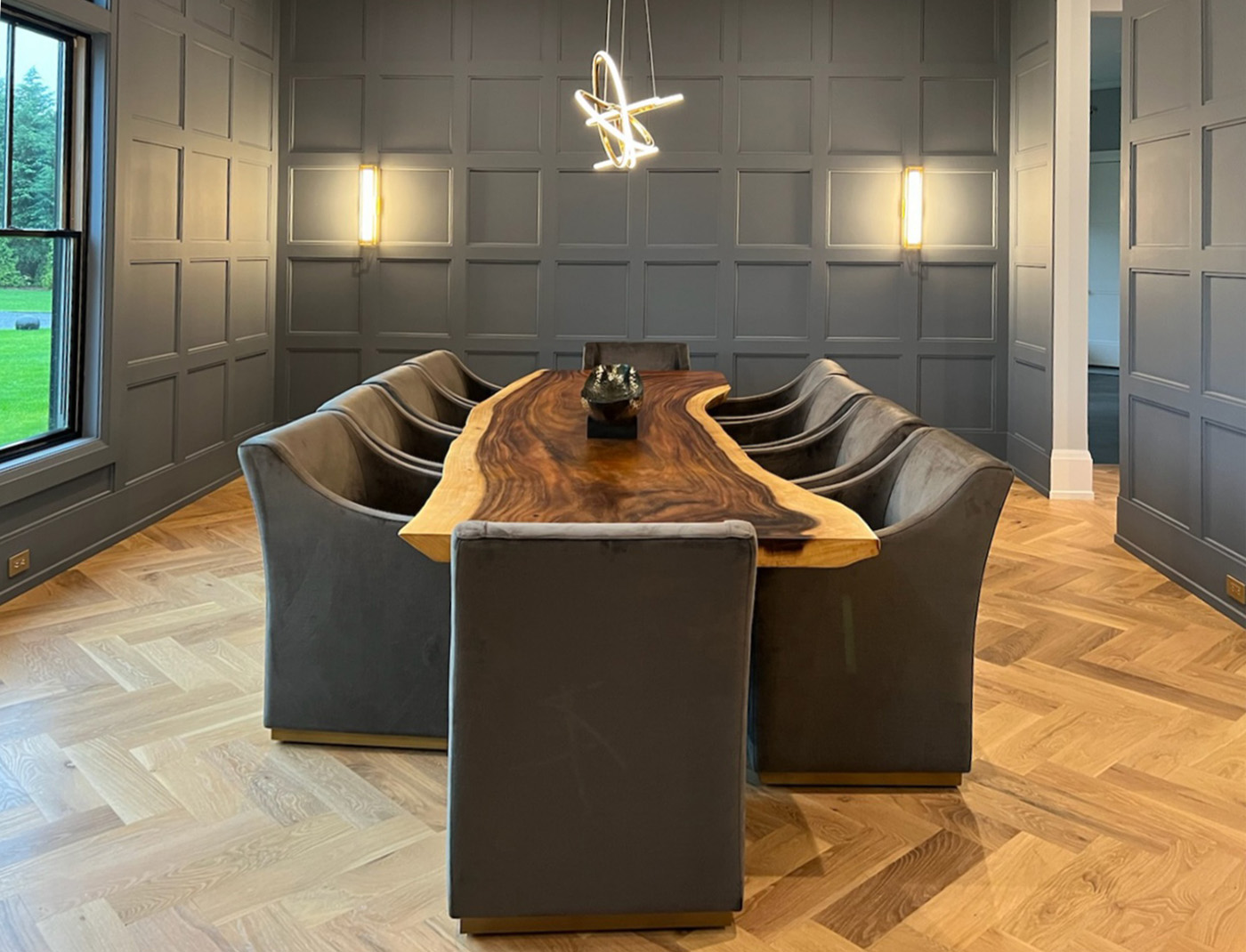 Blue and Brown are a handsome combination, both in clothing ensembles and architectural millwork, as demonstrated by this blue lacquered recessed wall paneling that wraps around the dining room and makes the perfect backdrop for a Live Edge Walnut Dining Table.