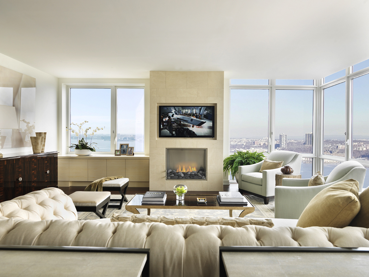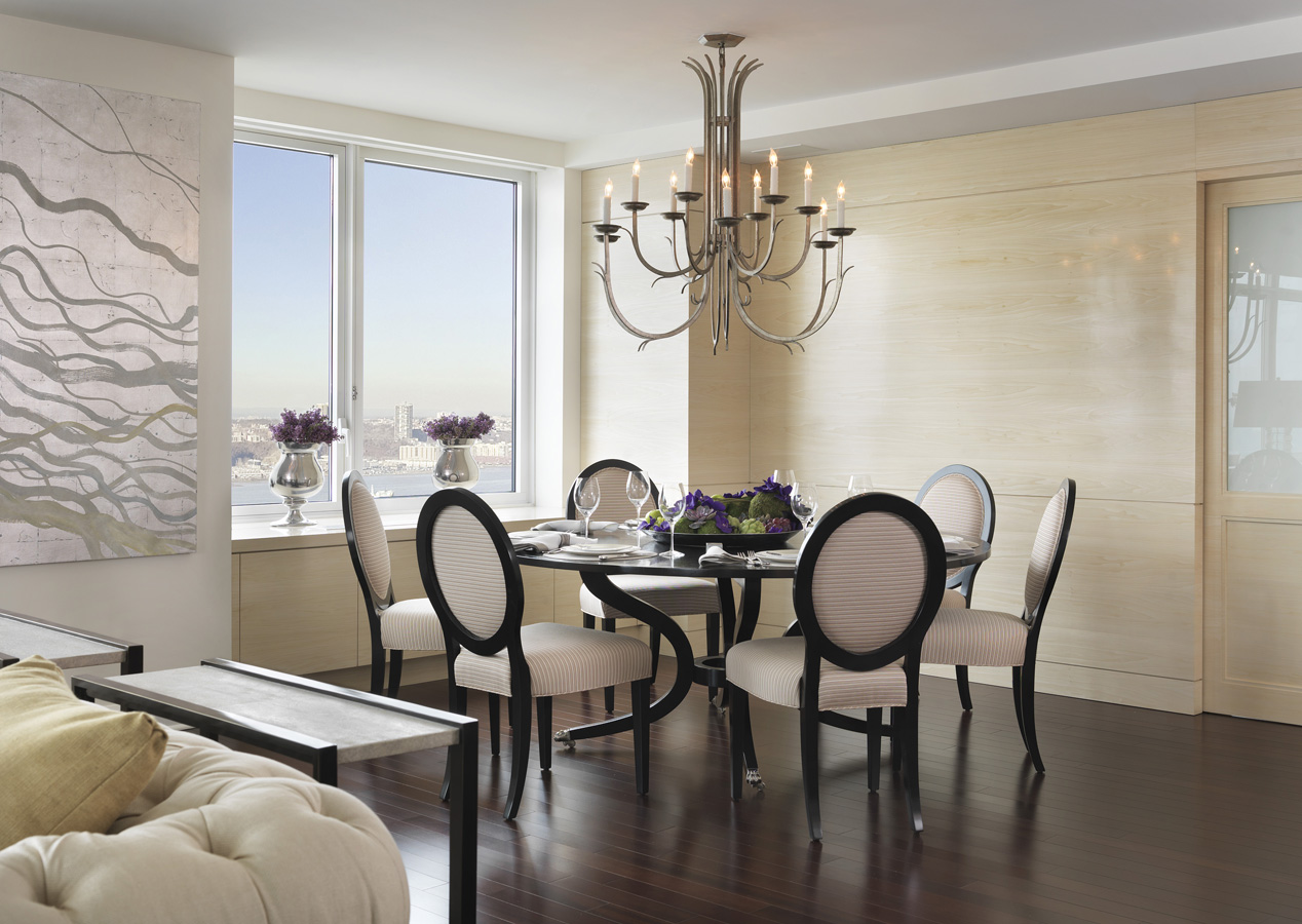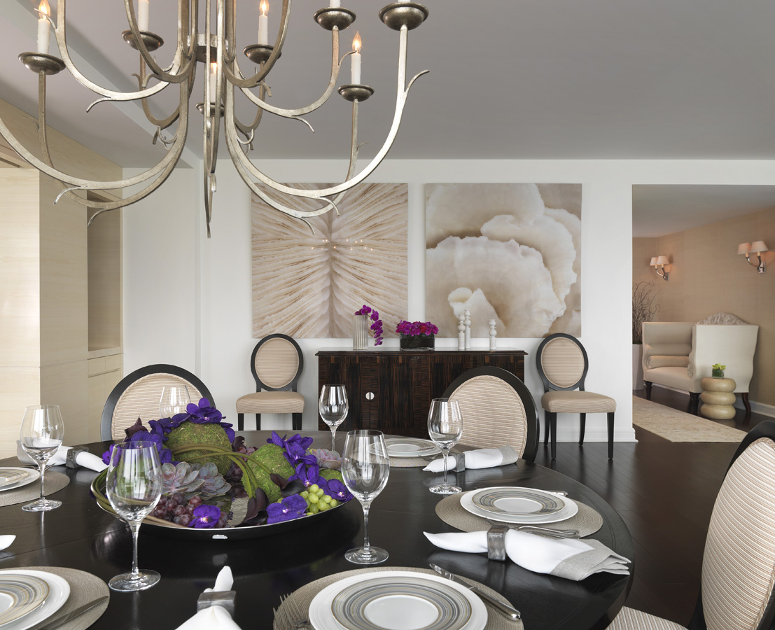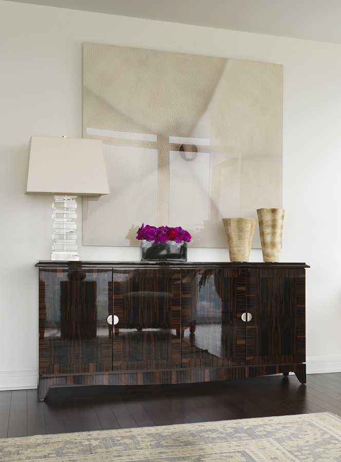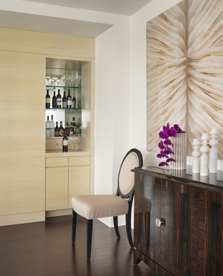Modern Paneled Dining Room area in horizontally grained Tabu veneer with built-in bar, window cabinetry, sliding panel doors and twin custom hi-gloss Ebony buffets.