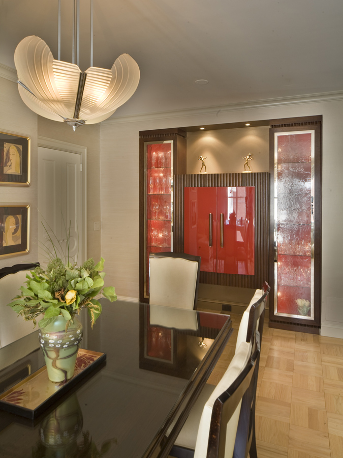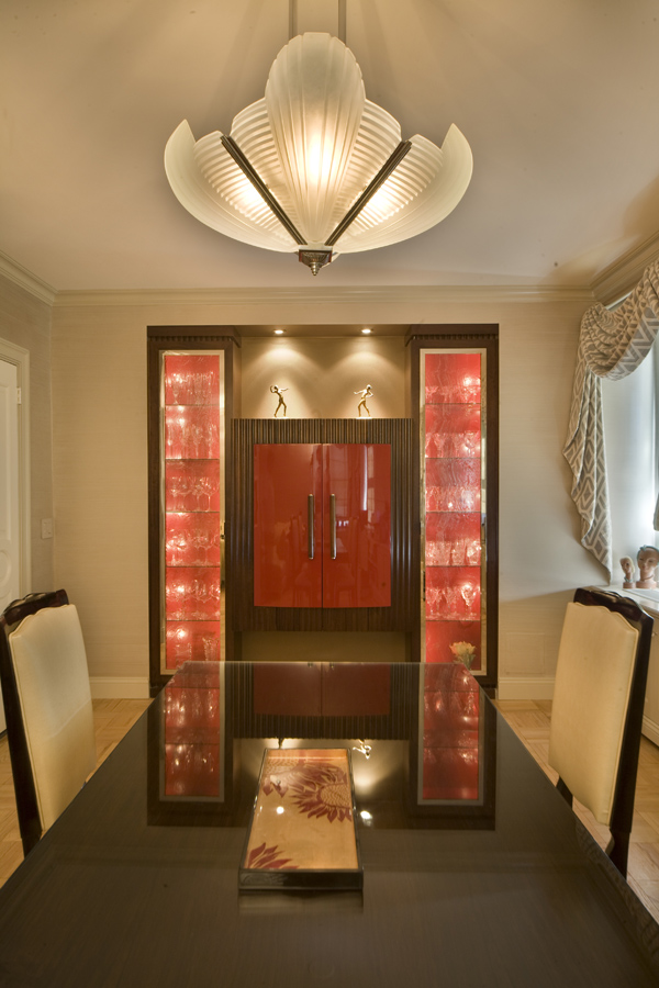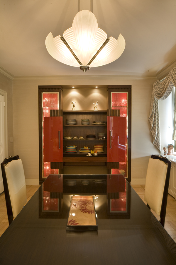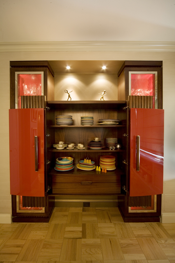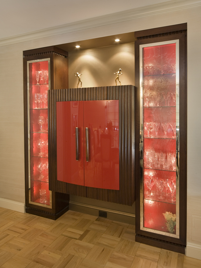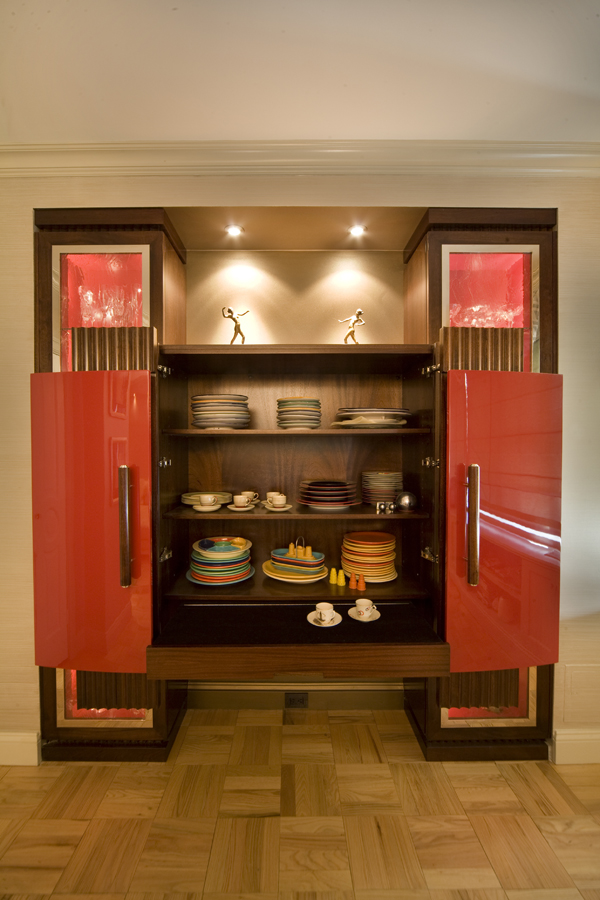 Art Nouveau Dining Room with artful Walnut and Red Lacquer built-in design, which features a curved flexing front panel, custom handles, pull out server and polished Nickel glass frames.