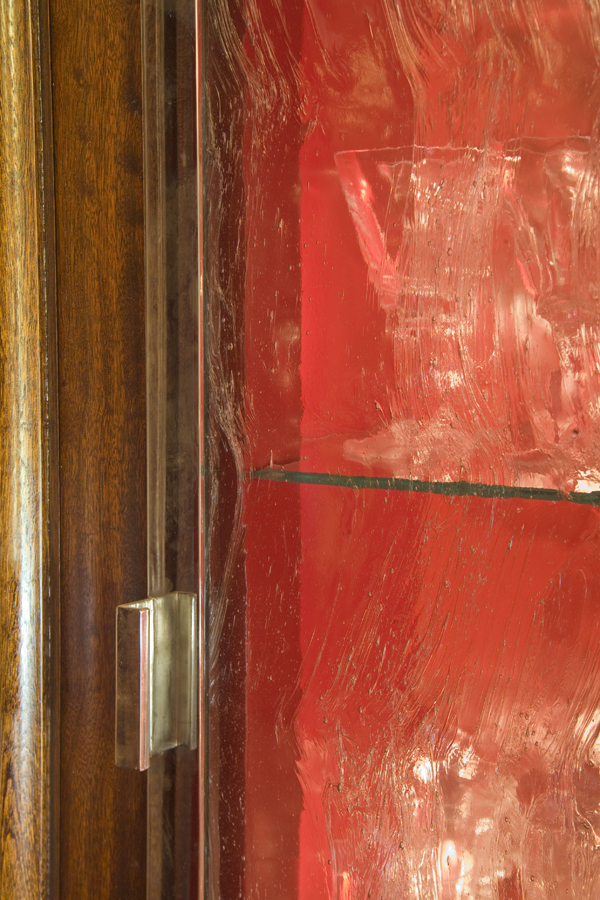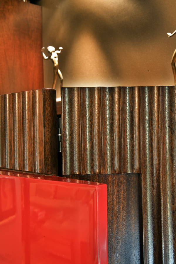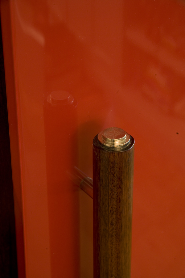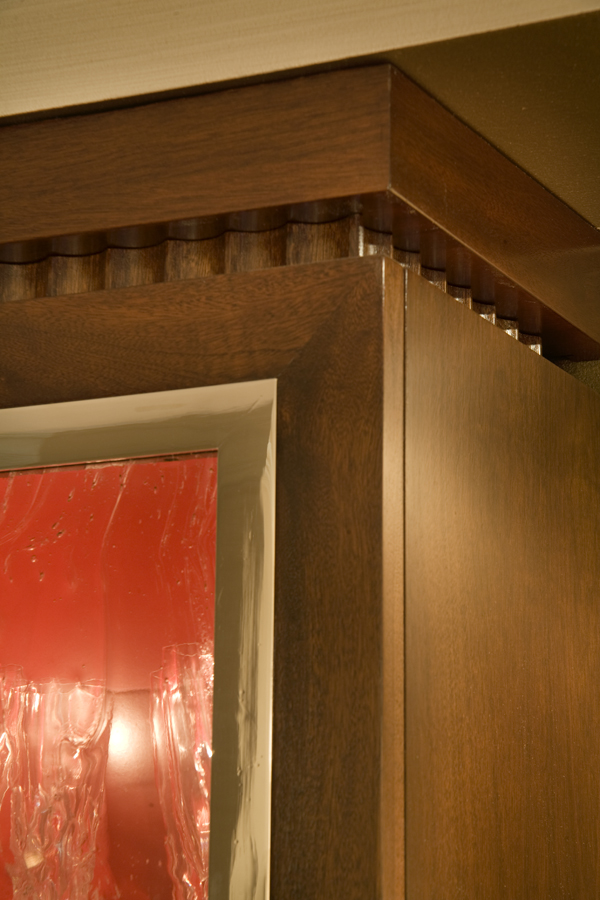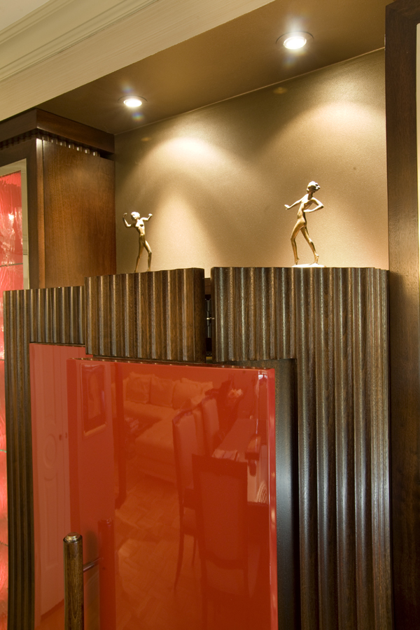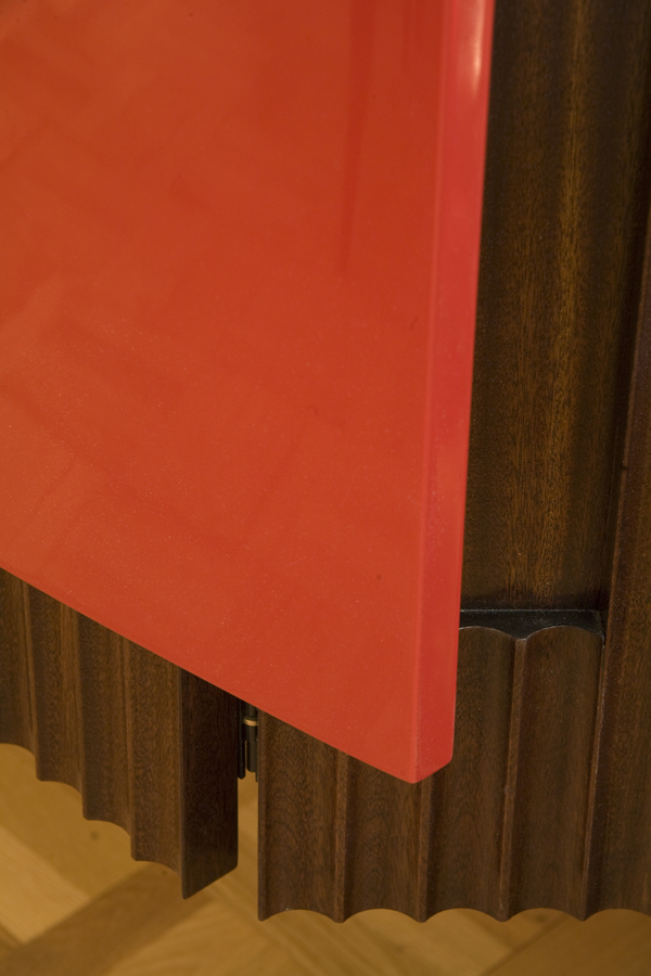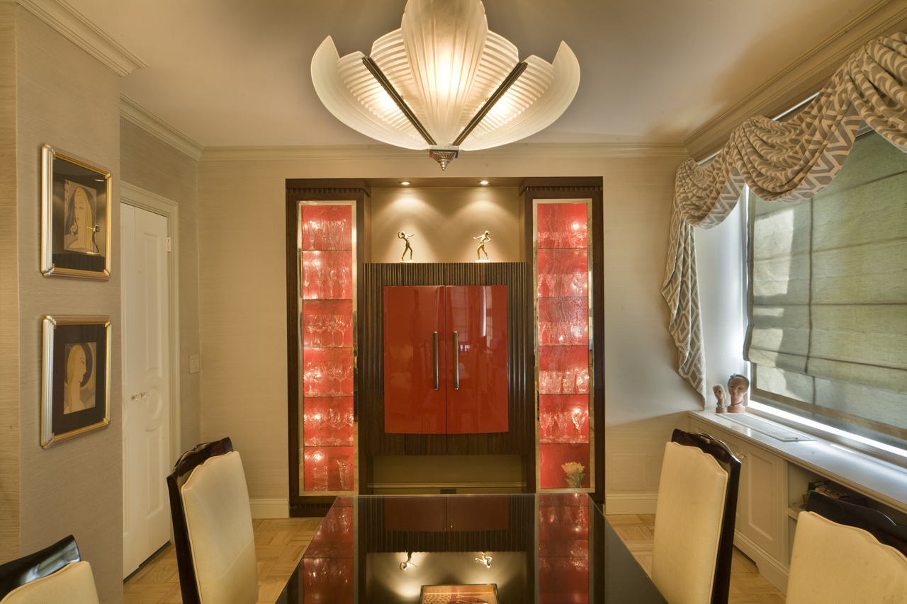 Art Nouveau Dining Room with artful Walnut and Red Lacquer built-in design, which features a curved flexing front panel, custom handles, pull out server and polished Nickel glass frames.