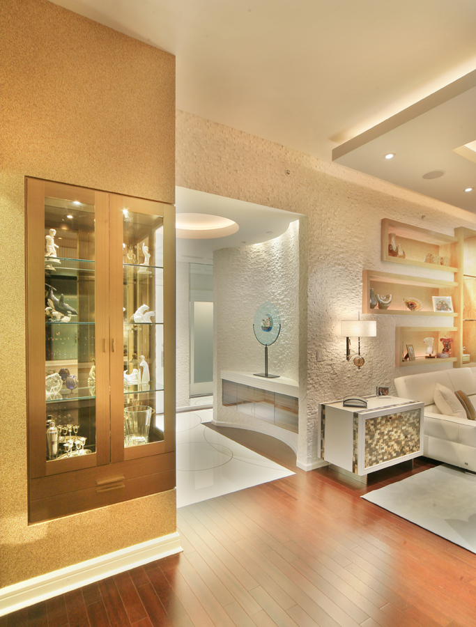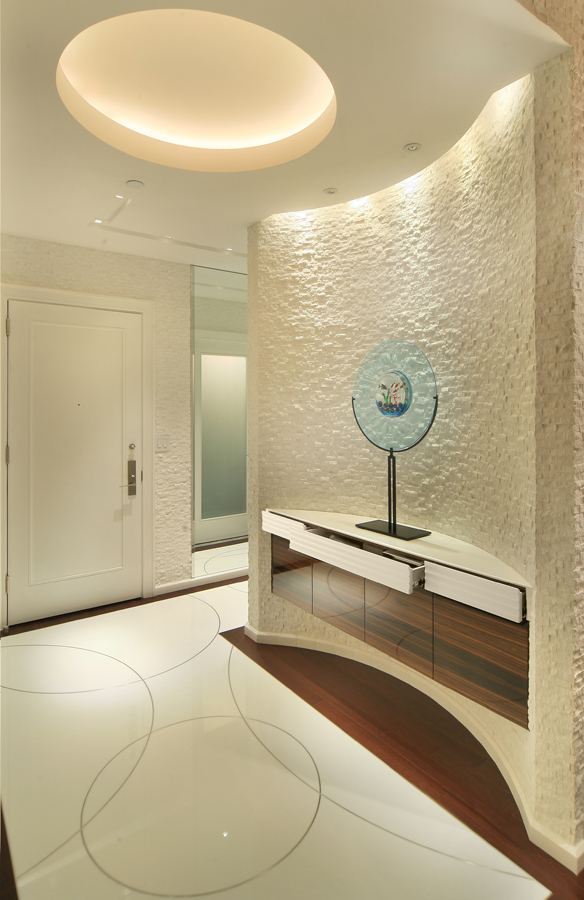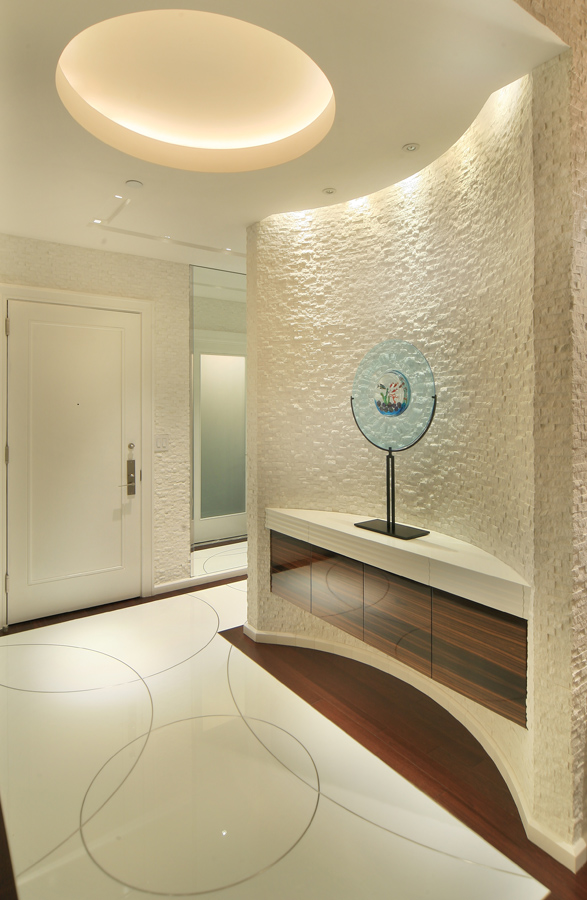 White Thasos Penthouse Foyer Entry Area with floating Ebony console mounted in a curved wall with white glass and steel floor design.