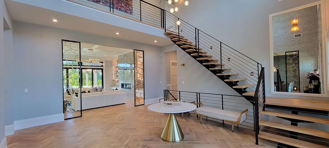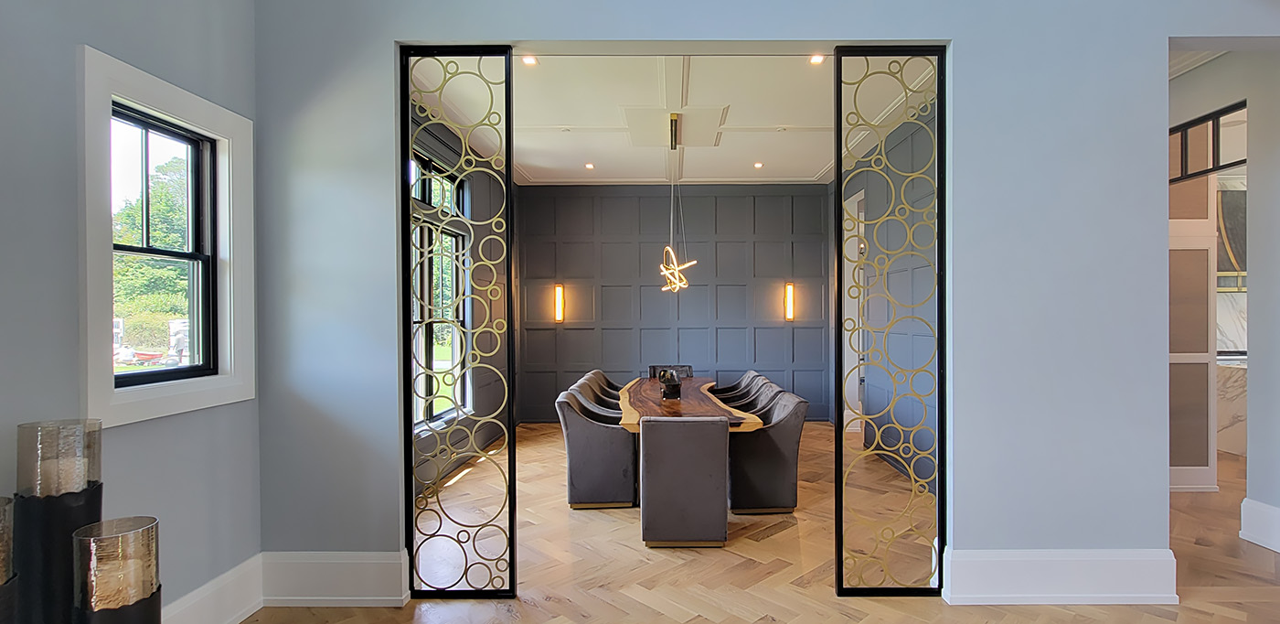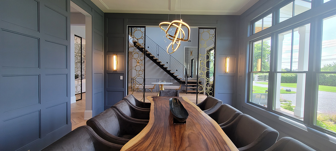 This Contemporary Entry Hall is a transitional space which adjoins the White Oak and Blackened Steel Staircase, and the Living and Dining Rooms. Anchoring the space is a Brass Cone Pedestal Table with Marble Table in the center besides an elegant Maple Settee that are positioned beneath and exciting ball pendant chandelier. Custom Metal Screens with circular designs add further interest by framing the entries to the Living and Dining Rooms.