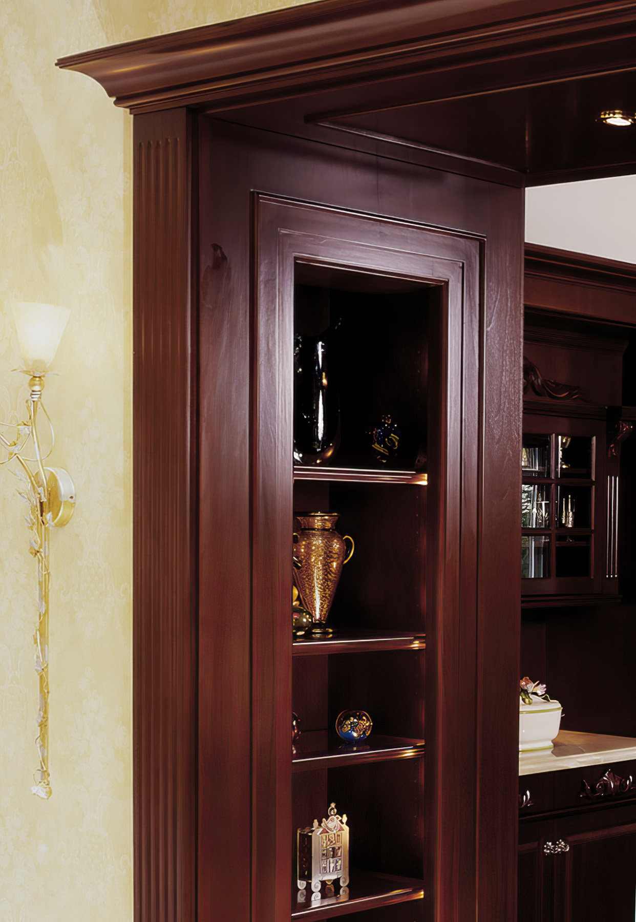 Mahogany Display Case Entry with beaded detailing and fluted pilasters.