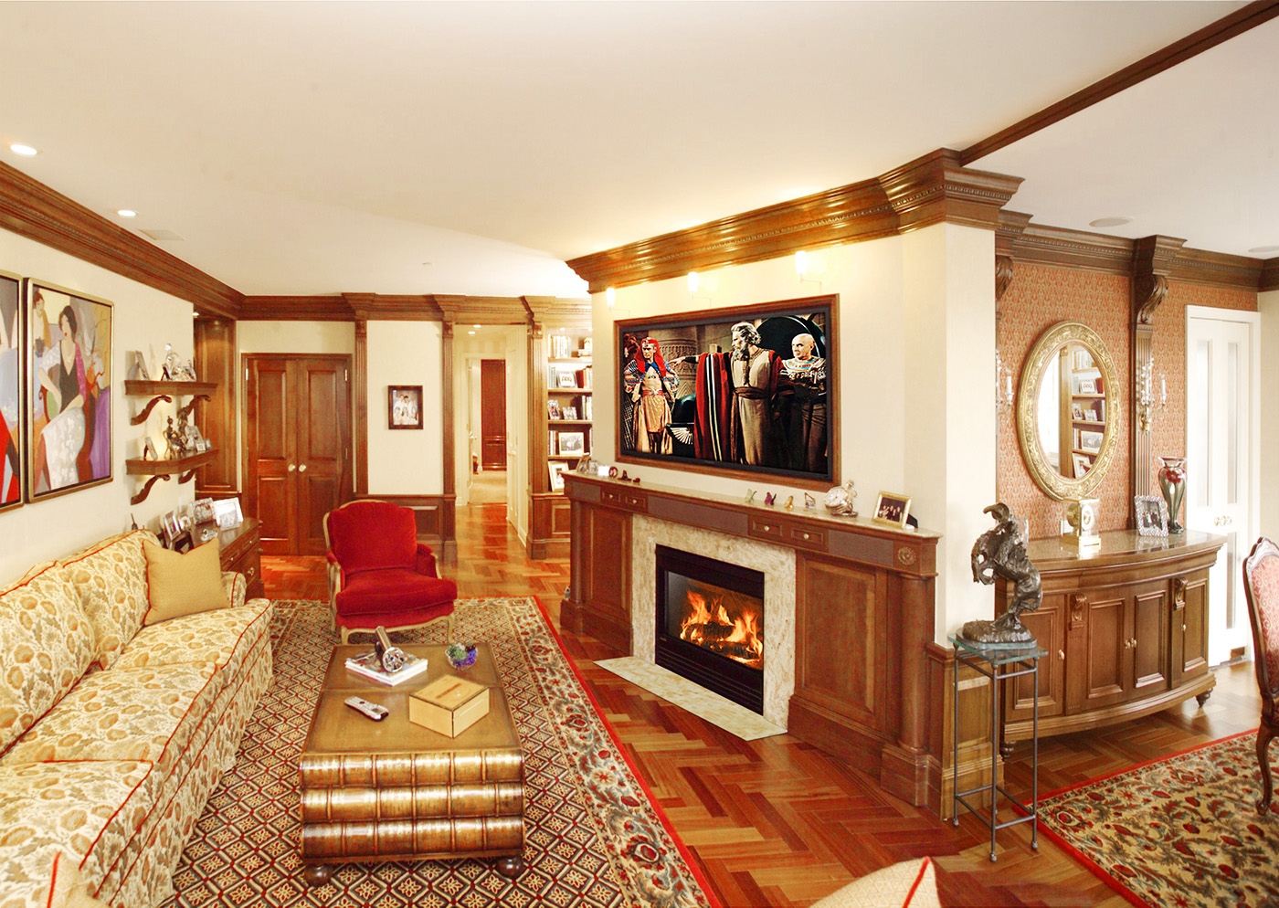 Fine Traditional Millwork adorn this Residence from the Paneled Entry Foyer and throughout the Living and Dining Rooms Areas. A Fireplace Mantel with Columns, Panels, Recessed Satellite Speakers behind Acoustic Panels and Hearth anchor the space with a Recessed and Framed 75″ TV.