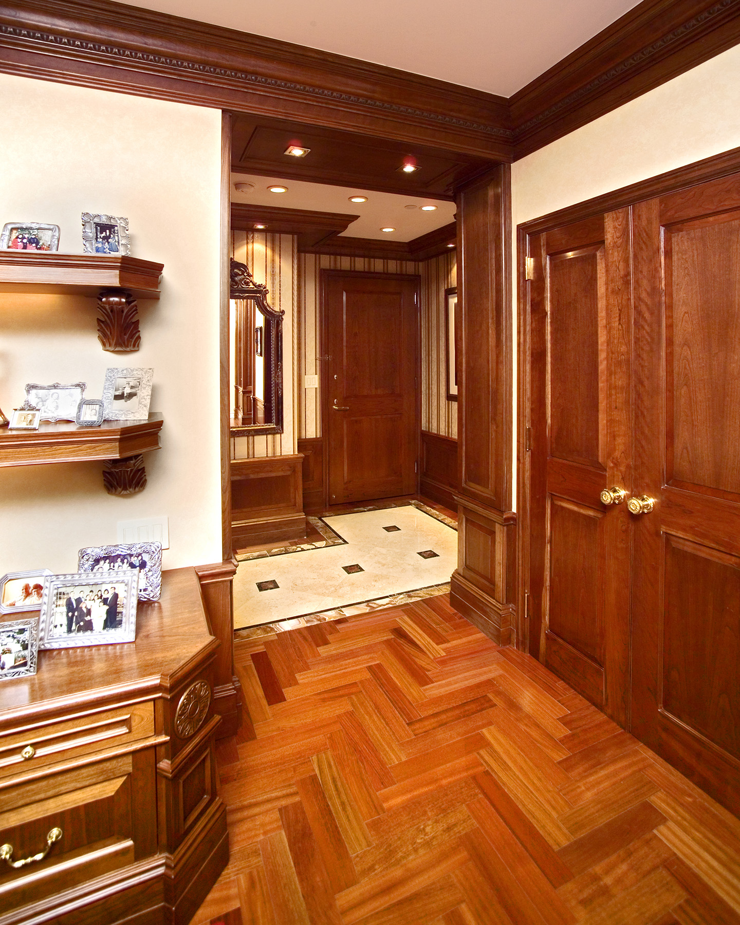 Stepped Crown Moldings with Egg and Dart Carvings trim the Living Room. Majestic Bookcases with Fluted Pilasters frame the Bedroom Hallway and finally Illuminated Floating Shelves with Acanthis Leaf Corbels and an Elegant Framed Glass Display Case complete this Warm and Inviting Environment.