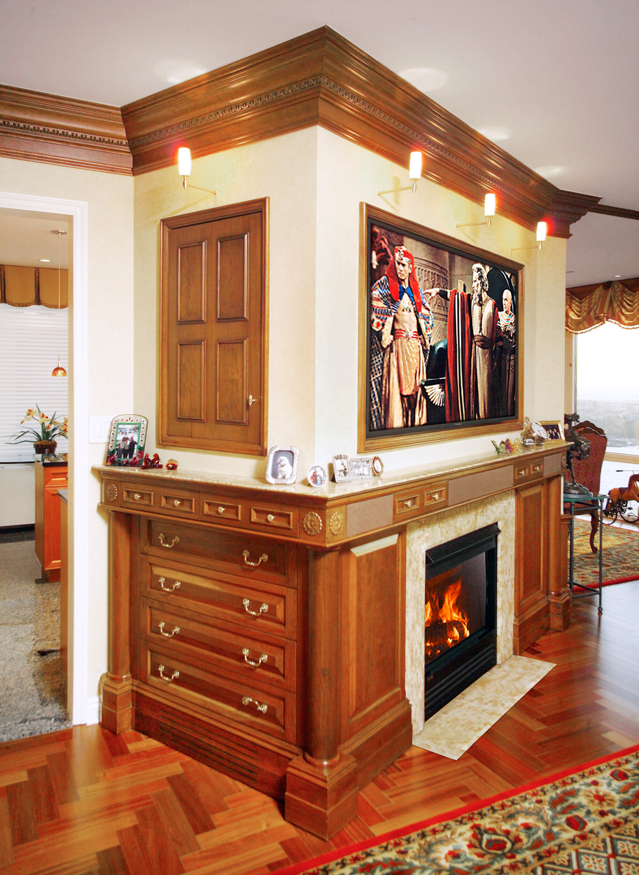 The mantel wraps the wall with Highly Functional Compartmentalized Drawers on the adjacent left side with In-Wall Cabinetry for Audio-Video Components installed above.