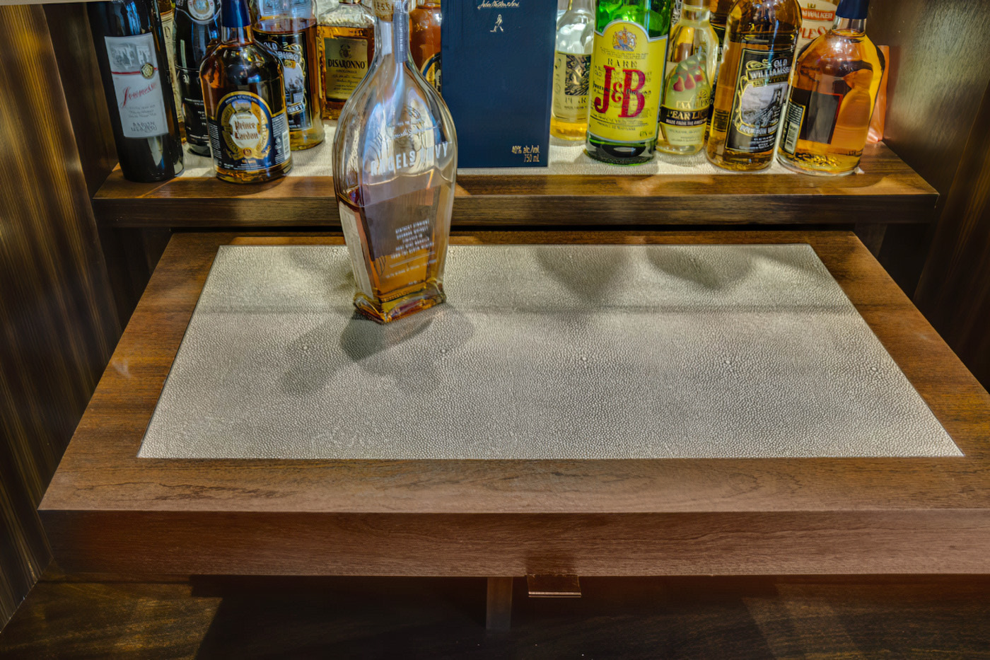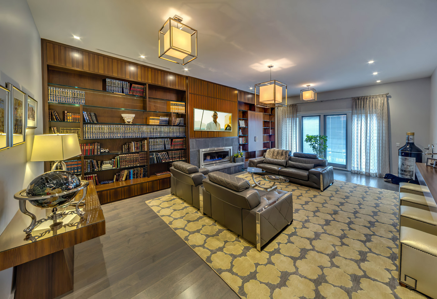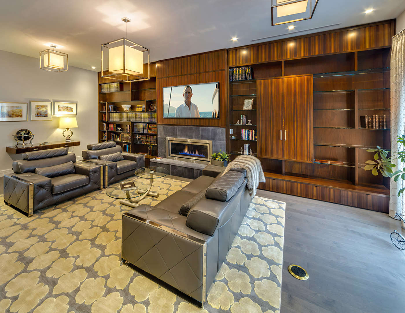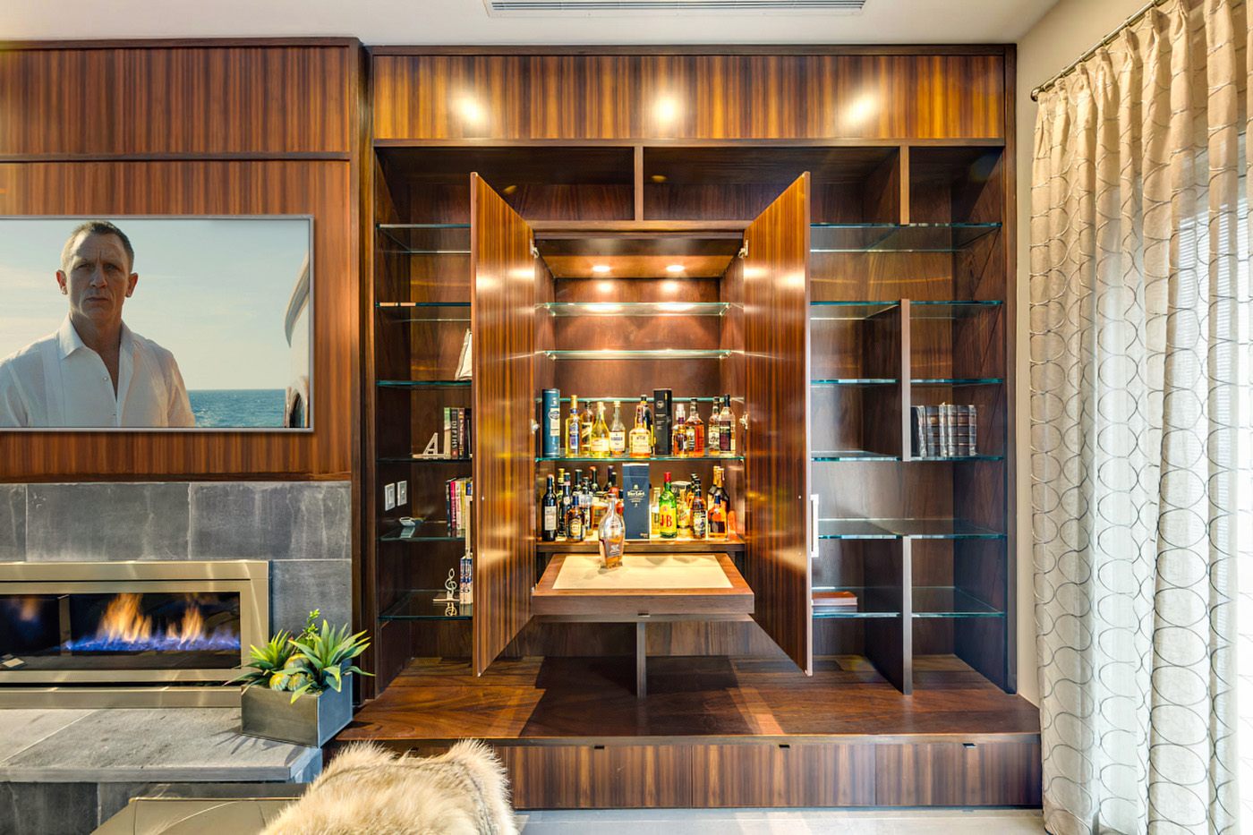This rich, contemporary, wall-to-wall and floor-to-ceiling Ribbon Mahogany Entertainment Unit encompasses the full length of the living room. The design accommodates a 60″ Stainless Steel Linear Gas Fireplace and provides open book and display areas with 3/4″ thick Starfire low iron glass shelving and an illuminated bar cabinet with a pull-out serving shelf.