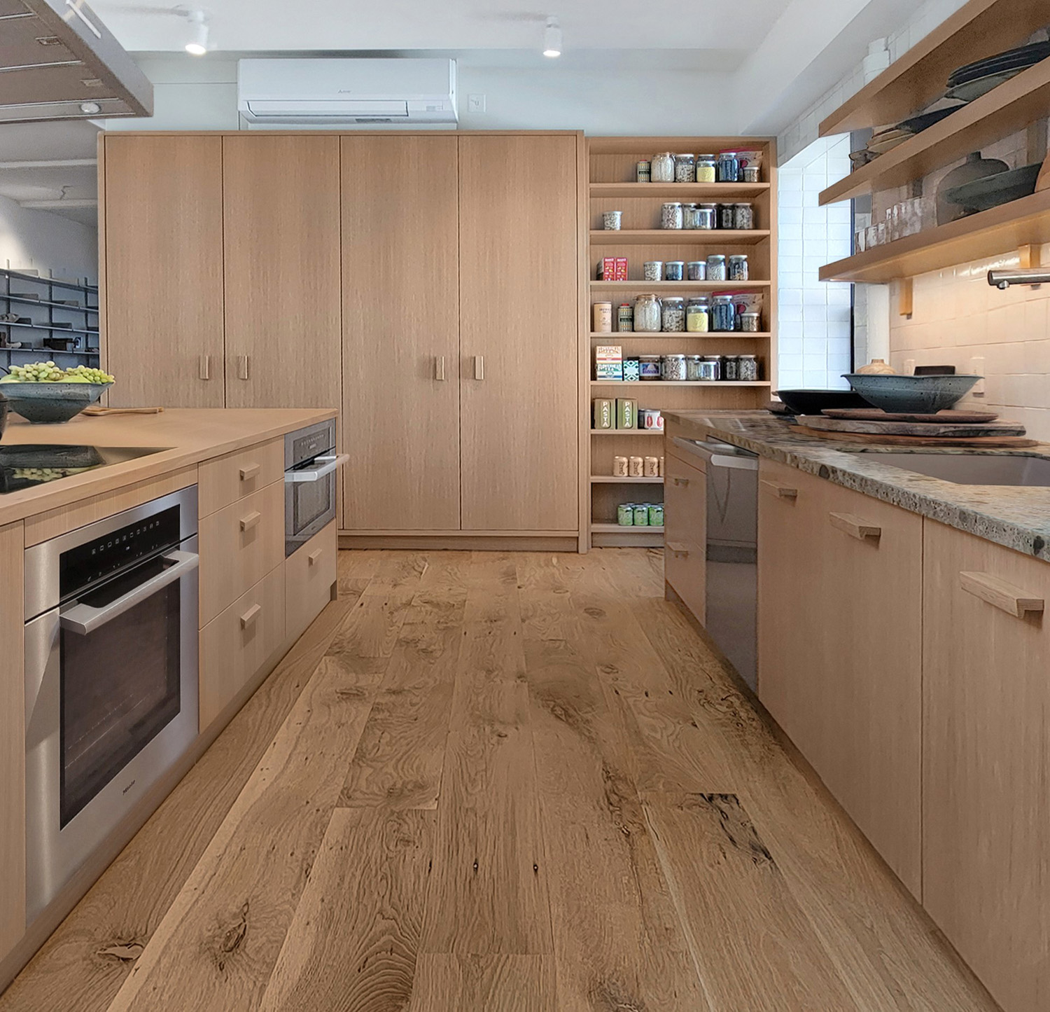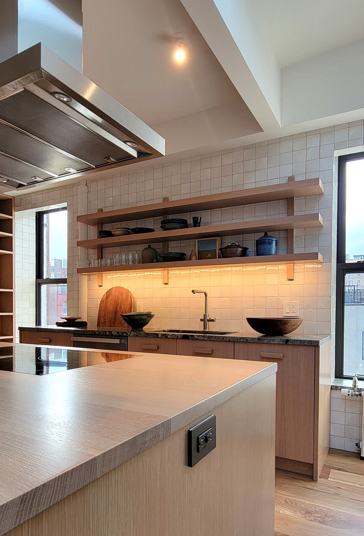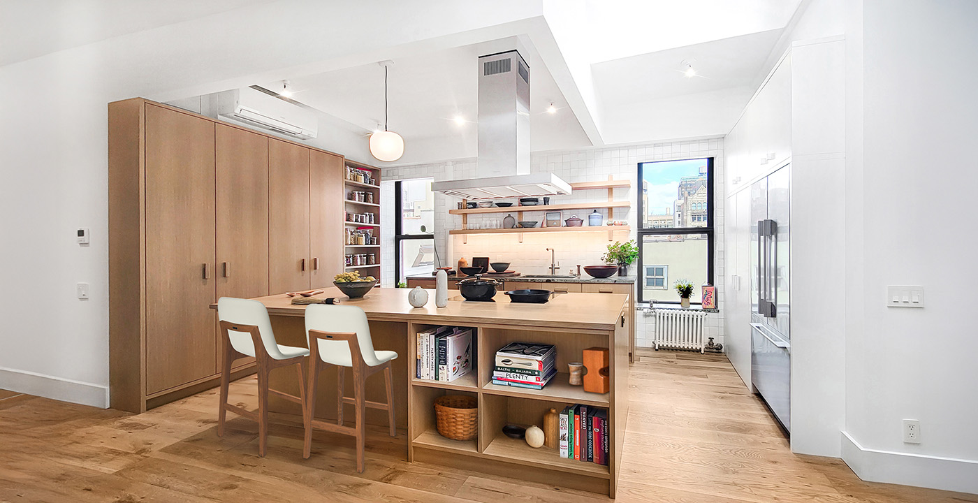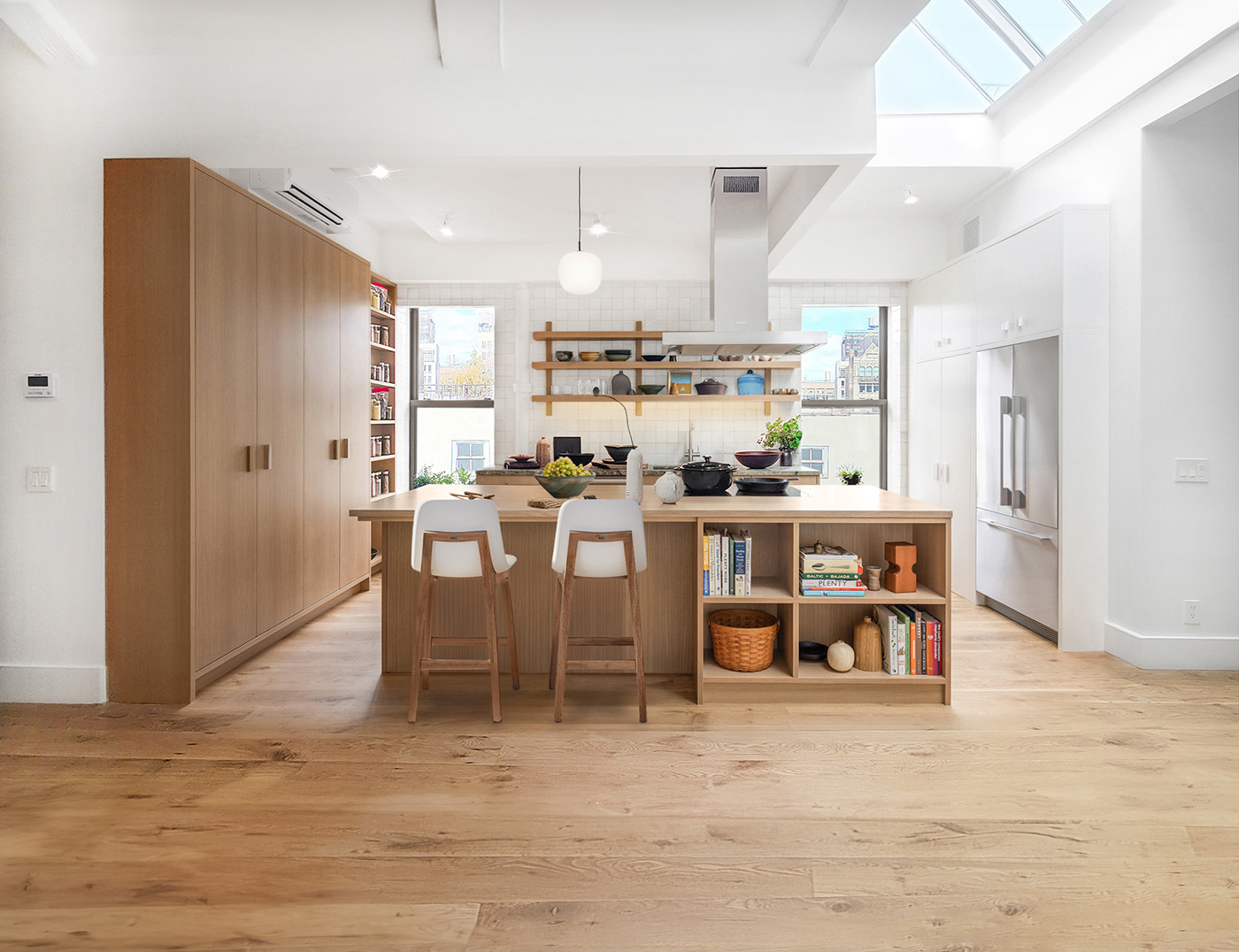 This White Oak Custom Kitchen in a loft on Great Jones Street has all the amenities such as a large pantry, hidden hot water, solid wood silverware, utility a knife drawer, an island with a Solid White Oak Plank Top and even a hidden hot water heater encloser concealed behinds lacquer doors with additional storage cabinetry above.