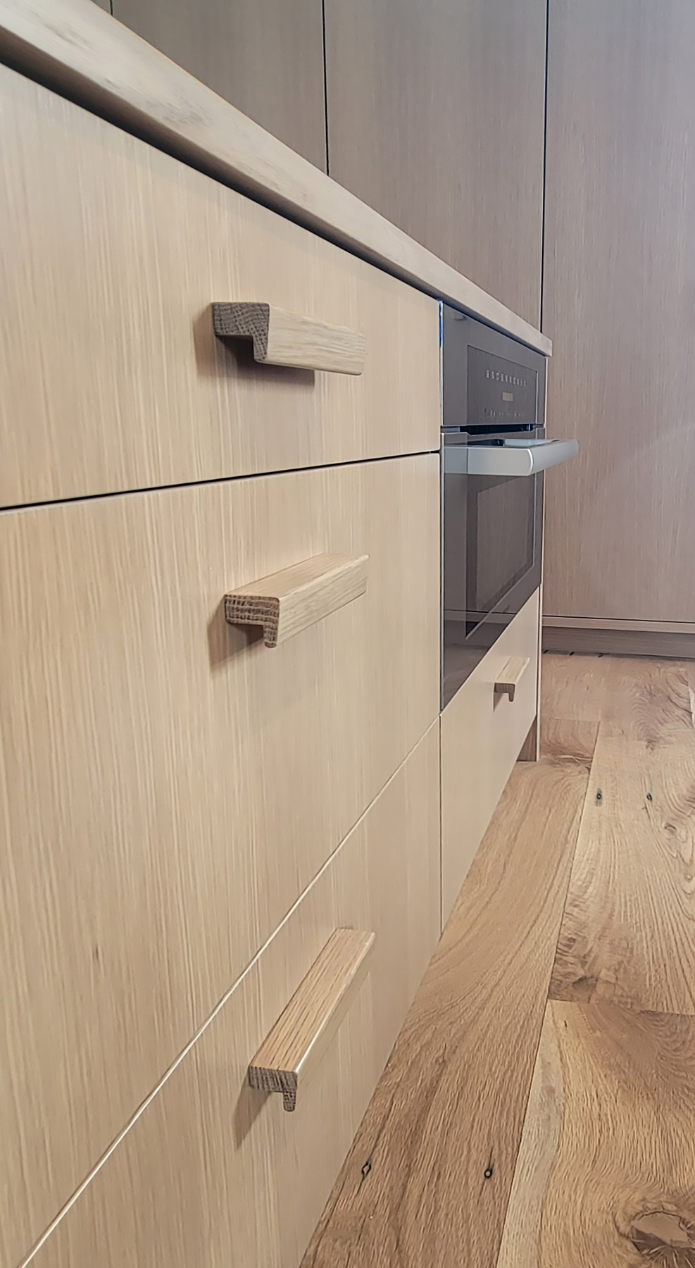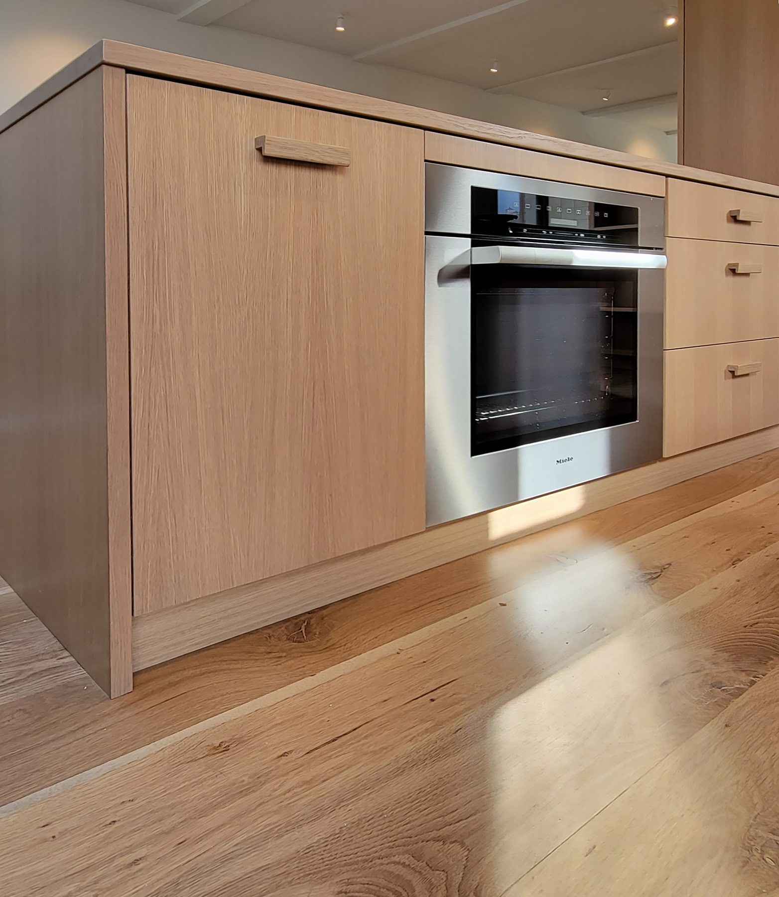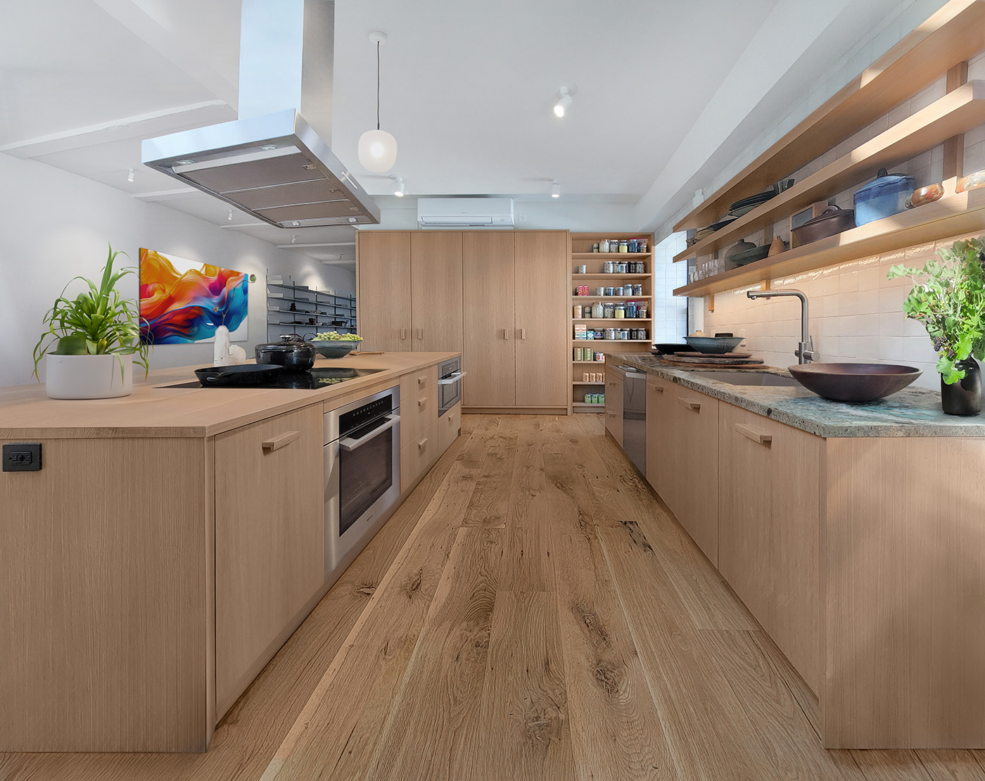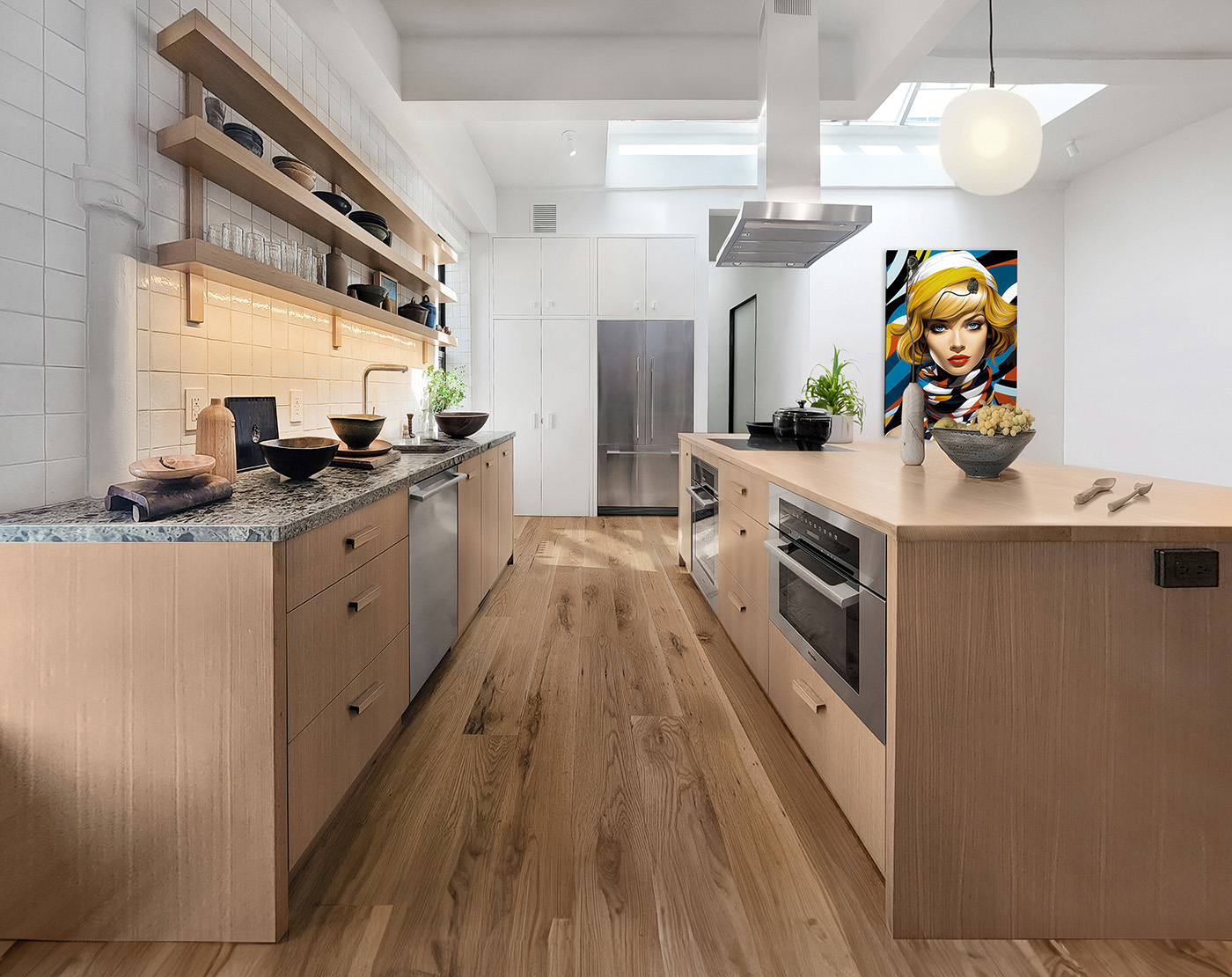 This White Oak Custom Kitchen in a loft on Great Jones Street has all the amenities such as a large pantry, hidden hot water, solid wood silverware, utility a knife drawer, an island with a Solid White Oak Plank Top and even a hidden hot water heater encloser concealed behinds lacquer doors with additional storage cabinetry above.