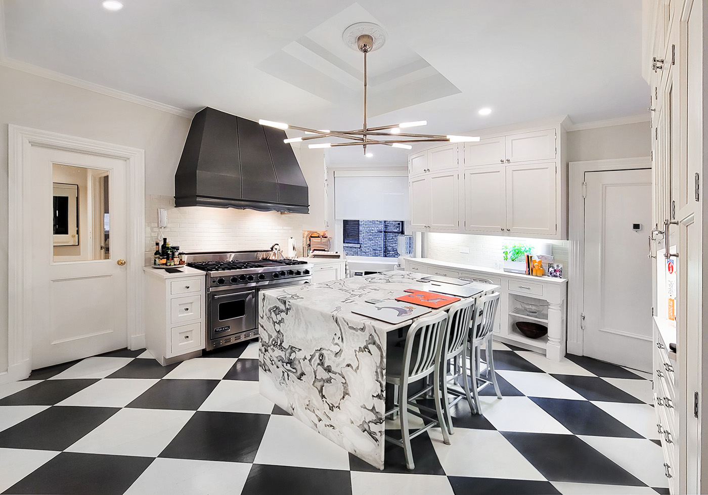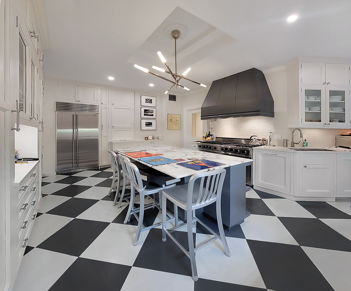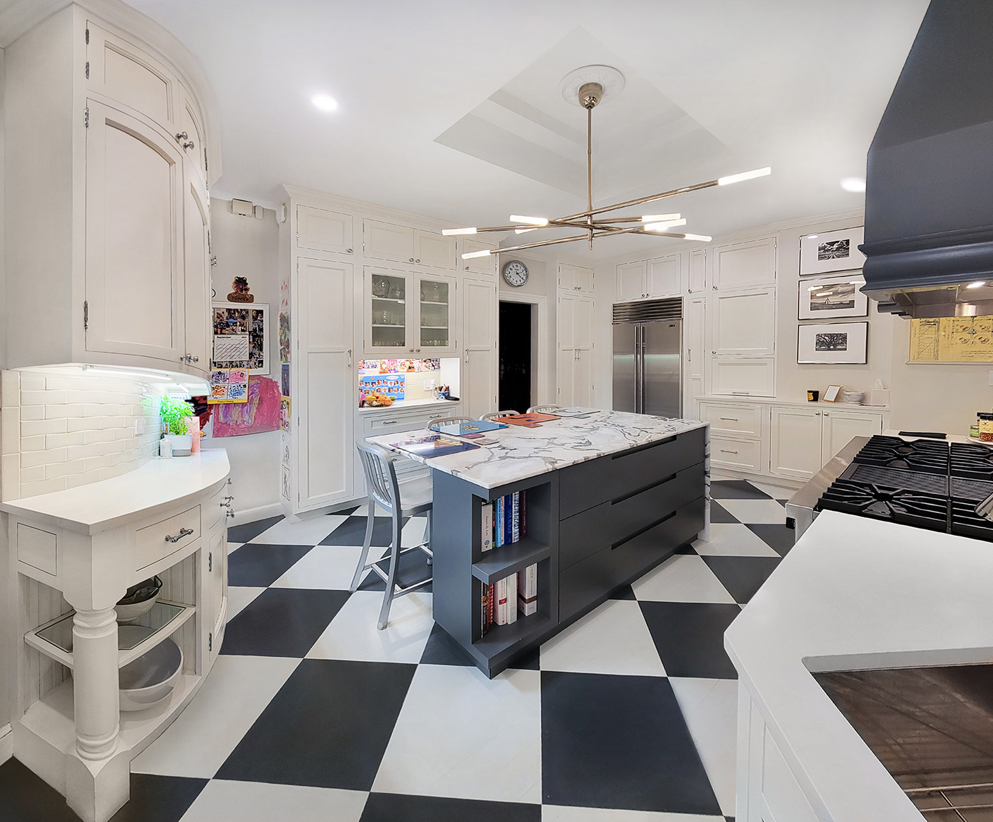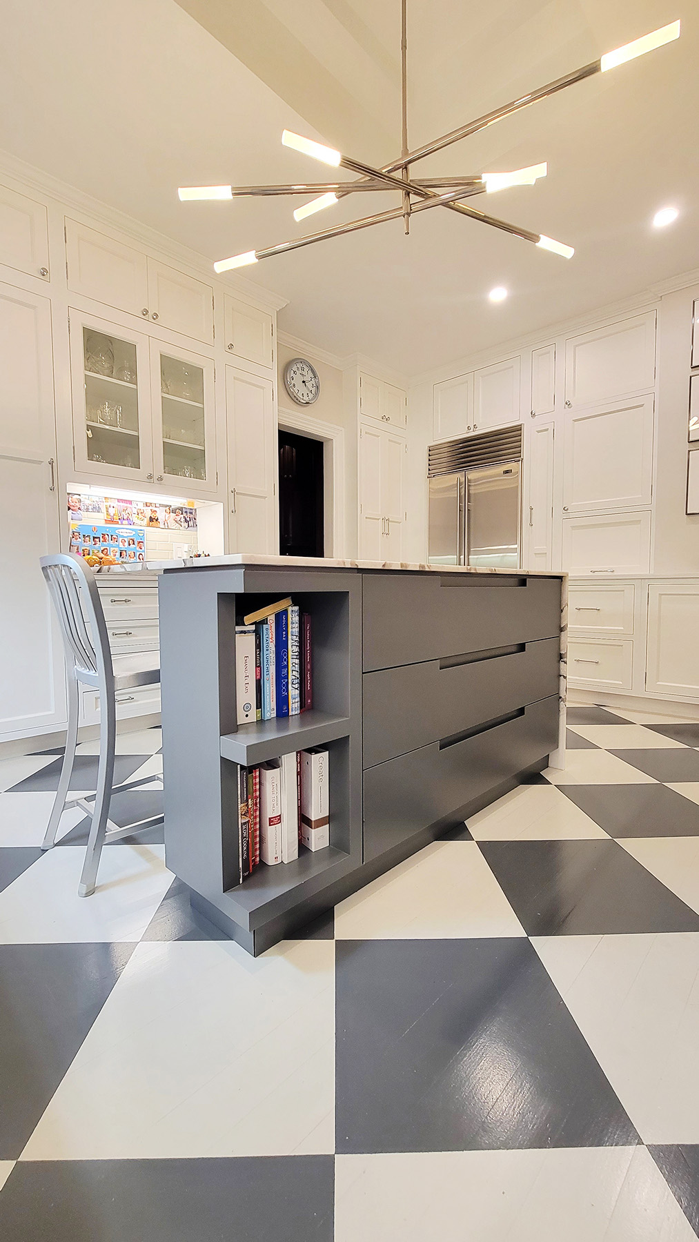 This Charming Traditional Kitchen with a checkerboard floor makes use of every inch of space with Face Framed White Lacquered Cabinetry that wraps around the room and a Center Island in Grey with oversized drawers and space for seating.  A Country Style Hood Enclosure in the same Grey Lacquer as the Island balances and completes the space.