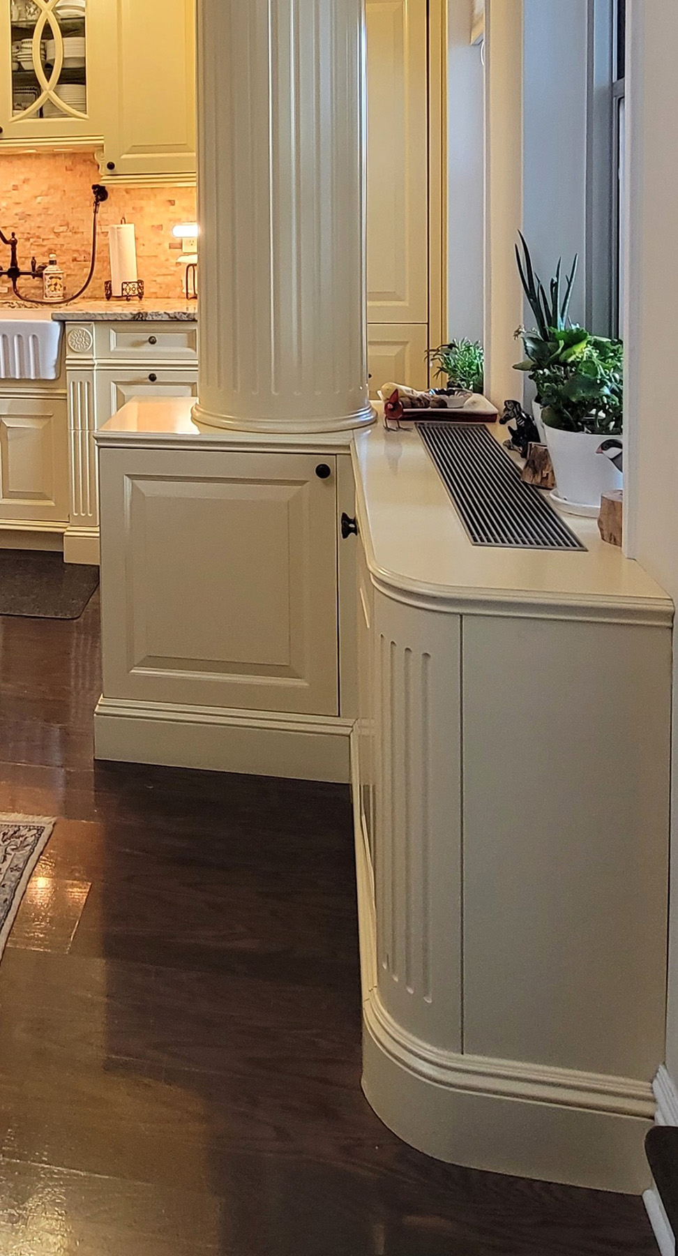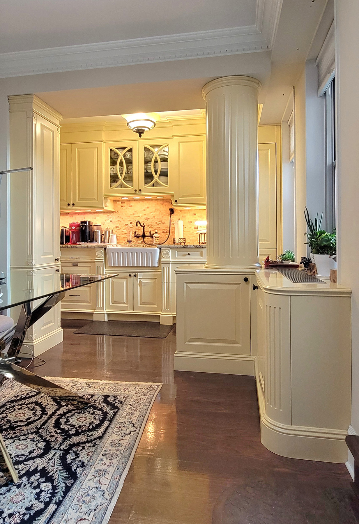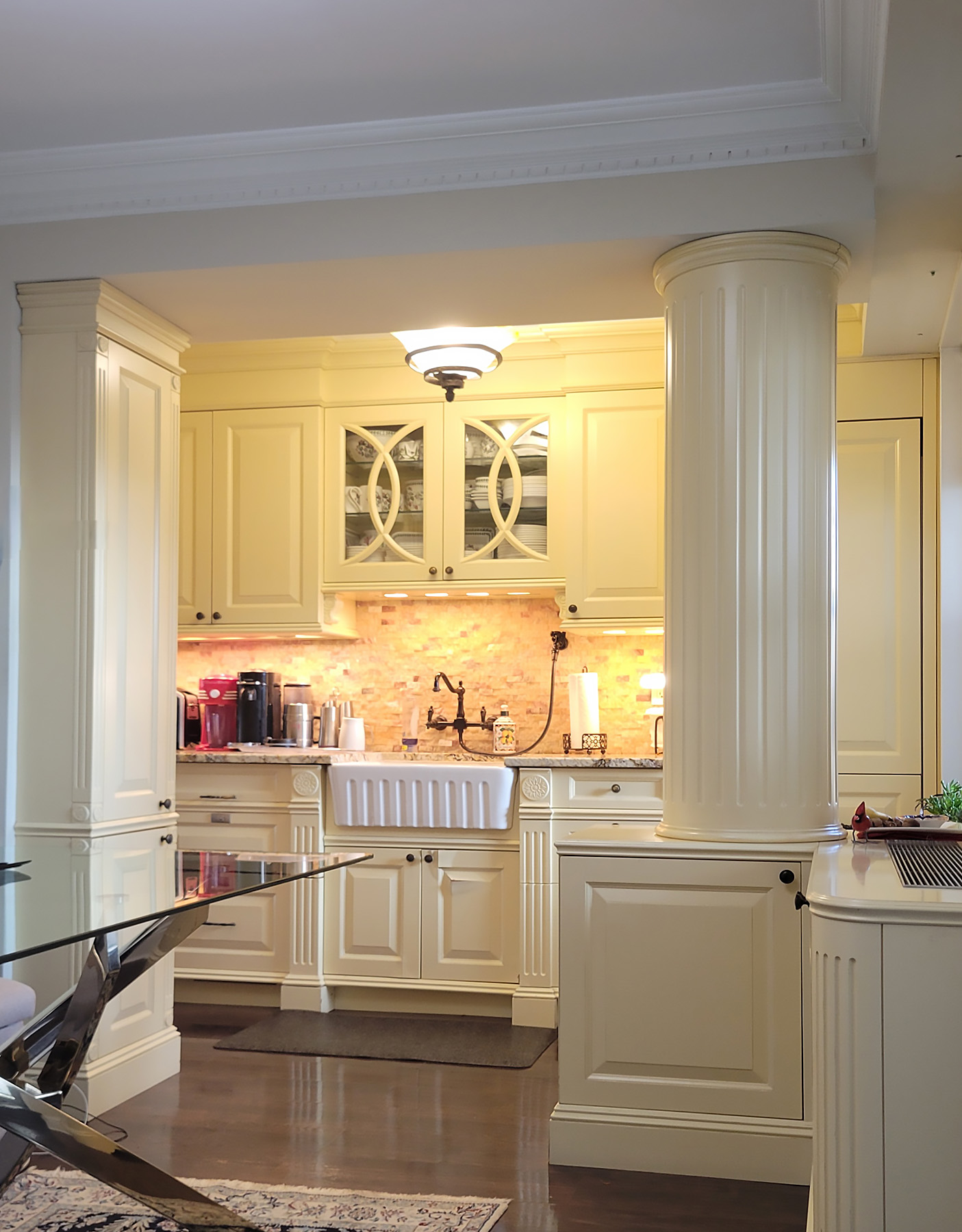 This Classic Country Style Kitchen features fluted pilasters with acanthus leaf medallions, raised panels, curved glass door mullions and a full fluted column that conceals mechanical ducting. Though this fine custom millwork was installed in NYC this classic kitchen would be just as at home in the country.