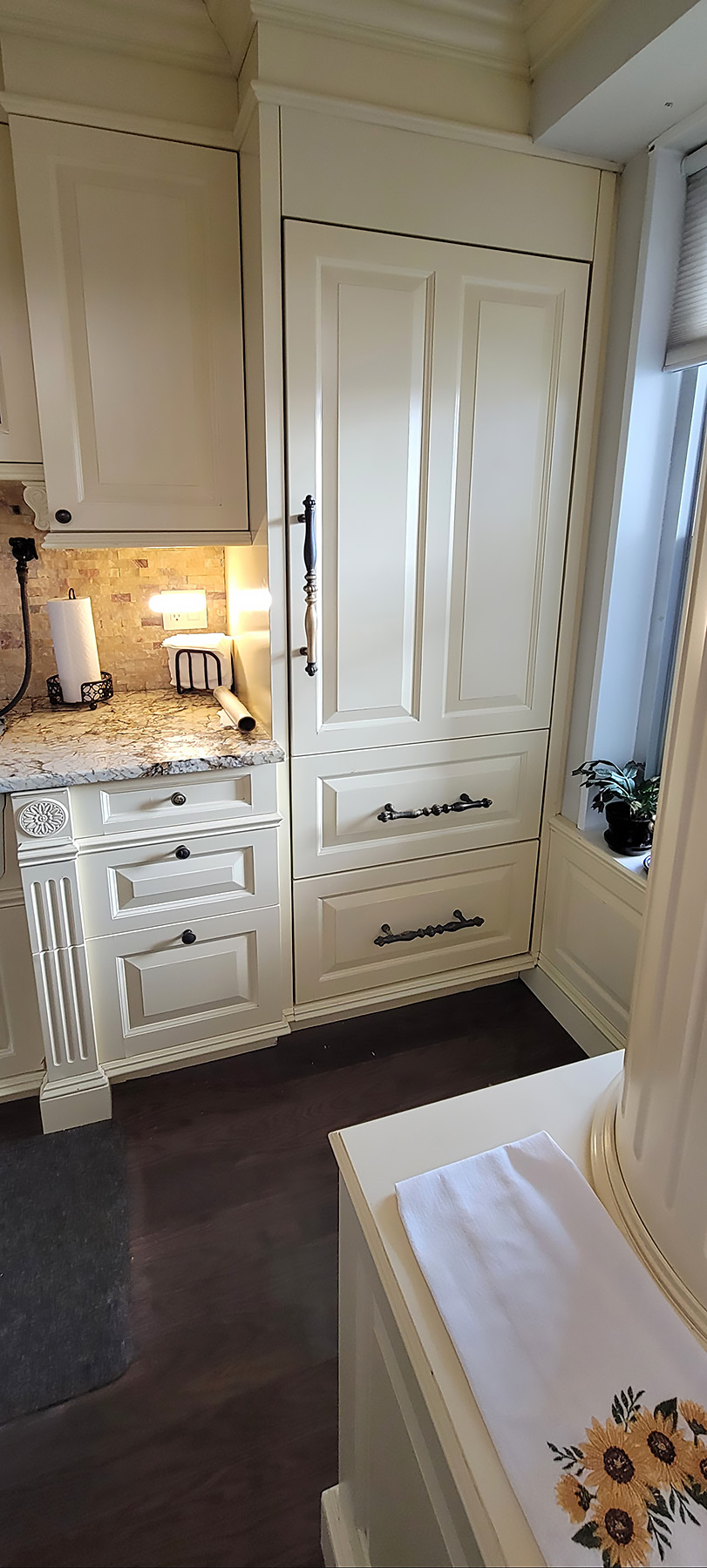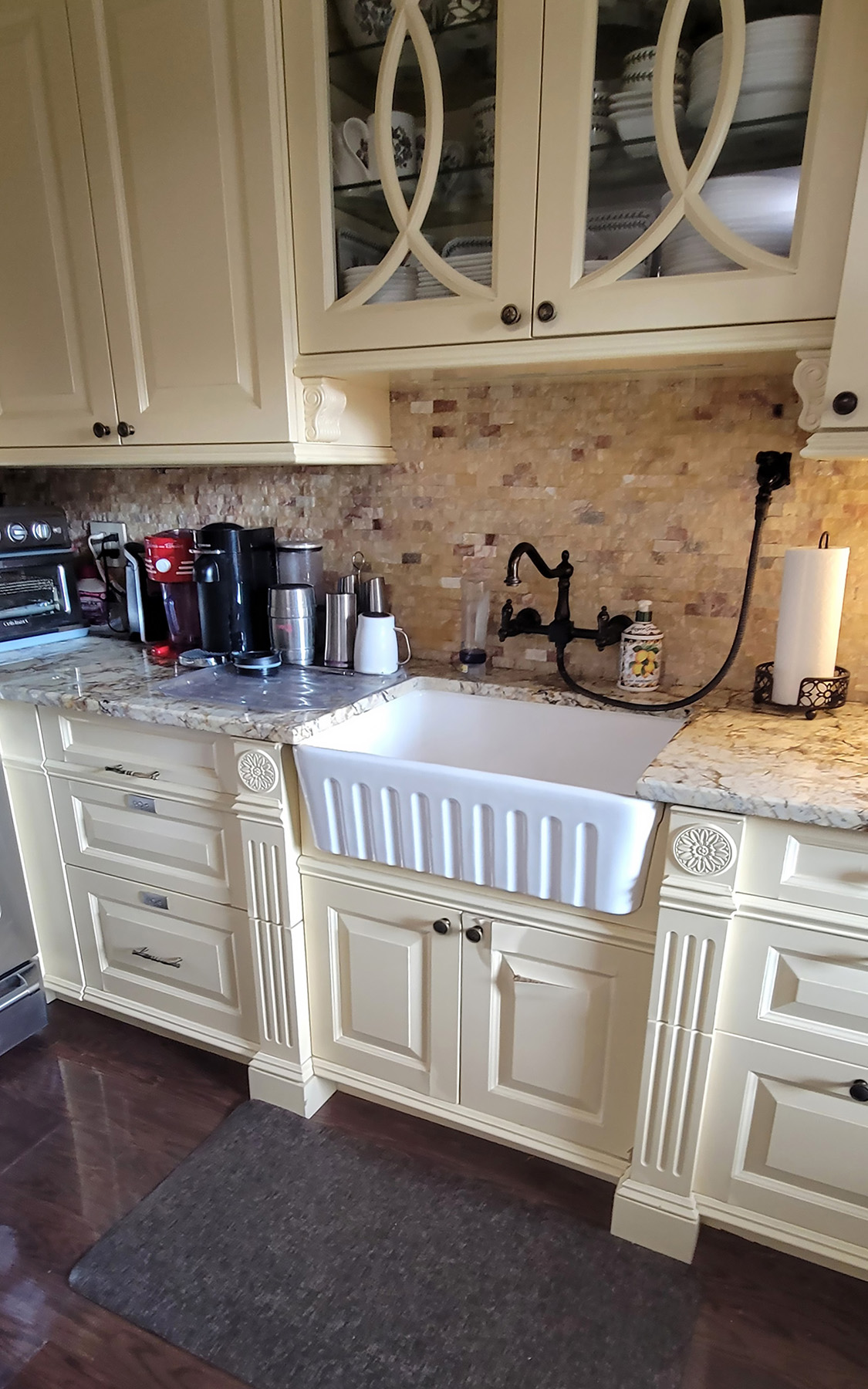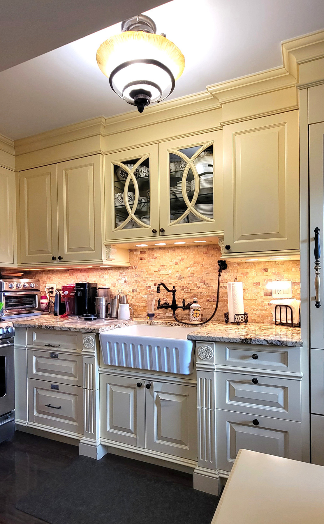 This Classic Country Style Kitchen features fluted pilasters with acanthus leaf medallions, raised panels, curved glass door mullions and a full fluted column that conceals mechanical ducting. Though this fine custom millwork was installed in NYC this classic kitchen would be just as at home in the country.