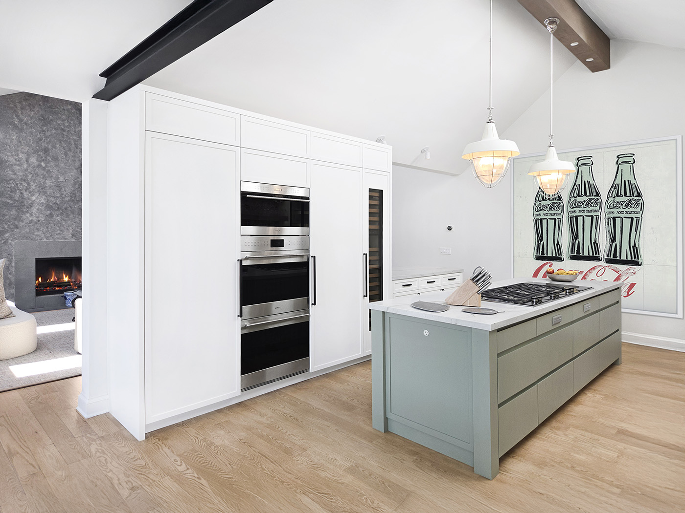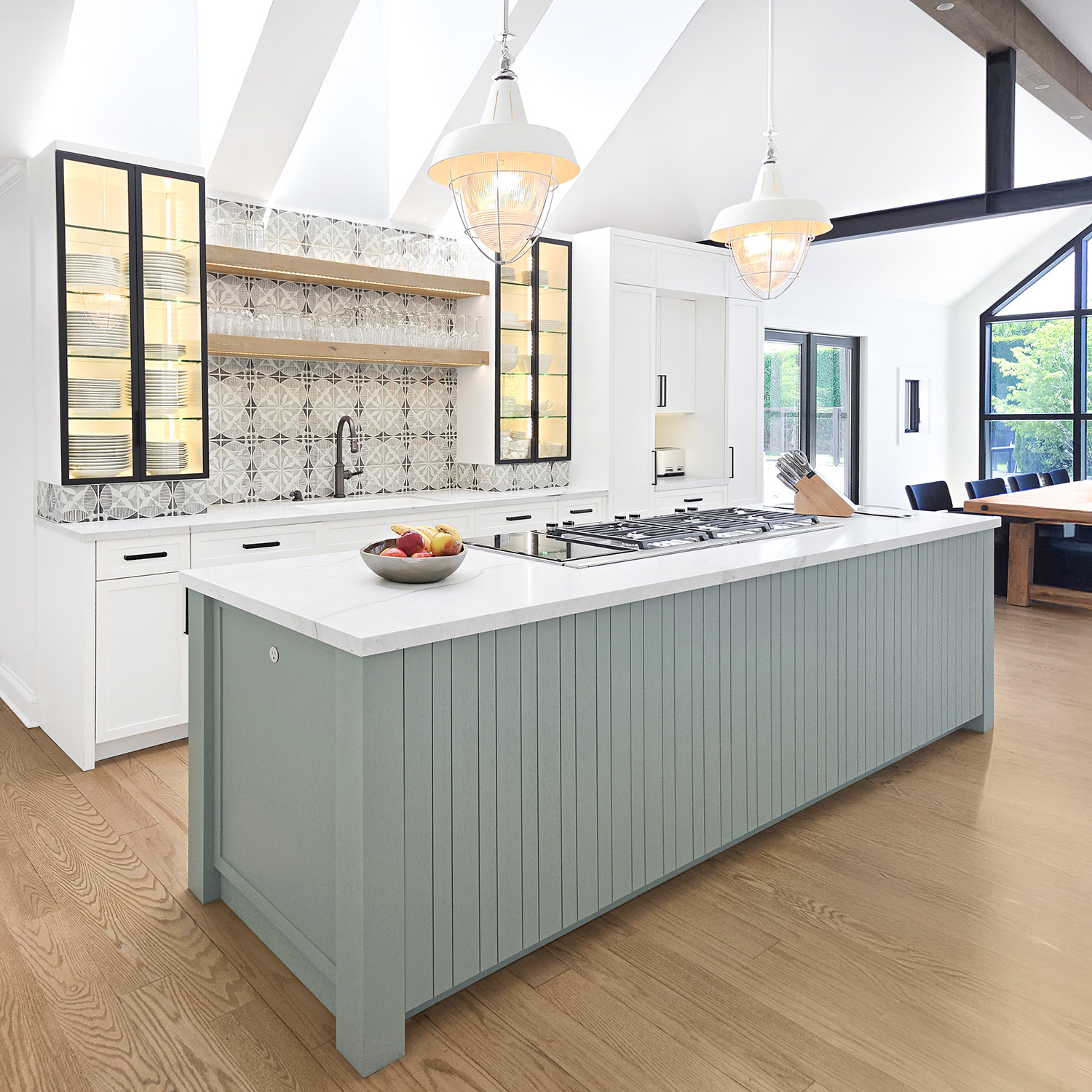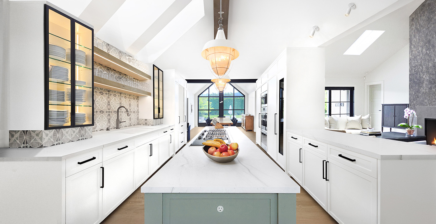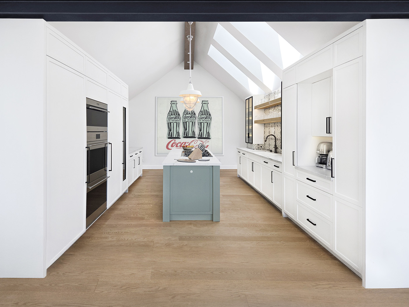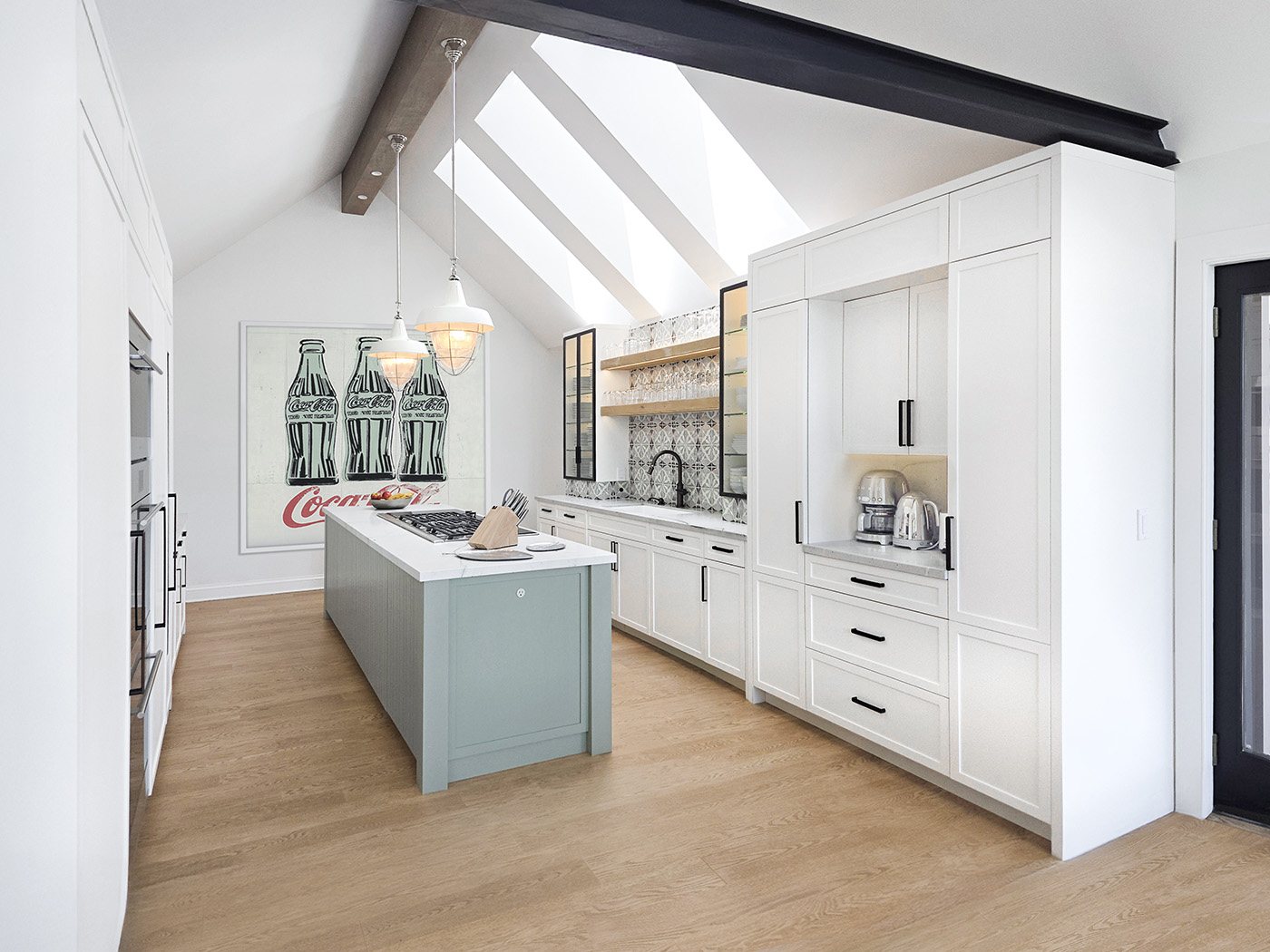 This bright and inviting Hamptons kitchen illustrates how stunning custom millwork can integrate seamlessly with both connecting interior spaces and the surrounding outdoor views.