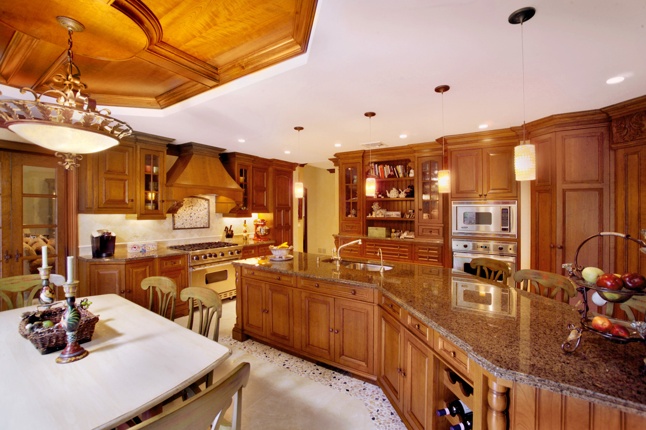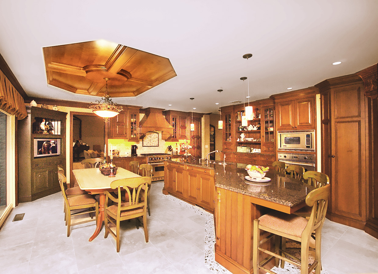 Country Traditional Style Kitchen with coffered inset ceiling design above the breakfast table, and artfully antiqued corner TV cabinet.
