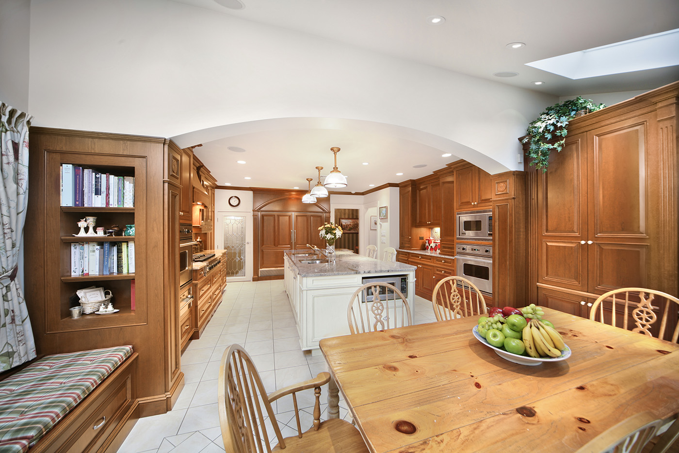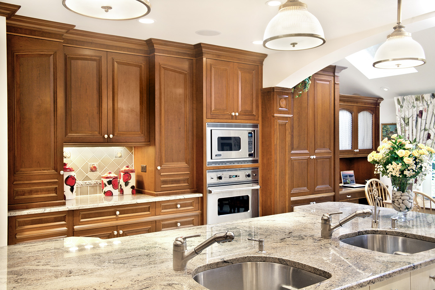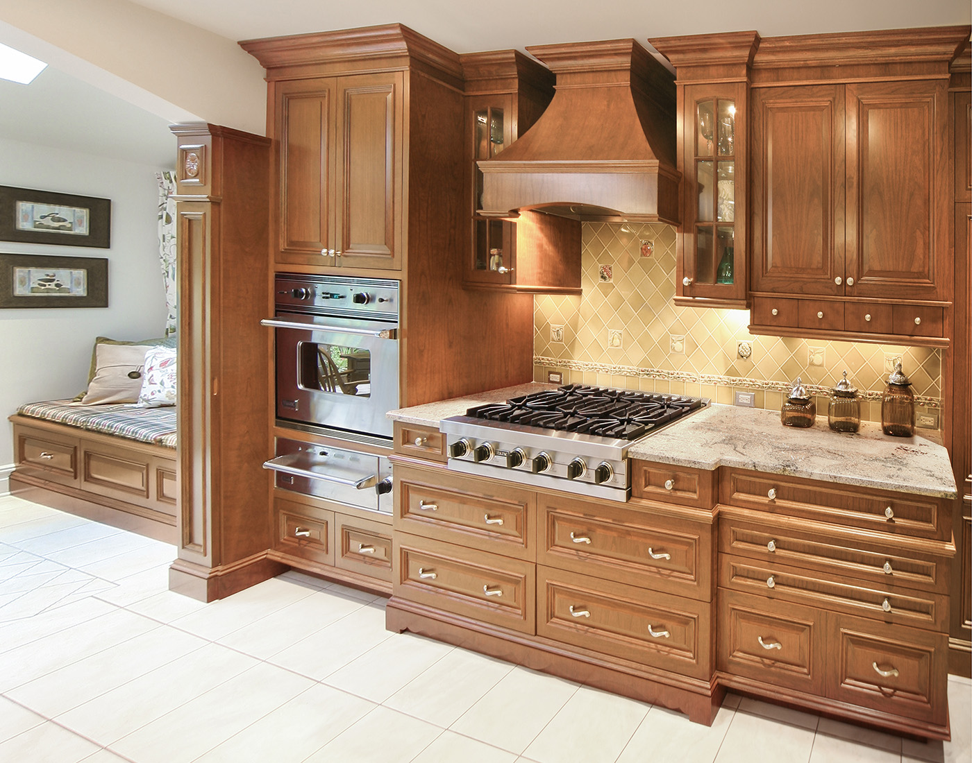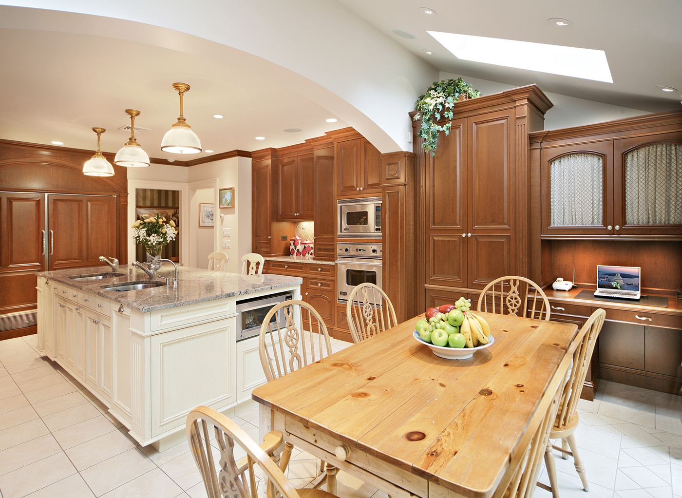 Warm Cherry Wood Kitchen with exquisite traditional detailing with center island in antique finish and family friendly breakfast area with desk and comfortable storage banquet.