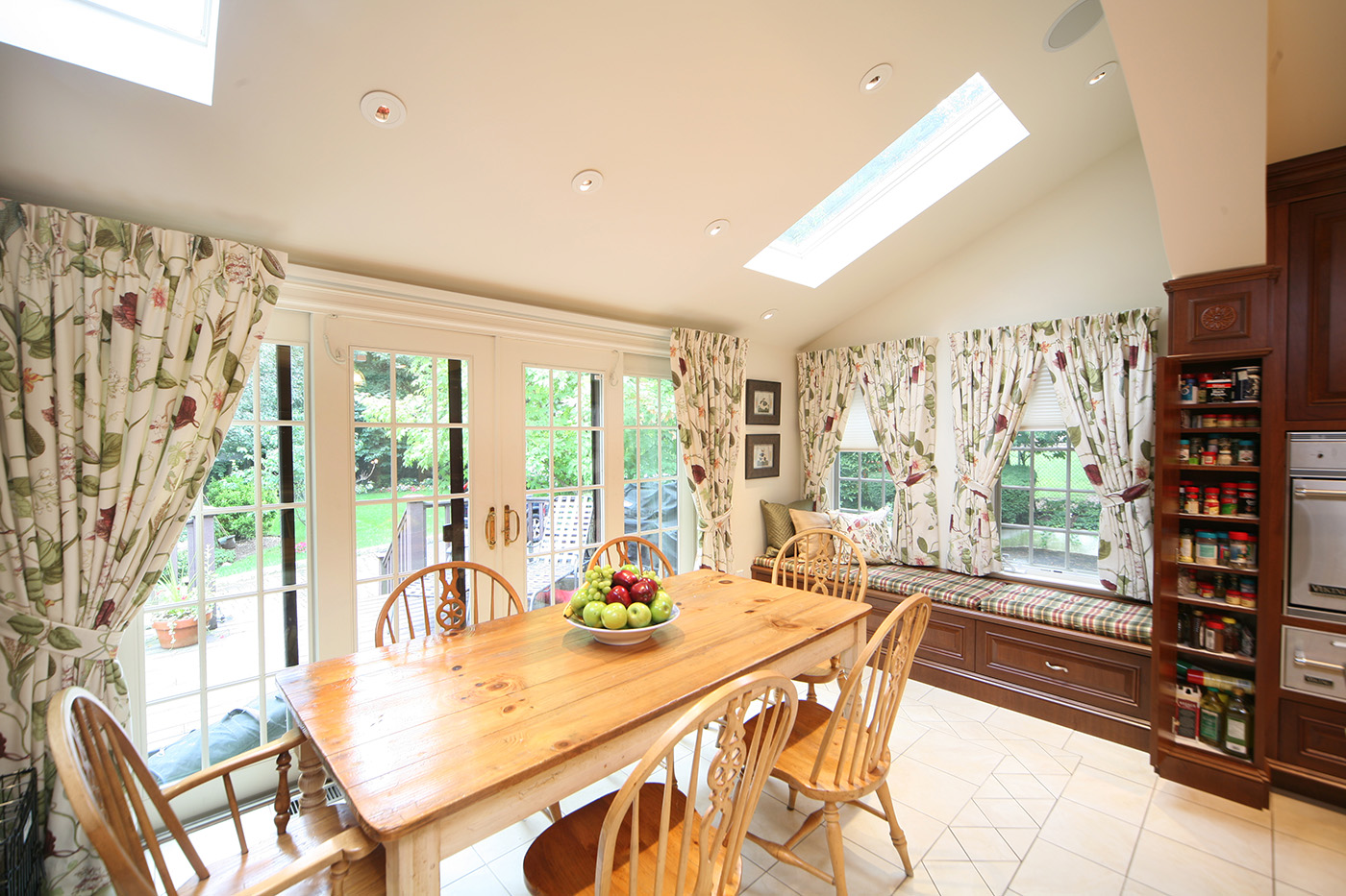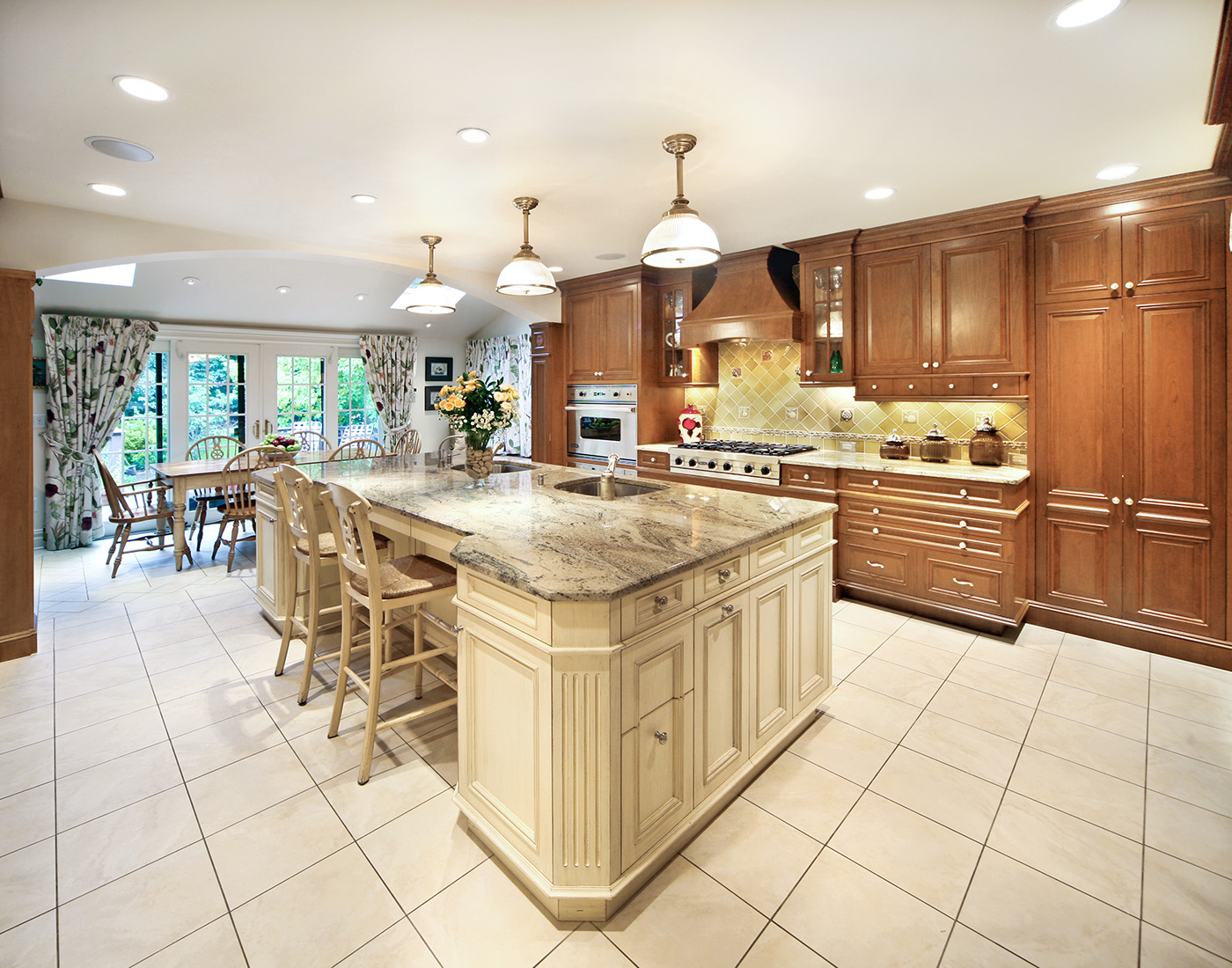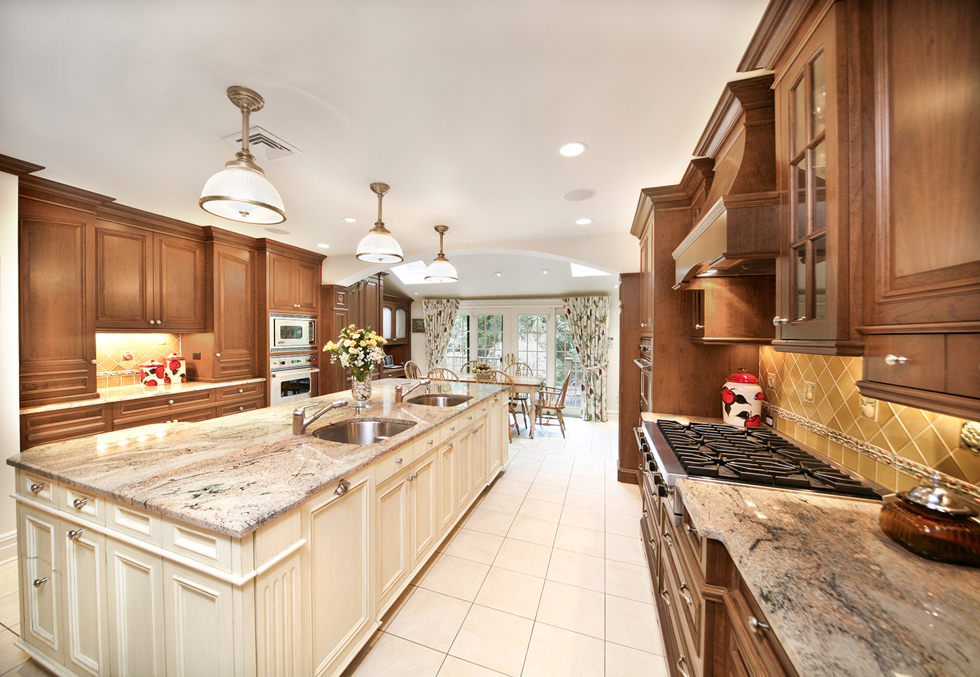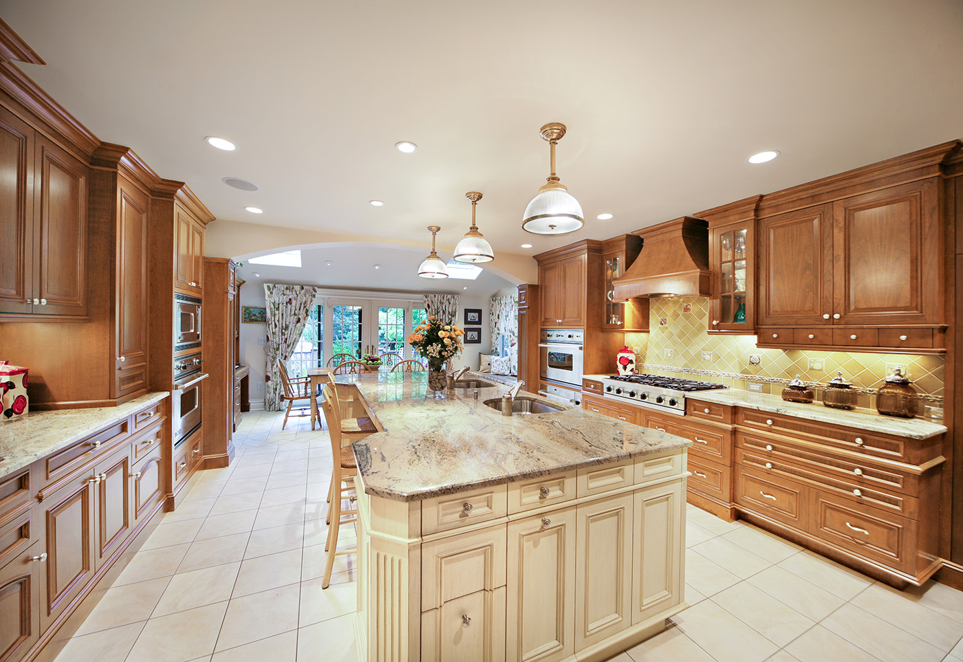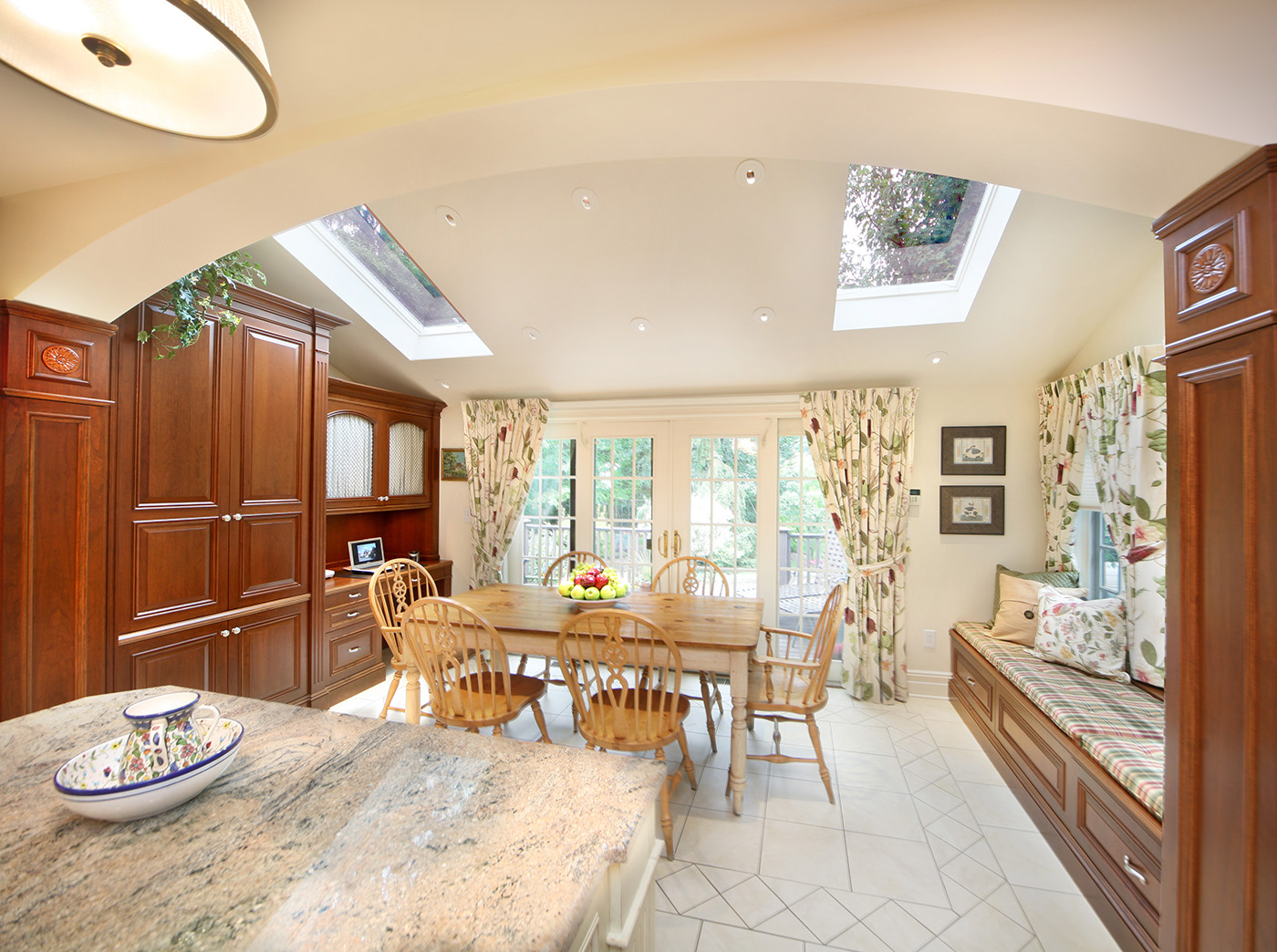 Warm Cherry Wood Kitchen with exquisite traditional detailing with center island in antique finish and family friendly breakfast area with desk and comfortable storage banquet.