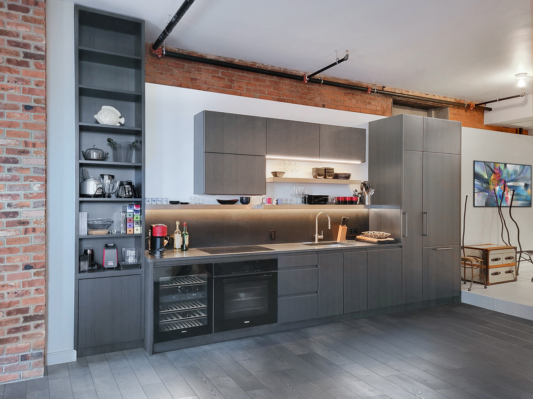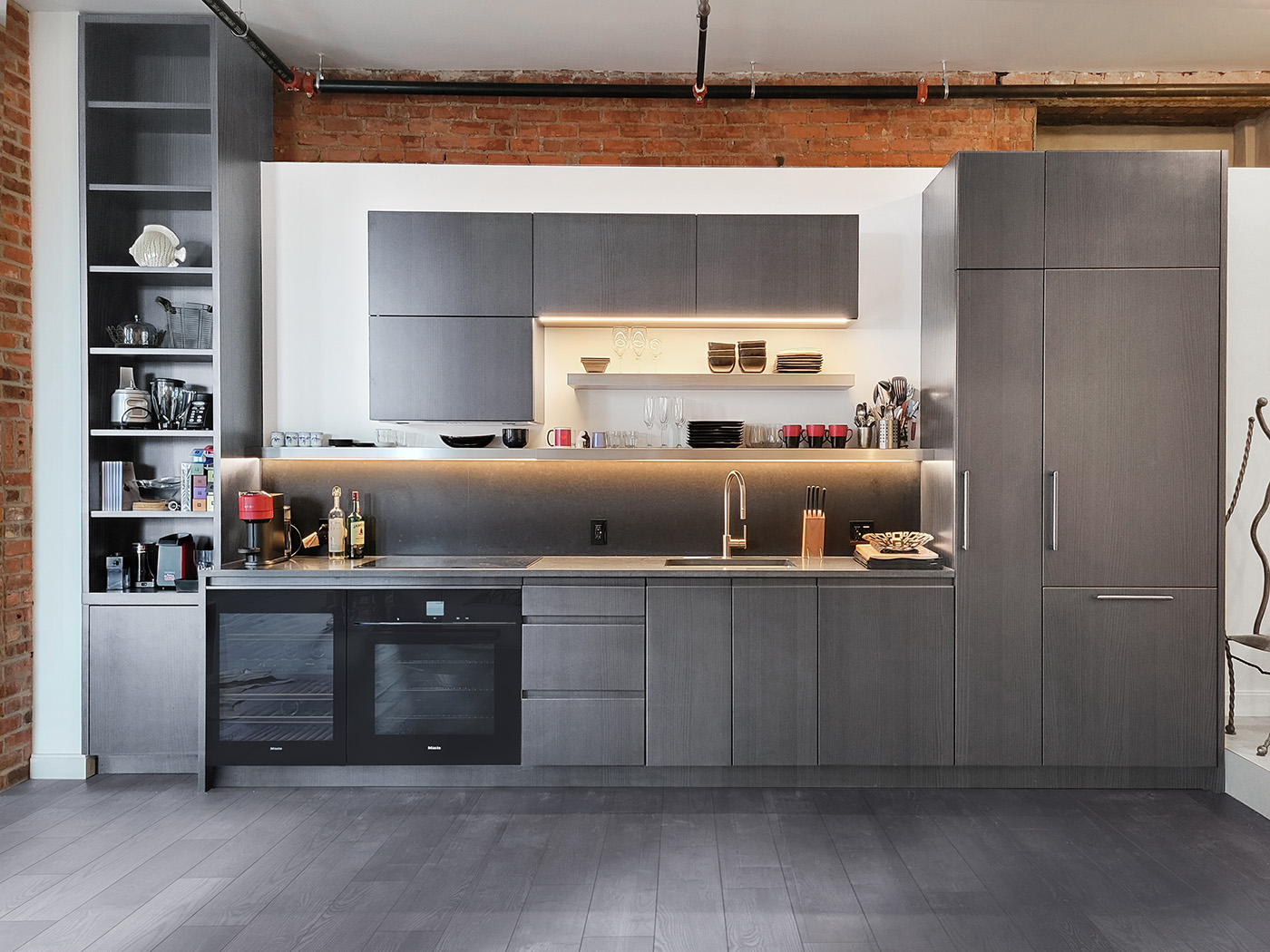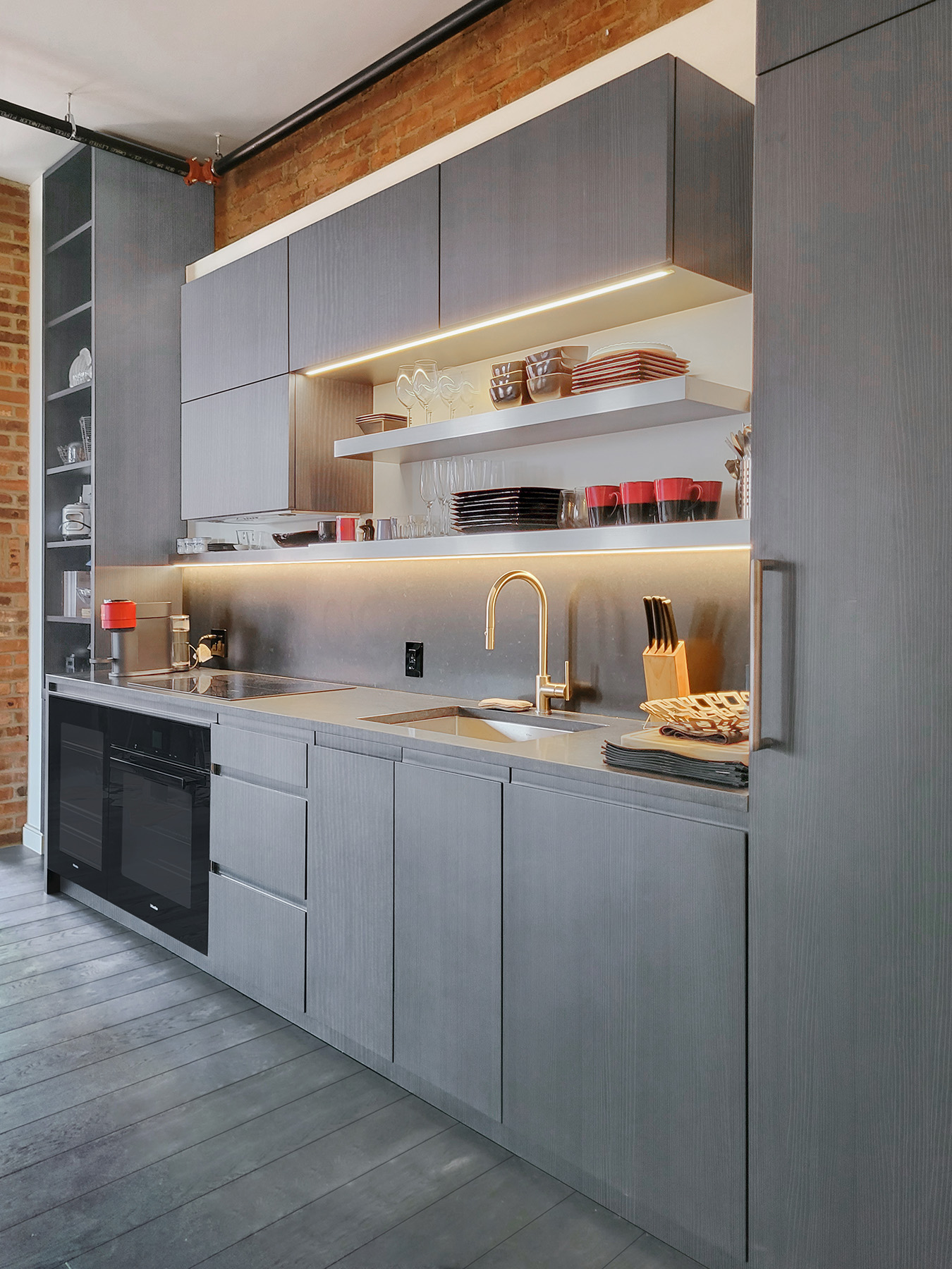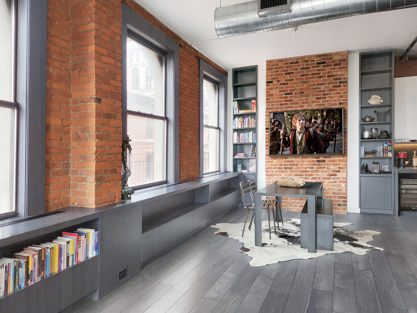 Juxtaposition of Geometric Shapes and a Grey Lacquer Finish to blend with the wide plank wood floor define this small but effective Tribeca Studio Kitchen that also acts as a design focal point for the apartment. Complimenting the kitchen cabinetry are tall bookcases that flank the fireplace and window cabinetry that provide an impressive stretch of open bookshelves with long removable panels beneath that conceal the wall-to-wall radiators.