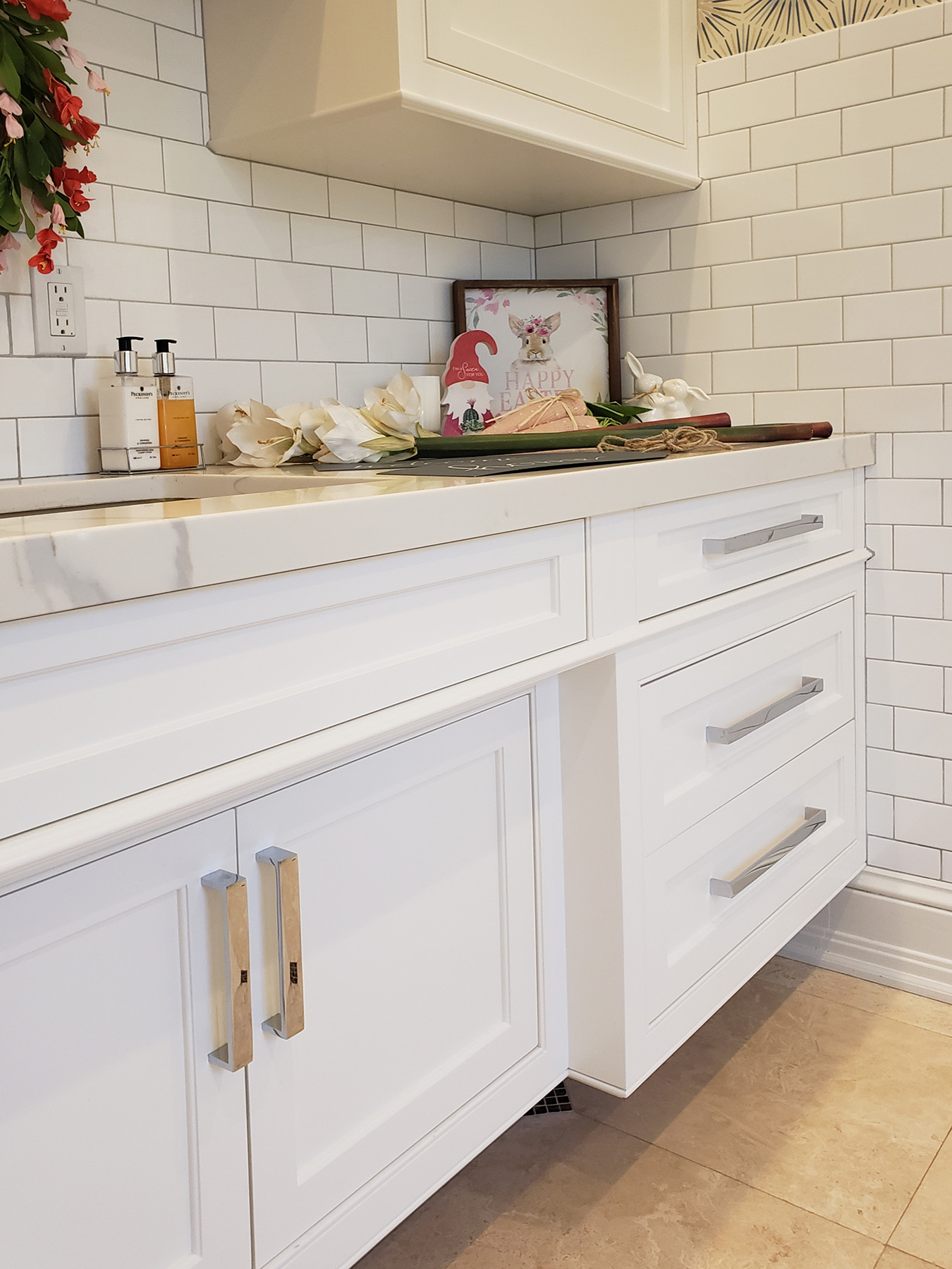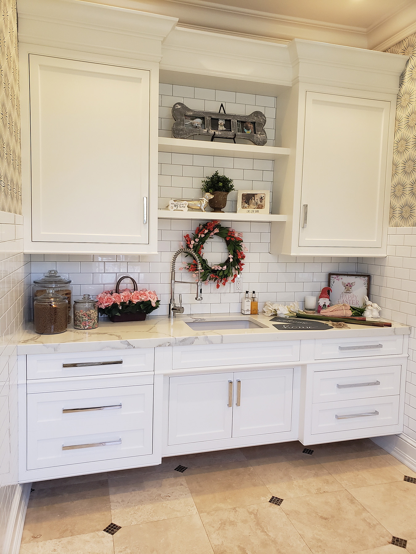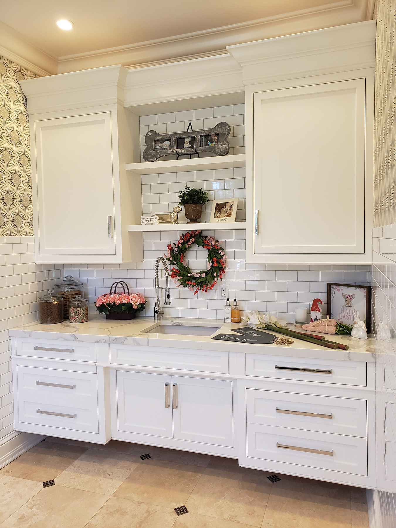 This Fine Traditional Custom Millwork provides needed utility in a part of this home that is a bit farther away from the main kitchen for convenience. To avoid a heavy or boxy appearance the base cabinetry is floating and the sink doors are ergonomically recessed inward for confront. An added useful feature of this Traditional Auxiliary Pantry is a double dog food pull-out dog food unit for the clients’ prize Labradors.