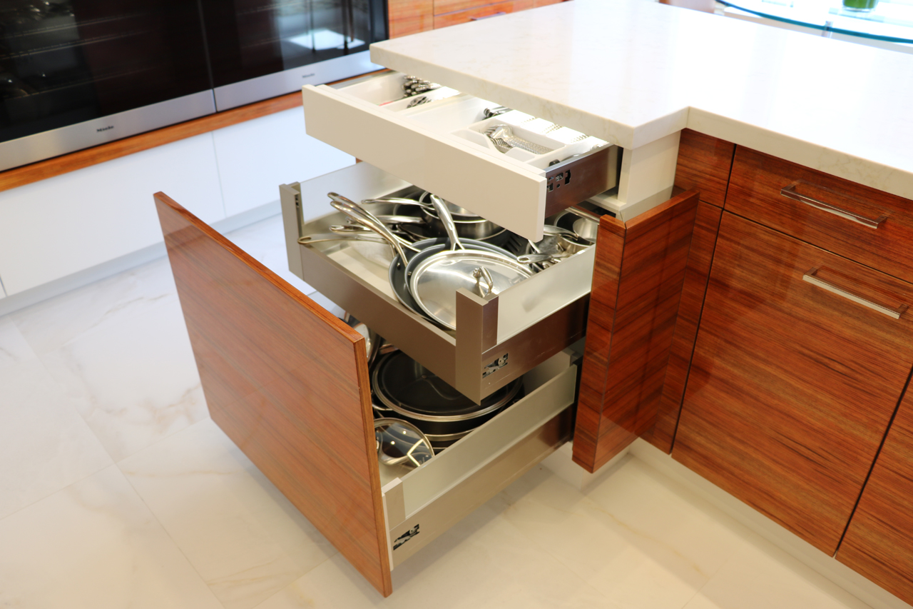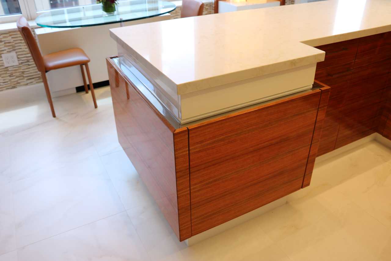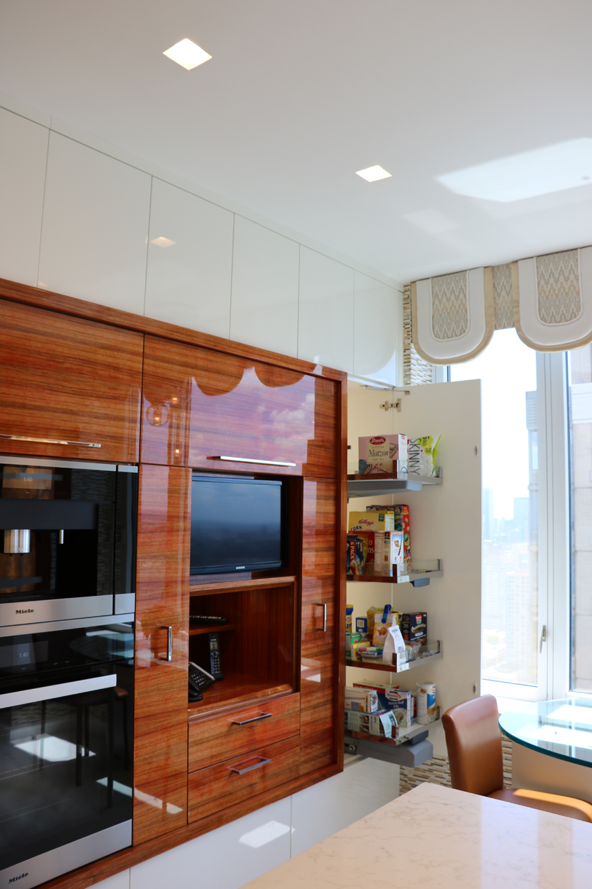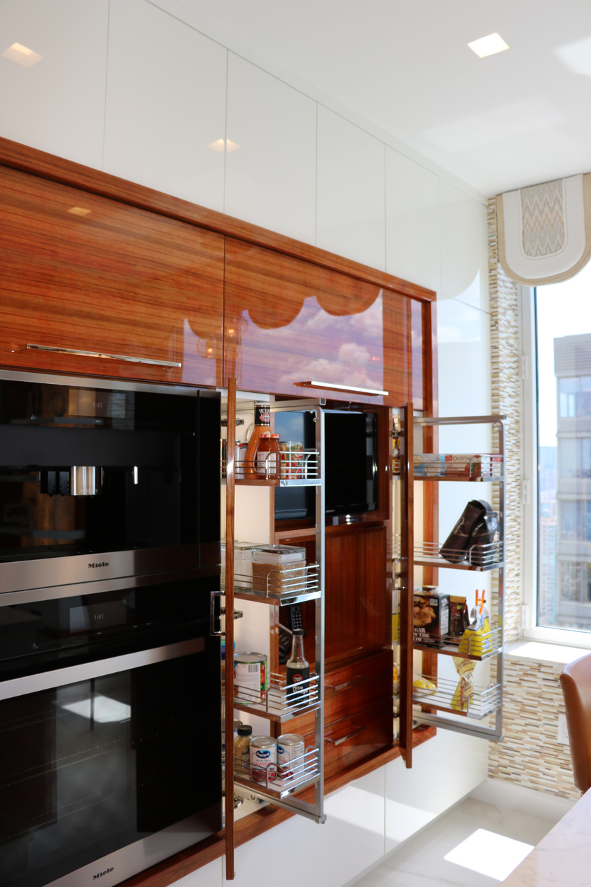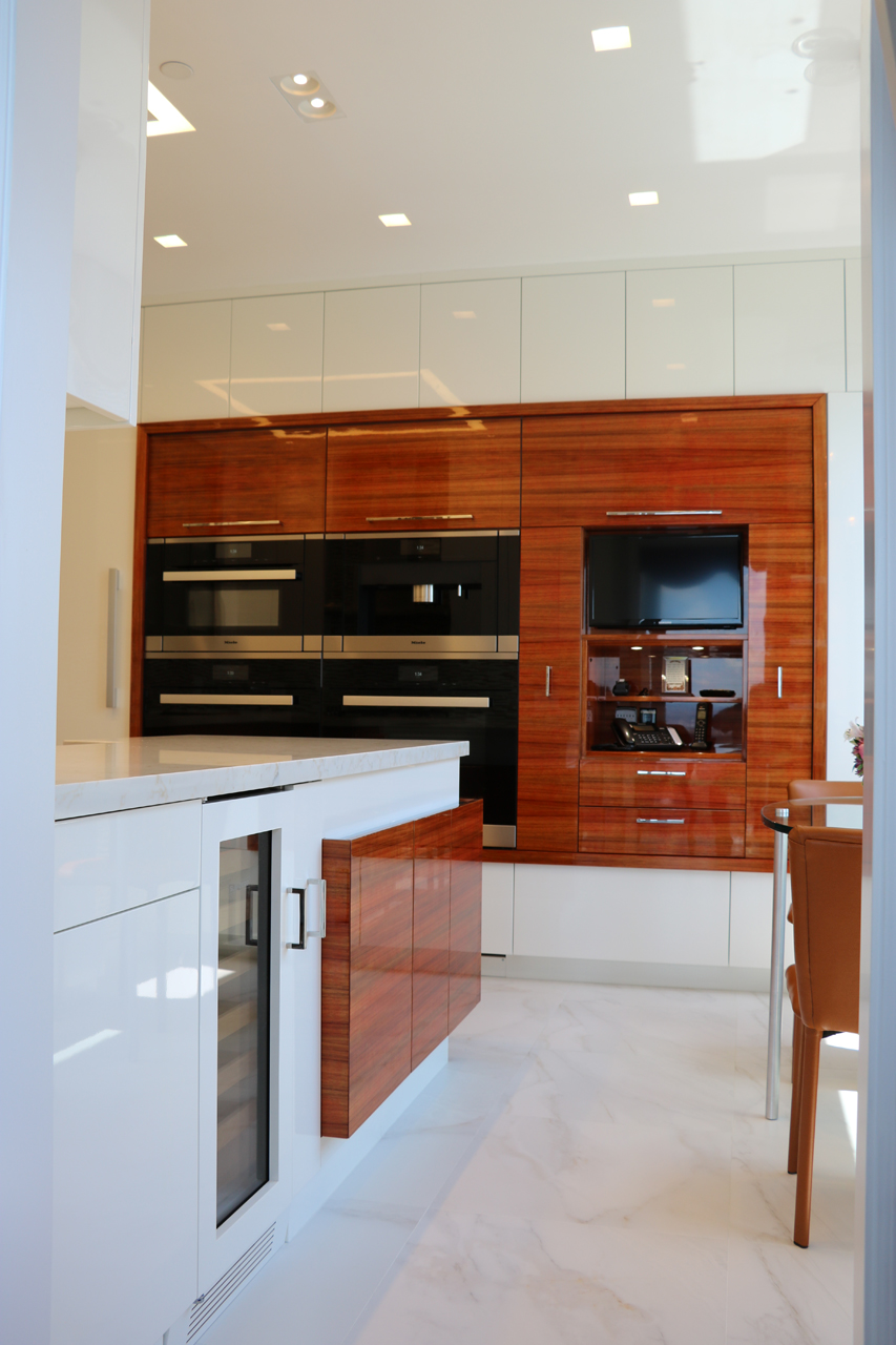 This modern kitchen design offers the perfect balance of beauty and function. Exotic Koa wood, white lacquer, stainless steel accents and an illuminated 3-Form corner panel create a bright and inviting space, while the finest Hafele pull out pantry mechanisms and automatic drawer and cabinet interior LED lighting systems ensure the maximal use of this space.