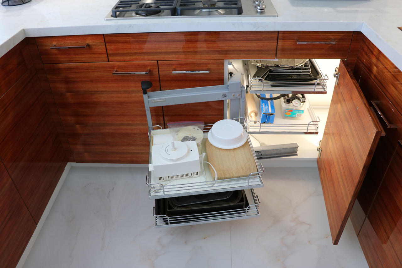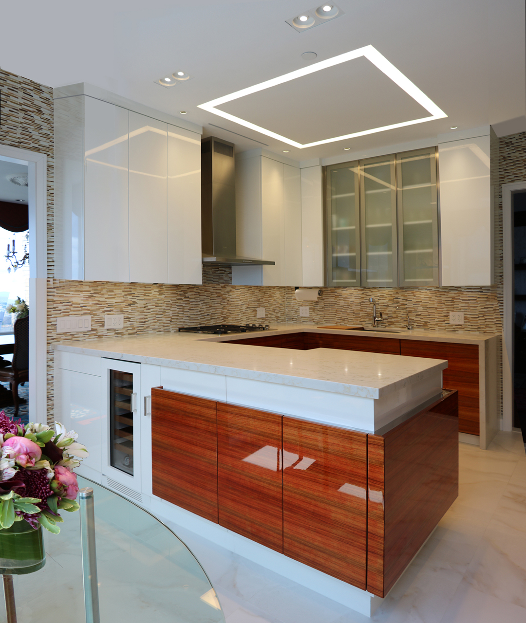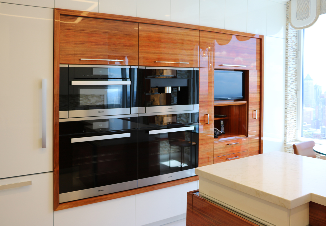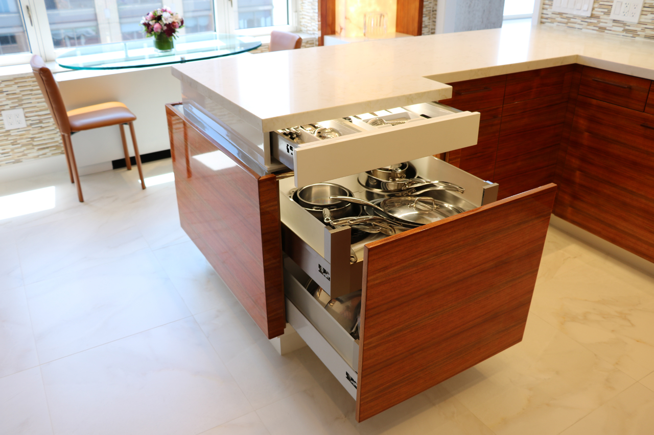 This modern kitchen design offers the perfect balance of beauty and function. Exotic Koa wood, white lacquer, stainless steel accents and an illuminated 3-Form corner panel create a bright and inviting space, while the finest Hafele pull out pantry mechanisms and automatic drawer and cabinet interior LED lighting systems ensure the maximal use of this space.