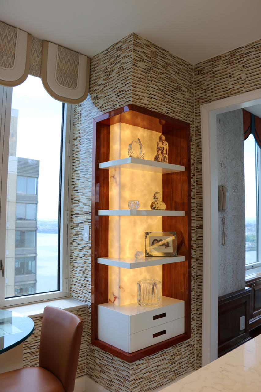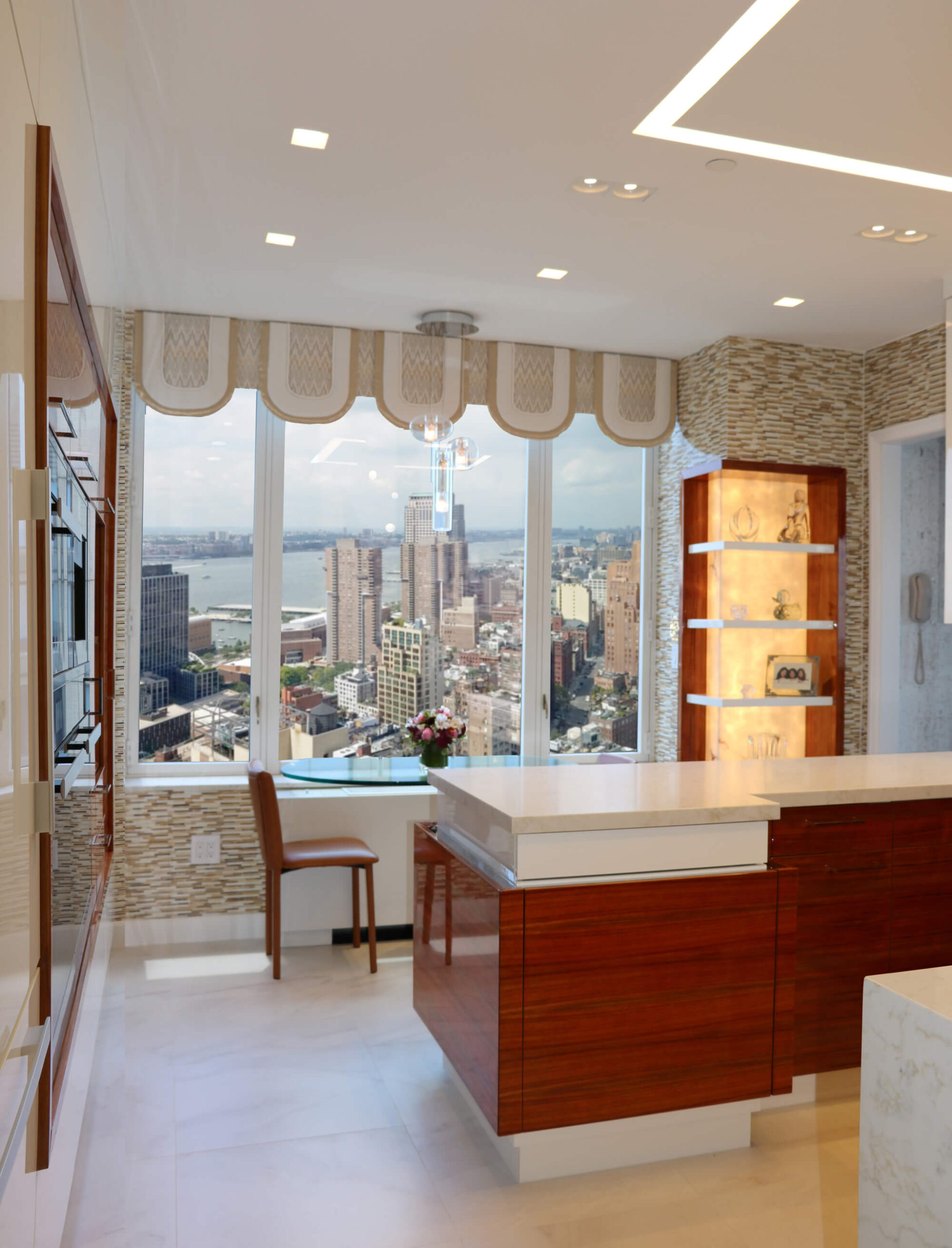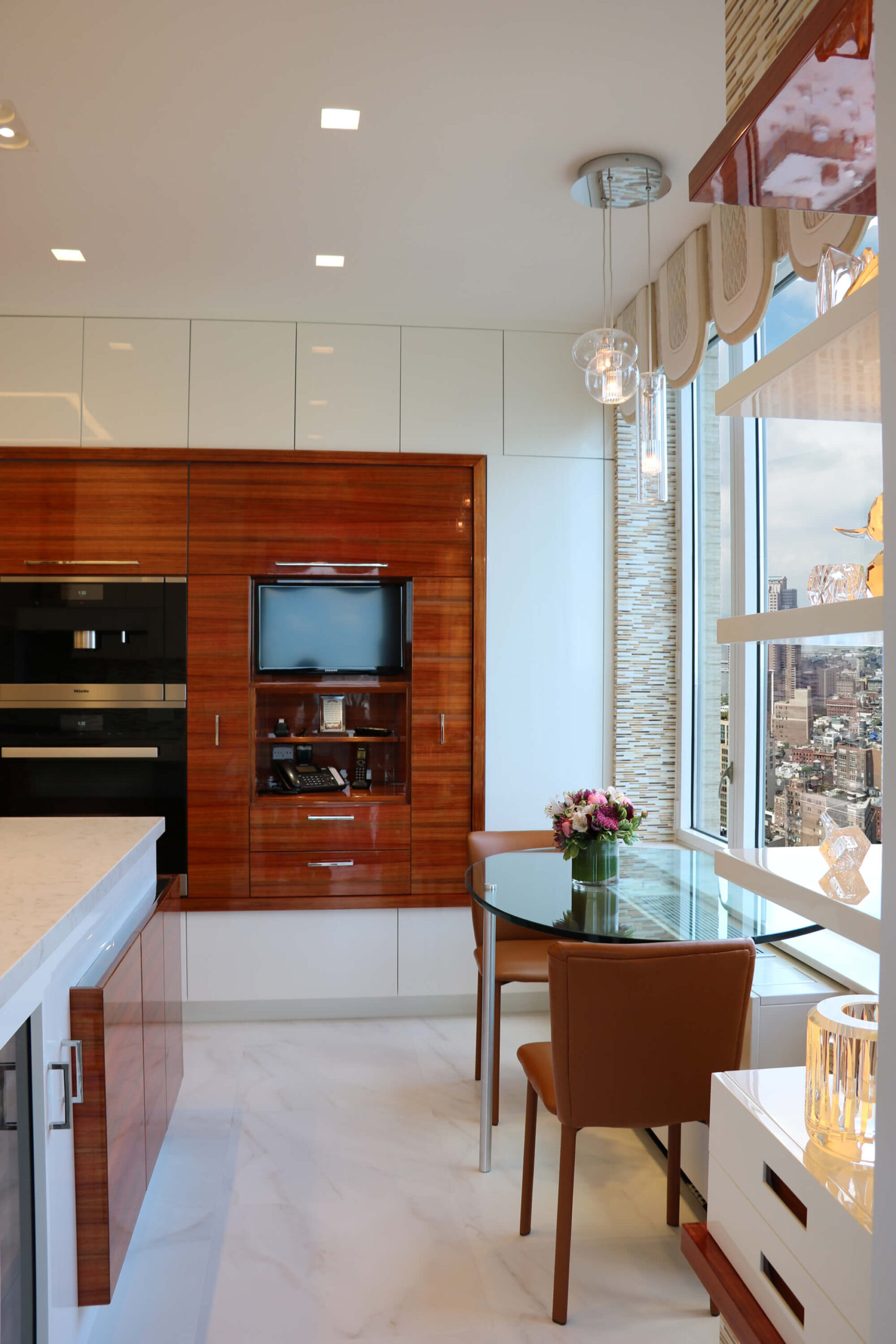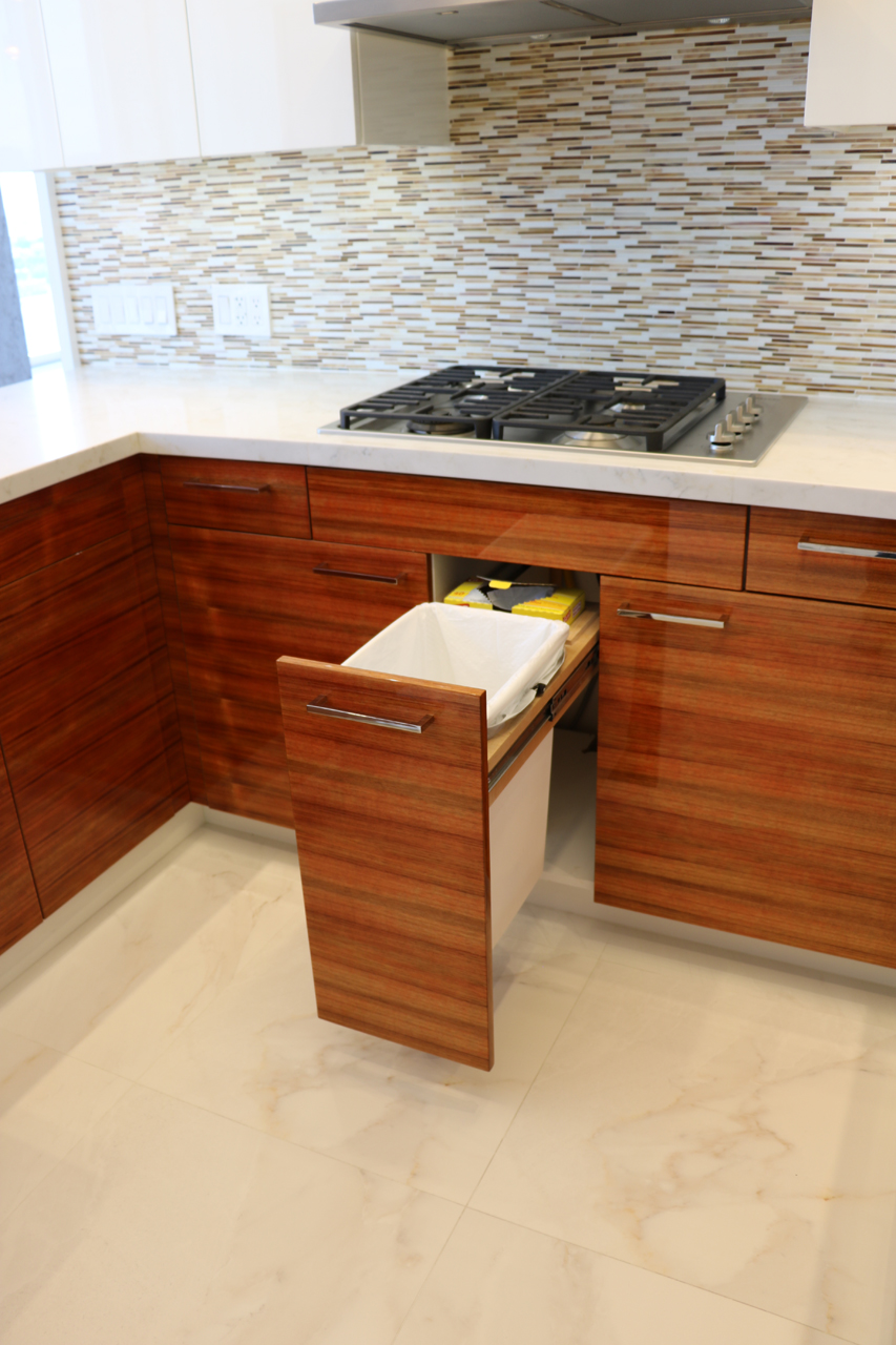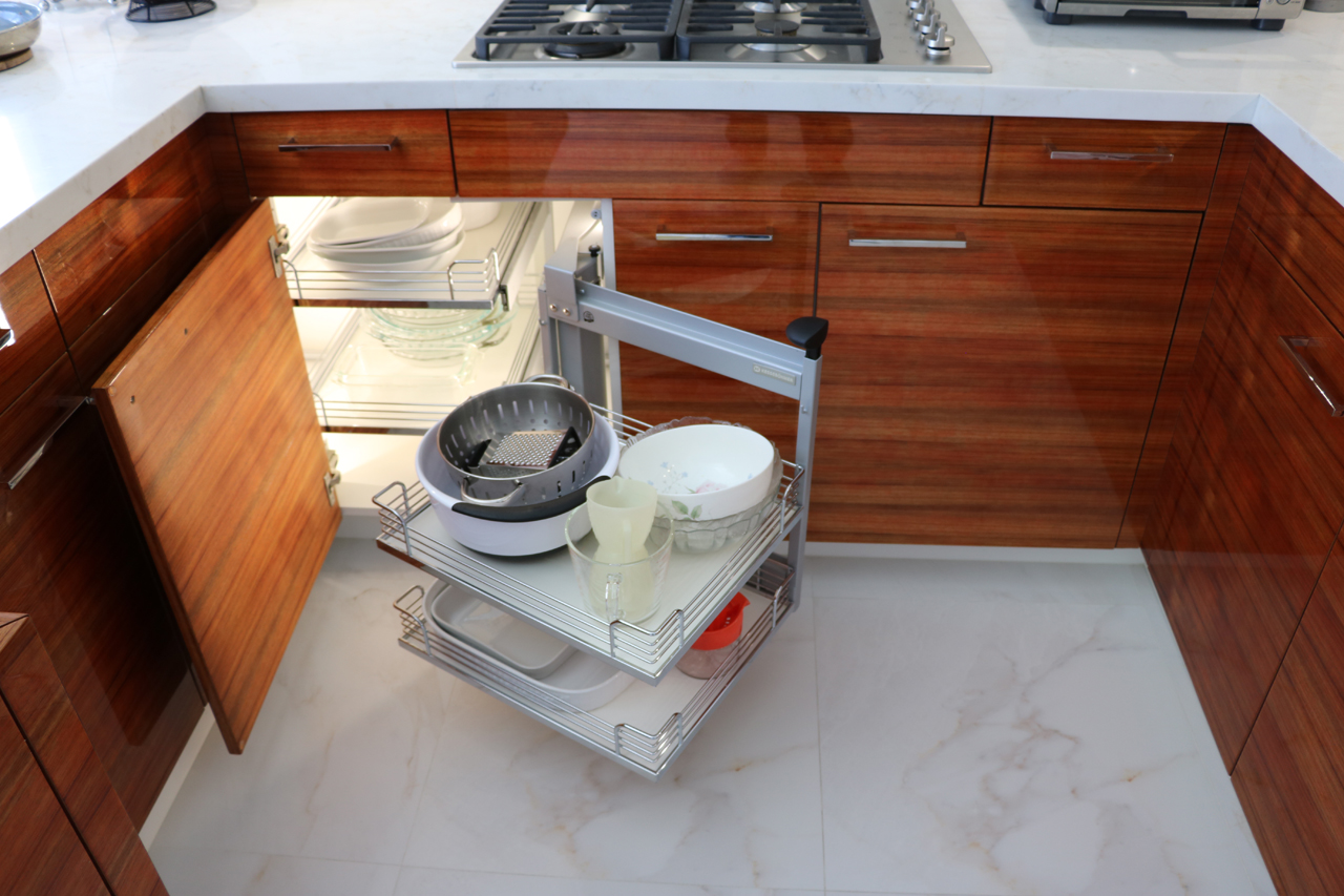 This modern kitchen design offers the perfect balance of beauty and function. Exotic Koa wood, white lacquer, stainless steel accents and an illuminated 3-Form corner panel create a bright and inviting space, while the finest Hafele pull out pantry mechanisms and automatic drawer and cabinet interior LED lighting systems ensure the maximal use of this space.