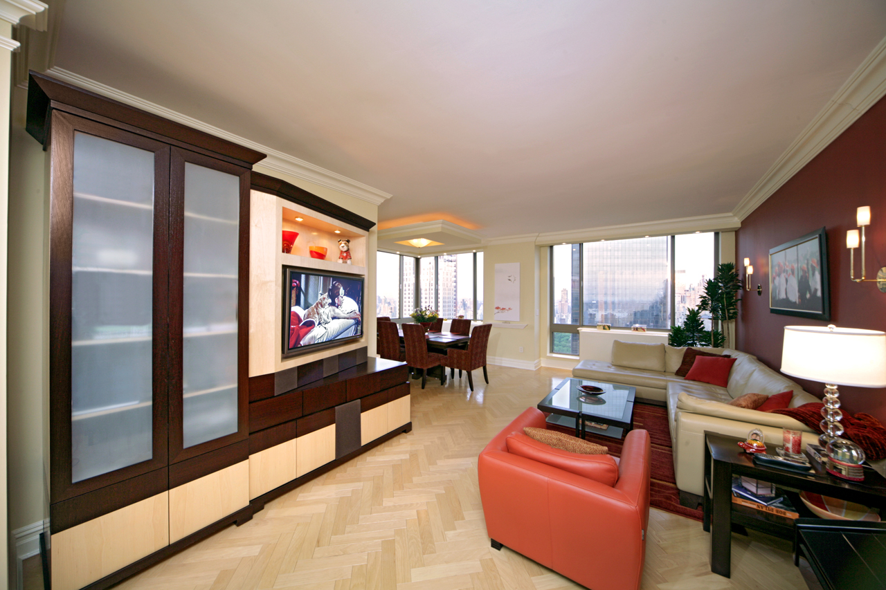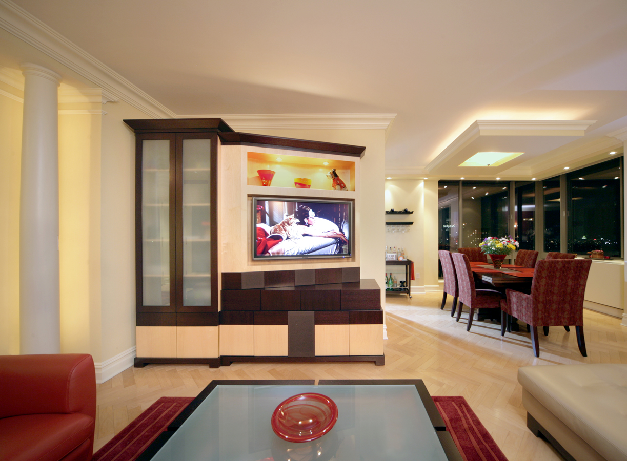Contemporary Living Room Design with English Sycamore and Mahogany wall unit featuring TV with angled panel to face seating area, and classic architectural millwork.