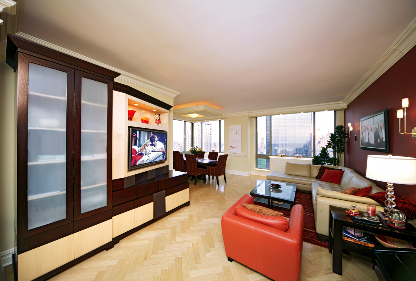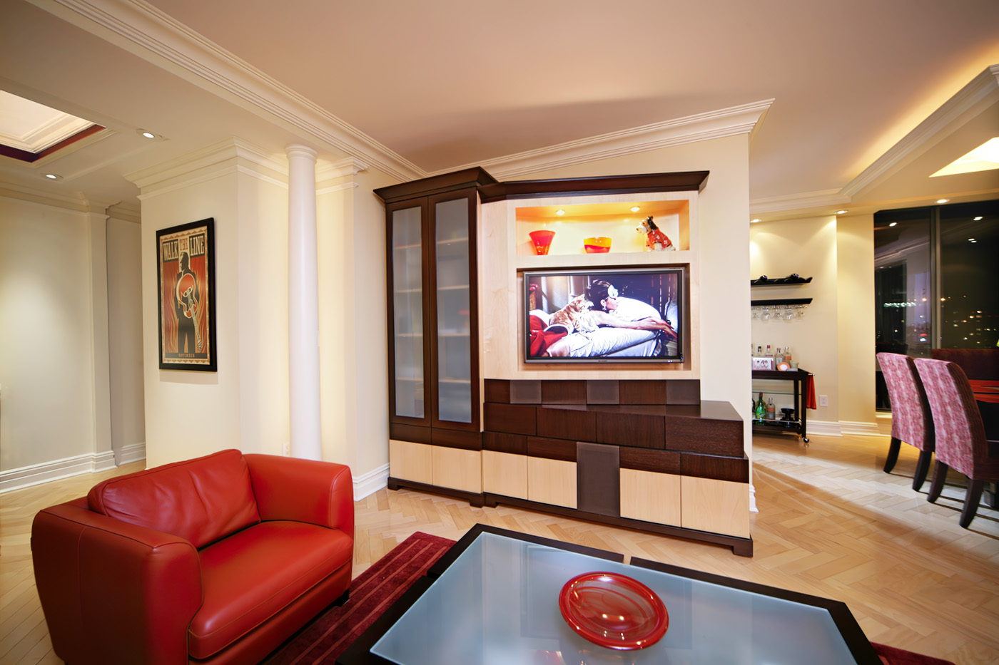 Contemporary Living Room Design with English Sycamore and Mahogany wall unit featuring TV with angled panel to face seating area, and classic architectural millwork.
