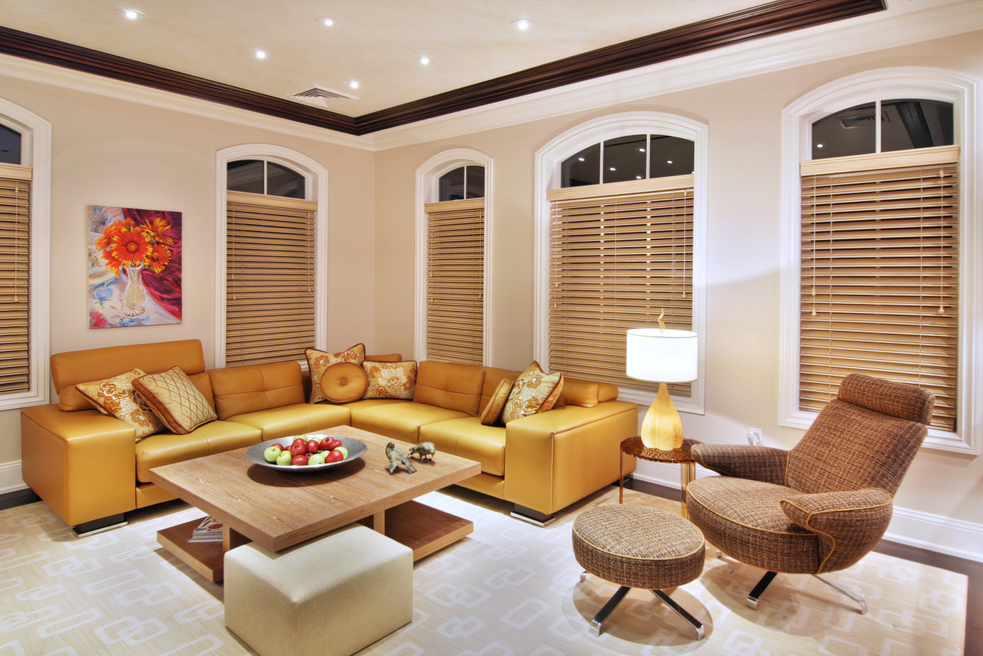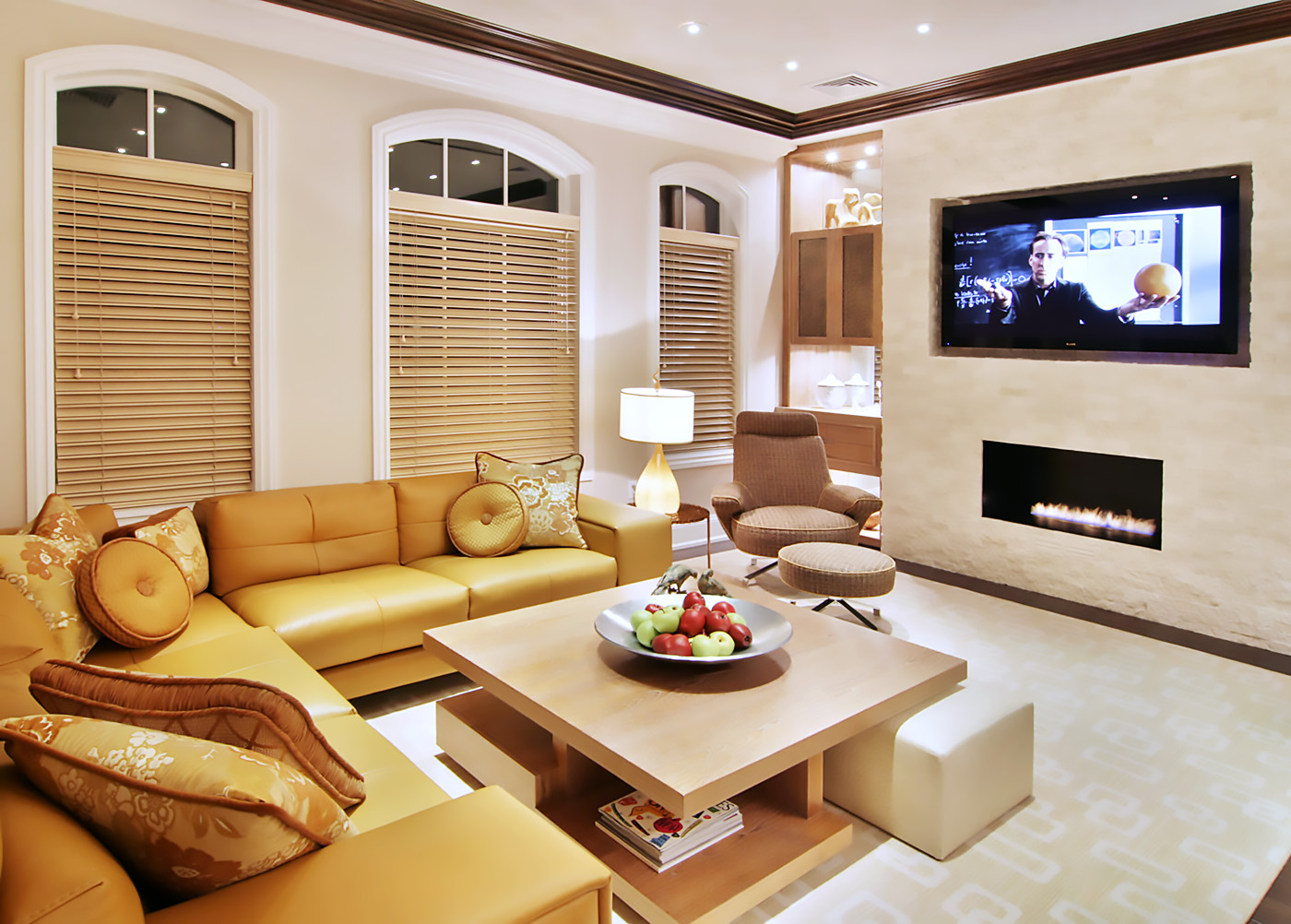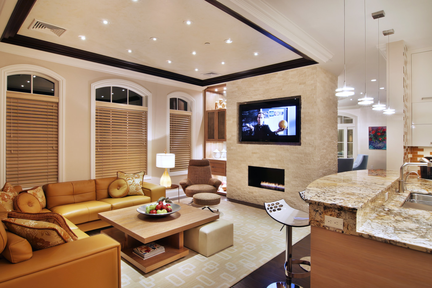 Bright Contemporary Family Room with framed illuminated ceiling design trimed in Mahogany with Serused Teak cocktail table and corner built-in with hammered bronze panels.