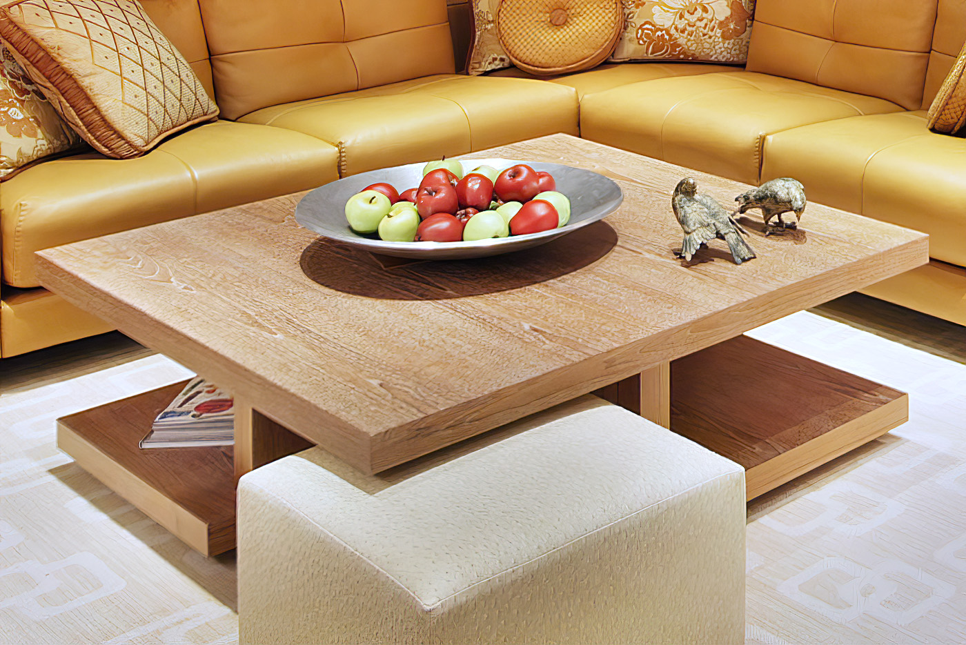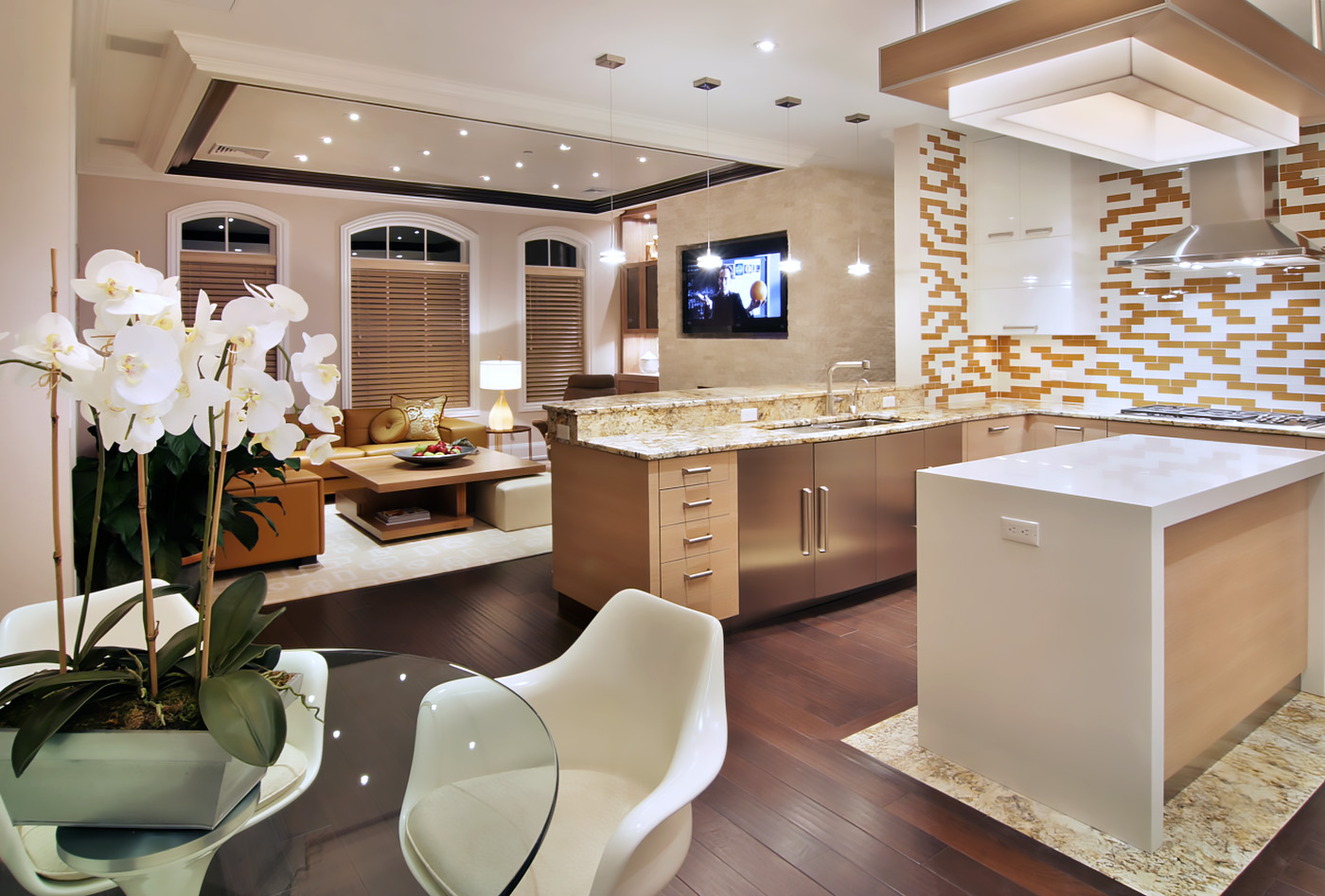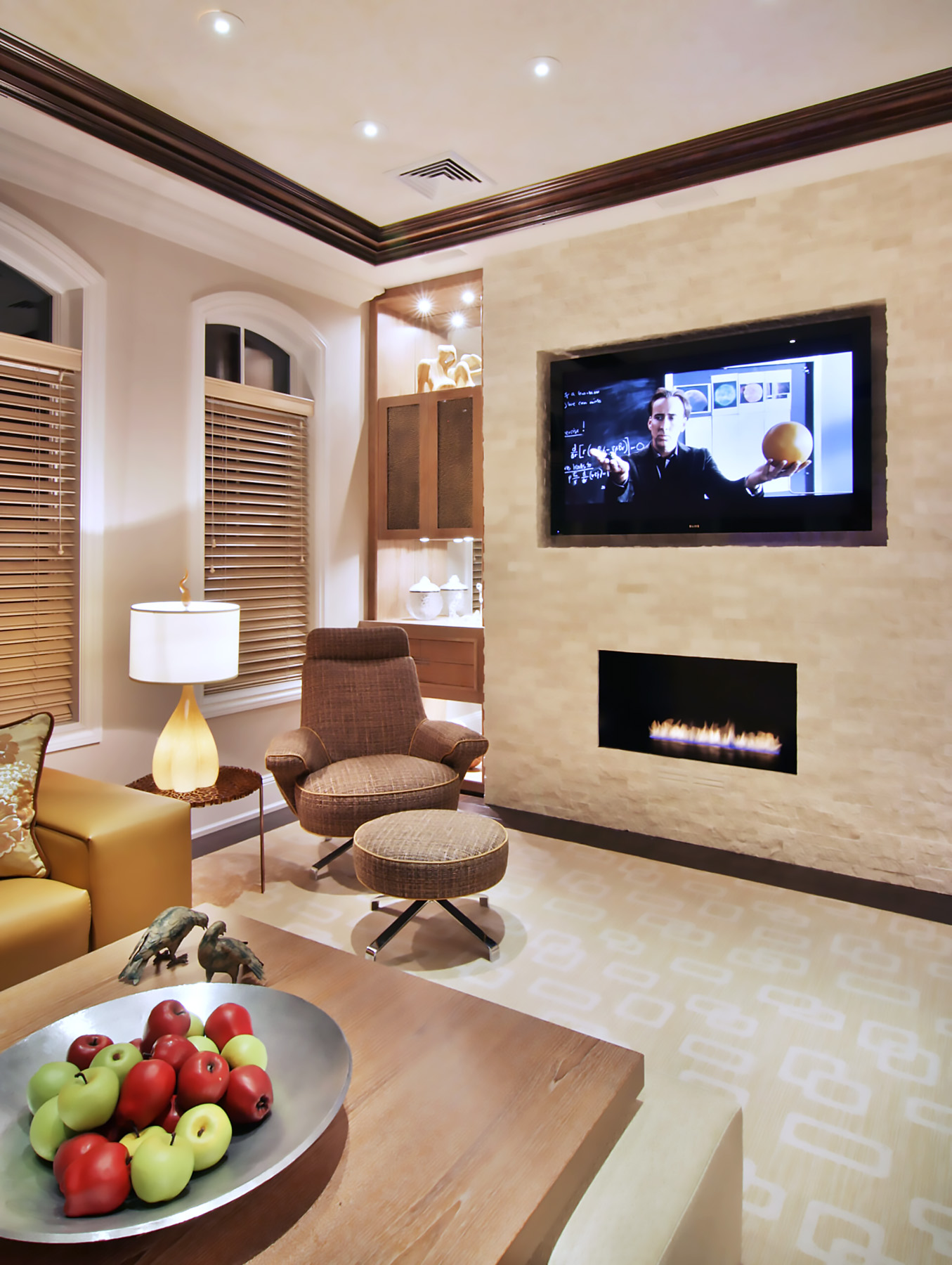 Bright Contemporary Family Room with framed illuminated ceiling design trimed in Mahogany with Serused Teak cocktail table and corner built-in with hammered bronze panels.