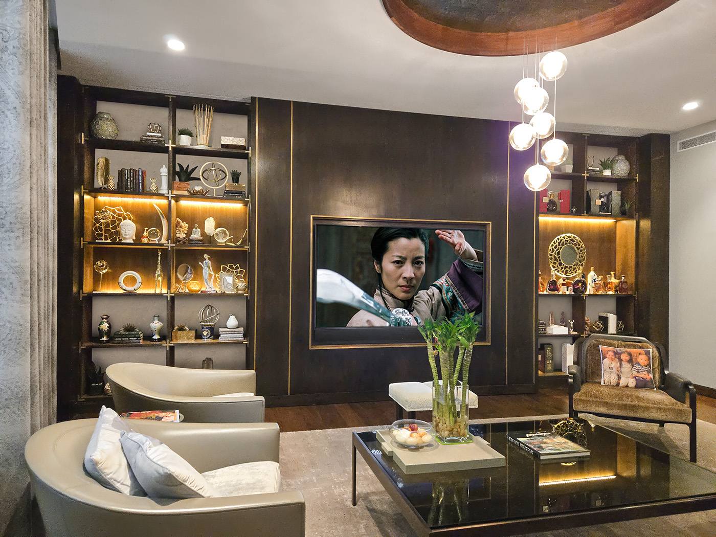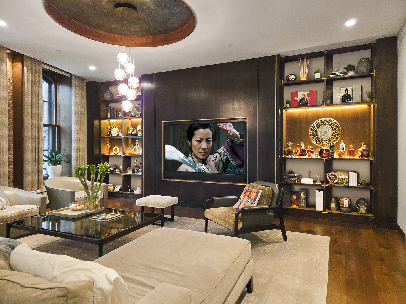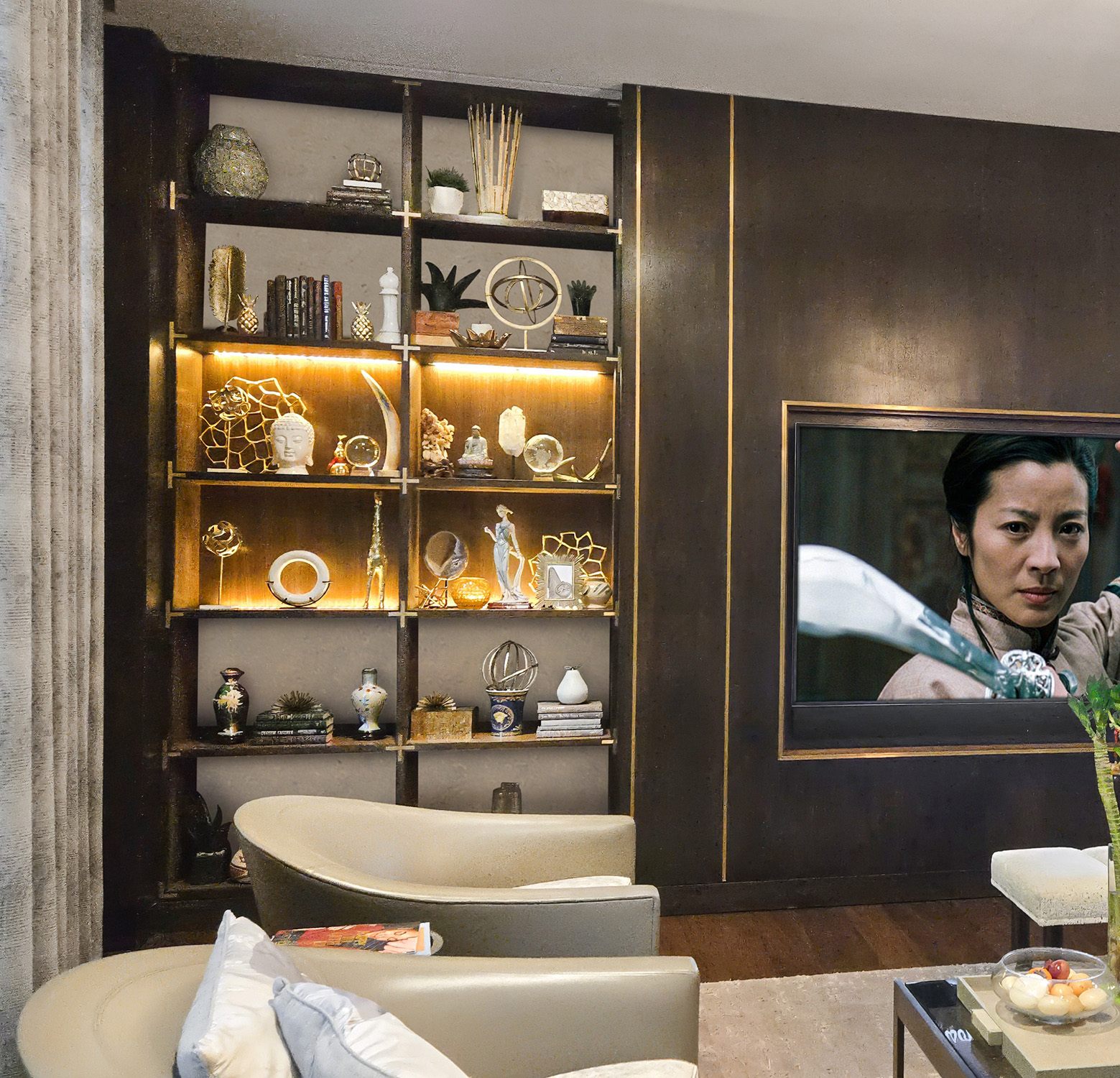 This Modern Built-In Entertainment Unit is designed for an 85″ TV and is finished in Walnut with Brass Inlays and Campaign Style Corner Trims. The Elegance of the Illuminated Center Bar and Display areas, with contrasting white lacquer backed top and bottom open sections, add to the Soft Ambiance of this Serene and Sophisticated Living Room.