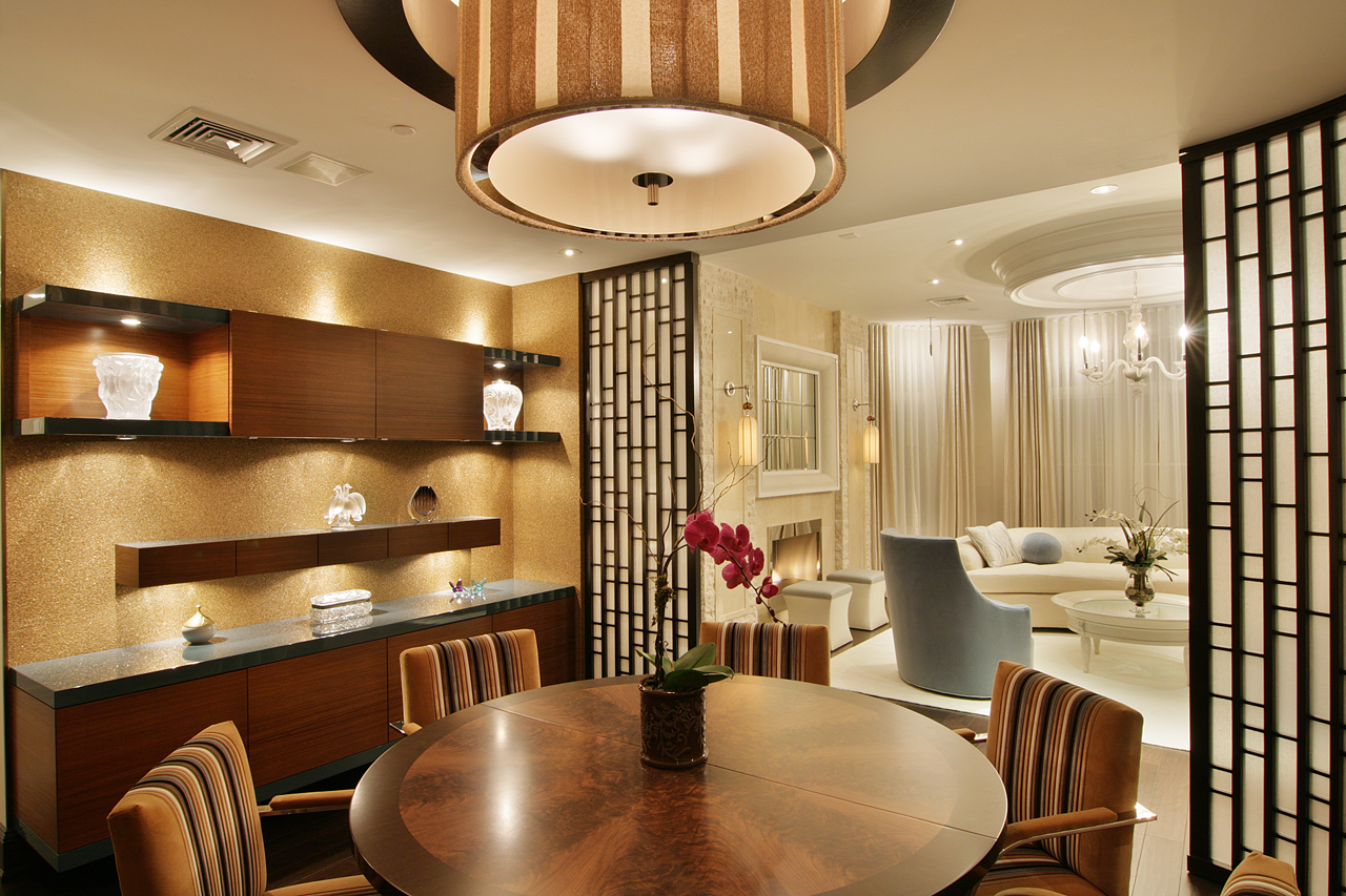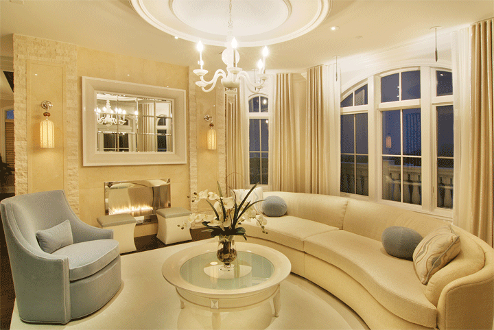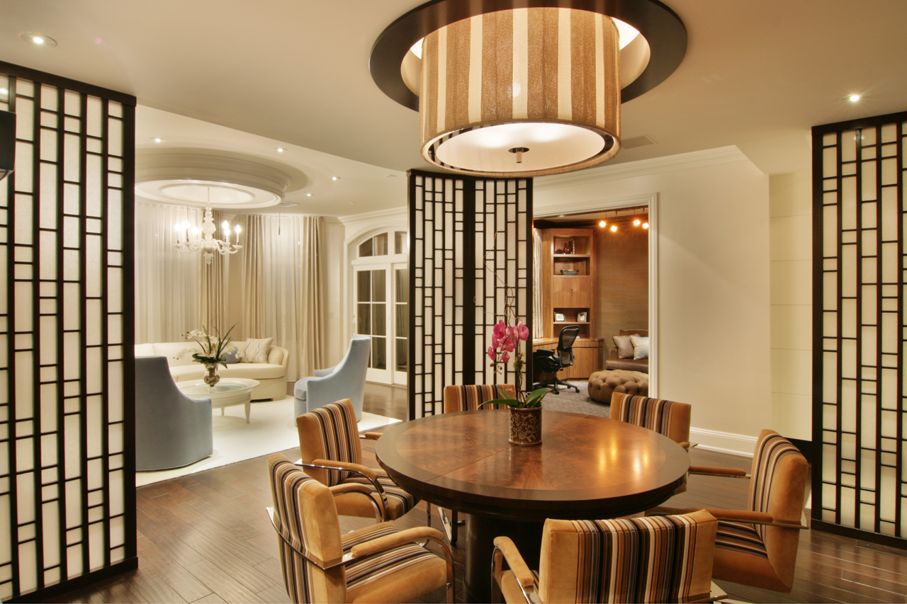 Classical Contemporary Design featuring domed living room canopy, TV mirror with remote concealment system and Espresso Stained room dividers with translucent 3-Form panels.