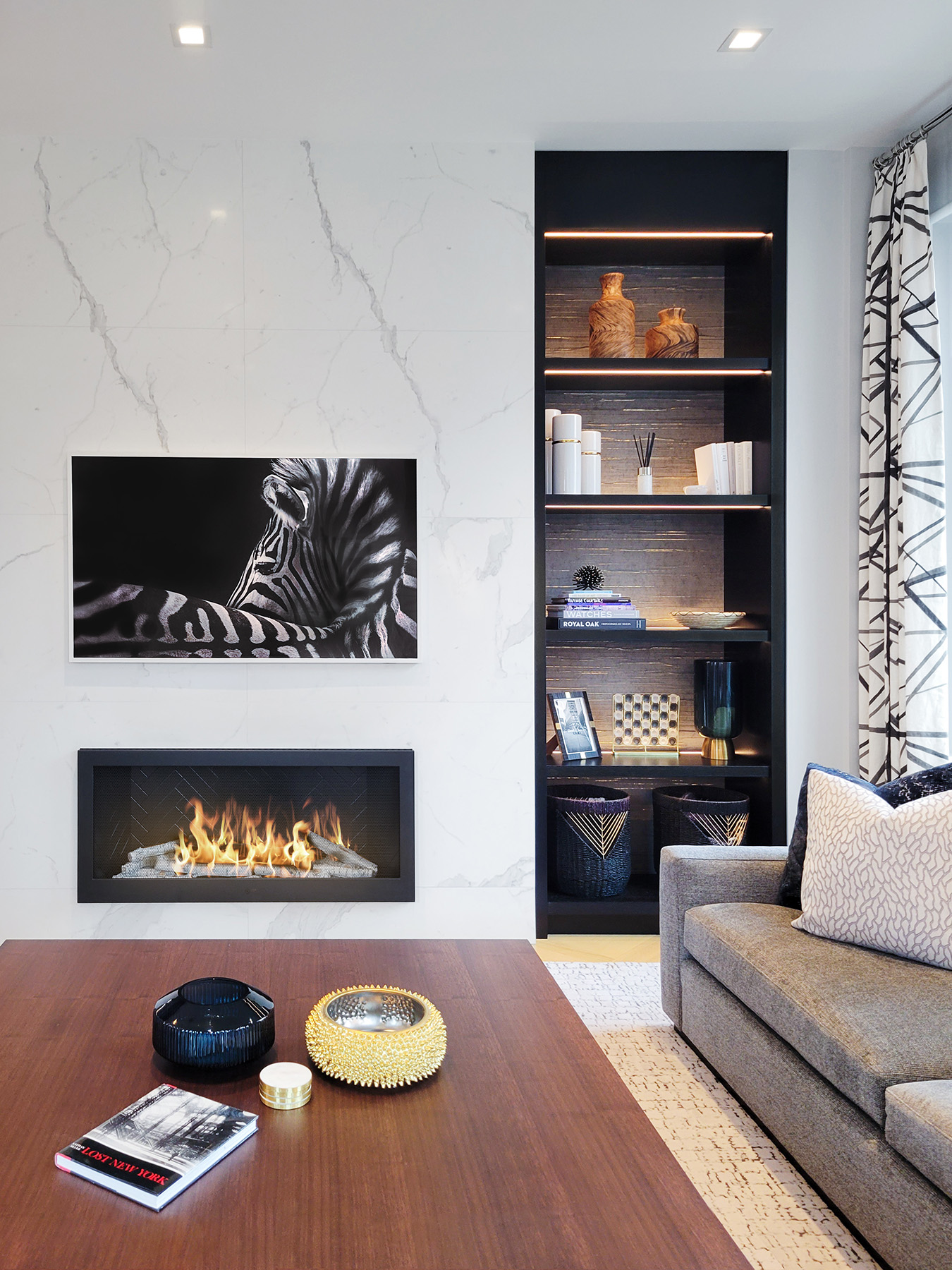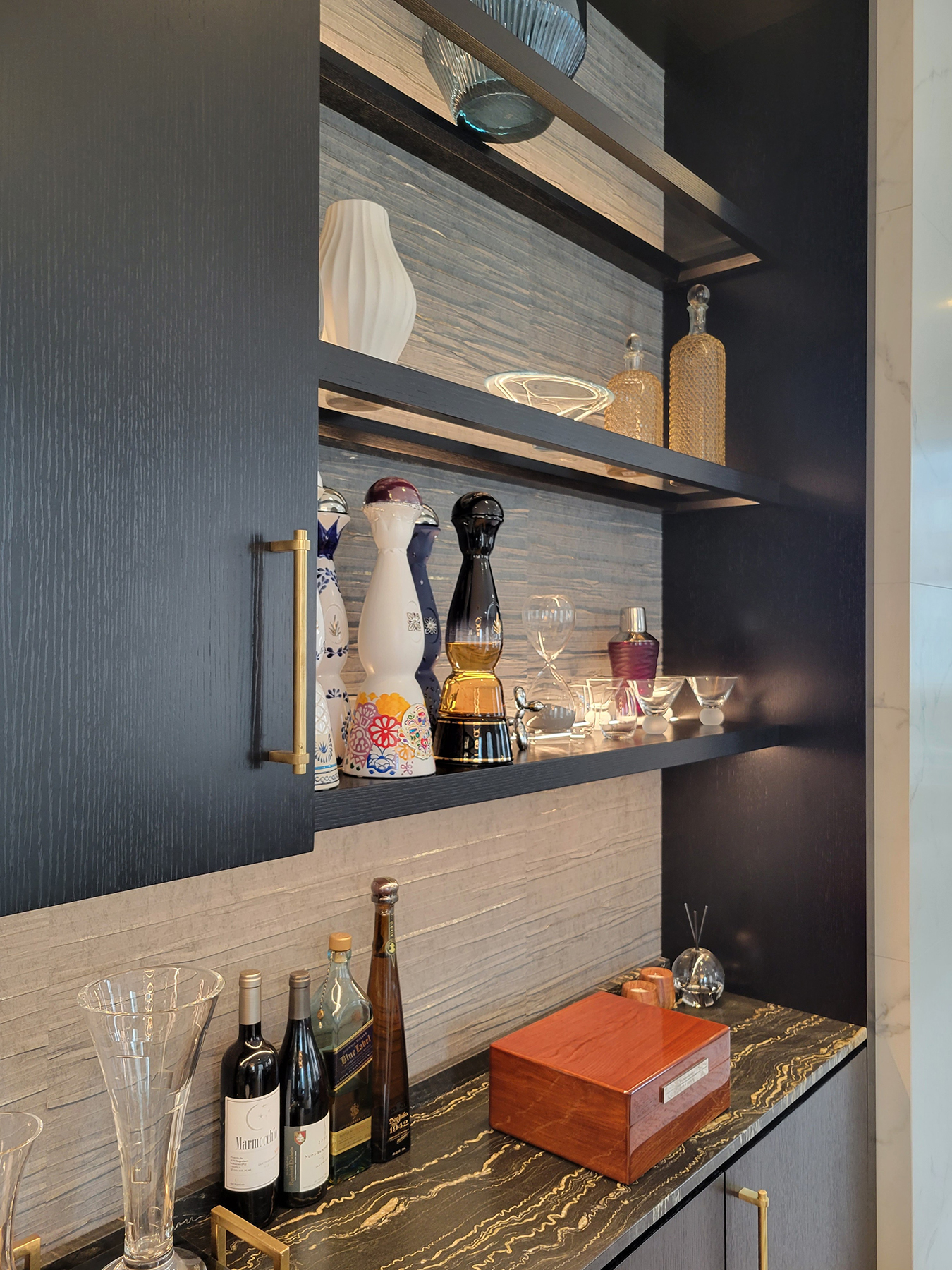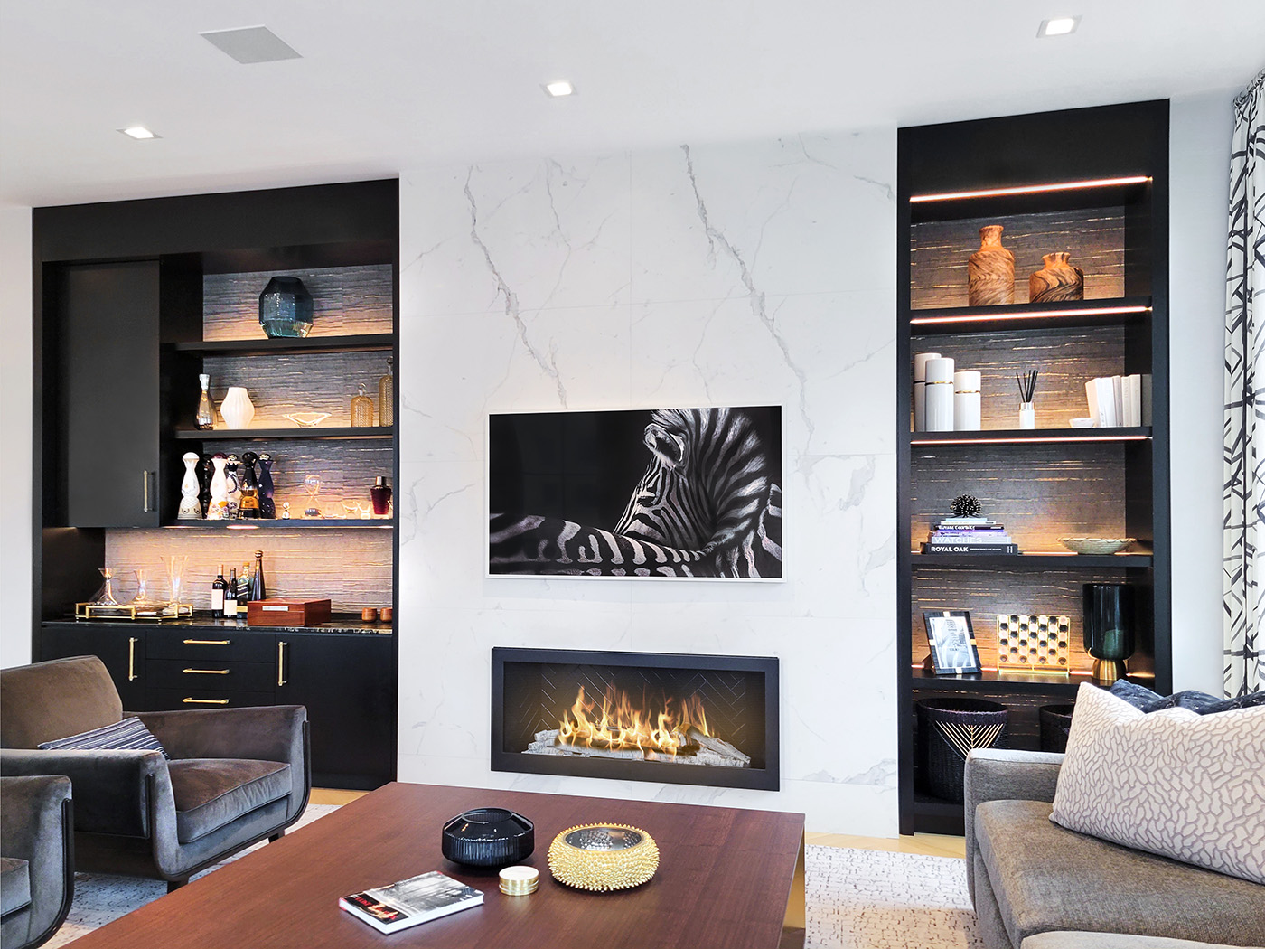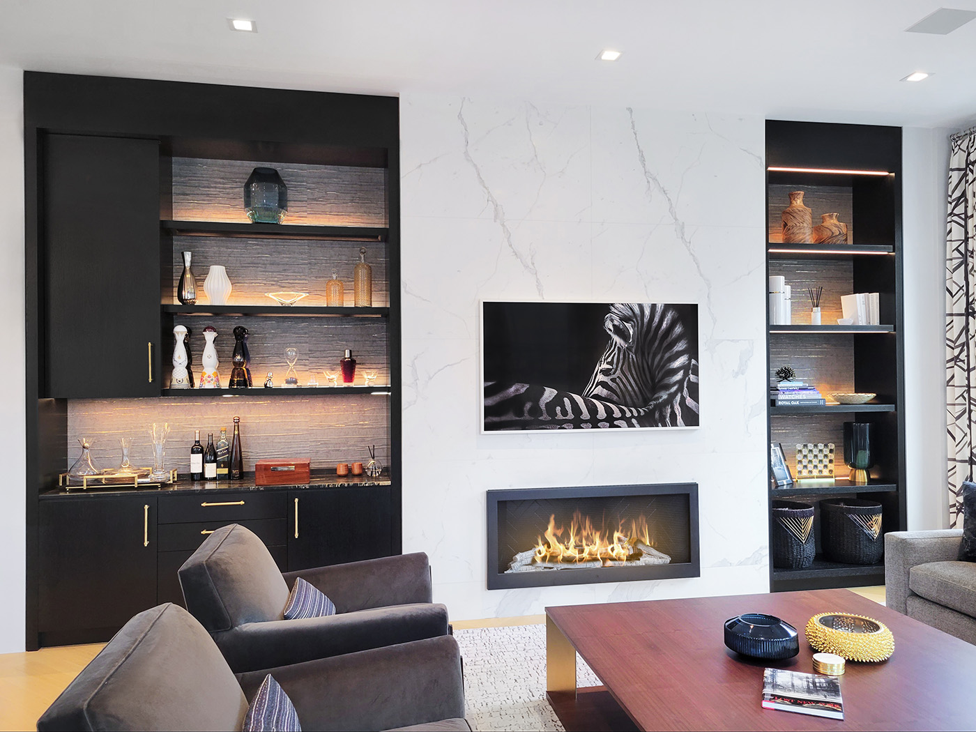 The custom millwork in this modern living room is highly functional with a refined appearance. The Ebony-stained White Oak perfectly contrast the colors of the living room furniture, marble TV-Fireplace and artwork. The asymmetry of the built-ins is balanced even though the Right-Side Display Unit is less than half the size of the Bar Design on the left. Note the framed glass shelving in the upper bar section and the LED lighting adds a warm, inviting quality that complete the room.