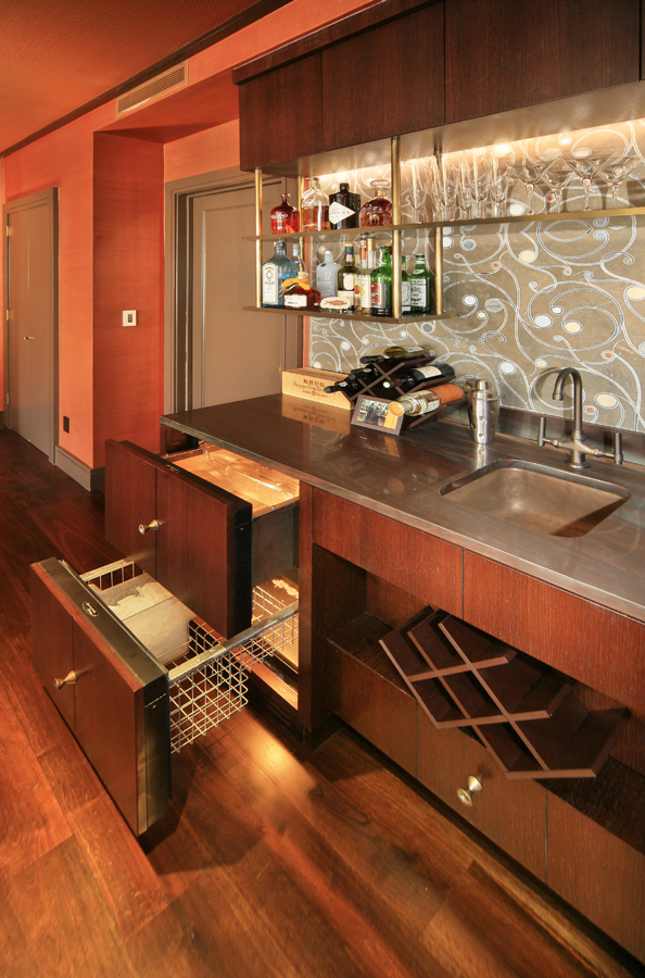 Family Entertainment Room with custom made wall unit in stained Mahogany, Statuary Bronze and high gloss lacquer with coordinating corner built in bar design.