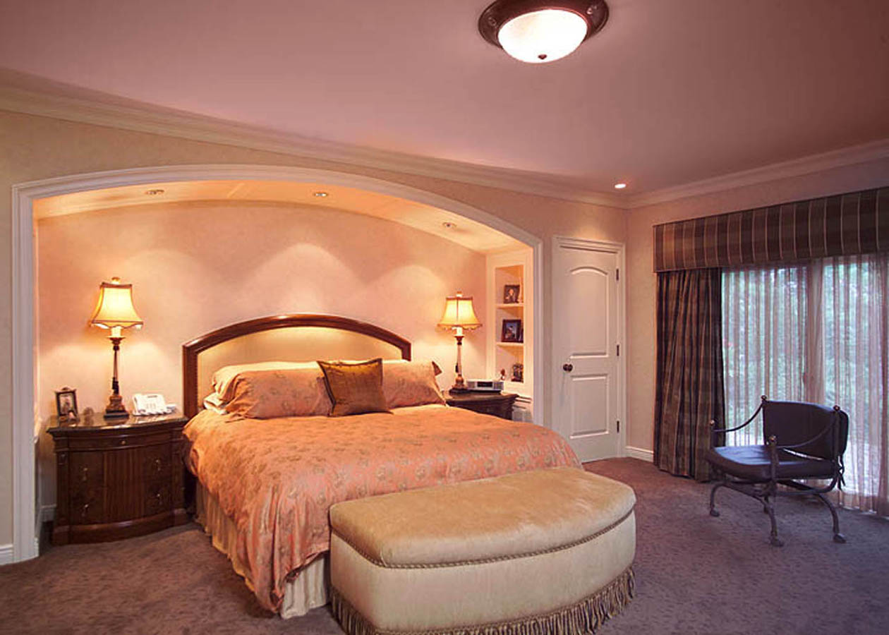 Classic Traditional Bedroom with custom made night tables set in arched alcove with built in shelving across from dresser etegier.