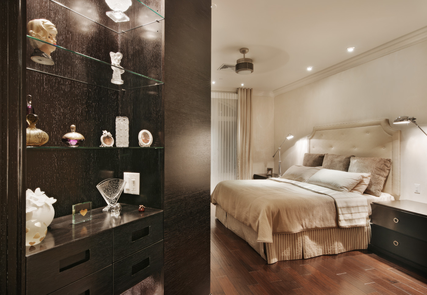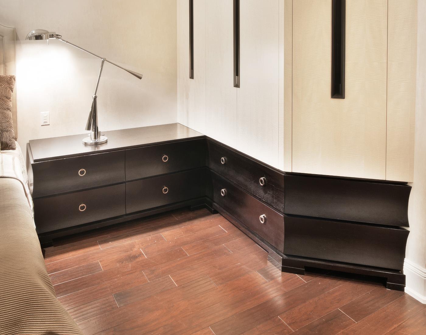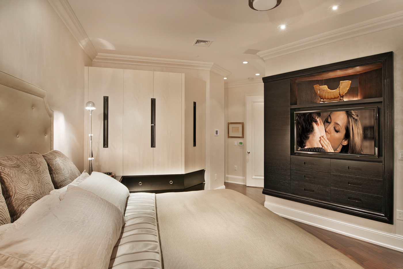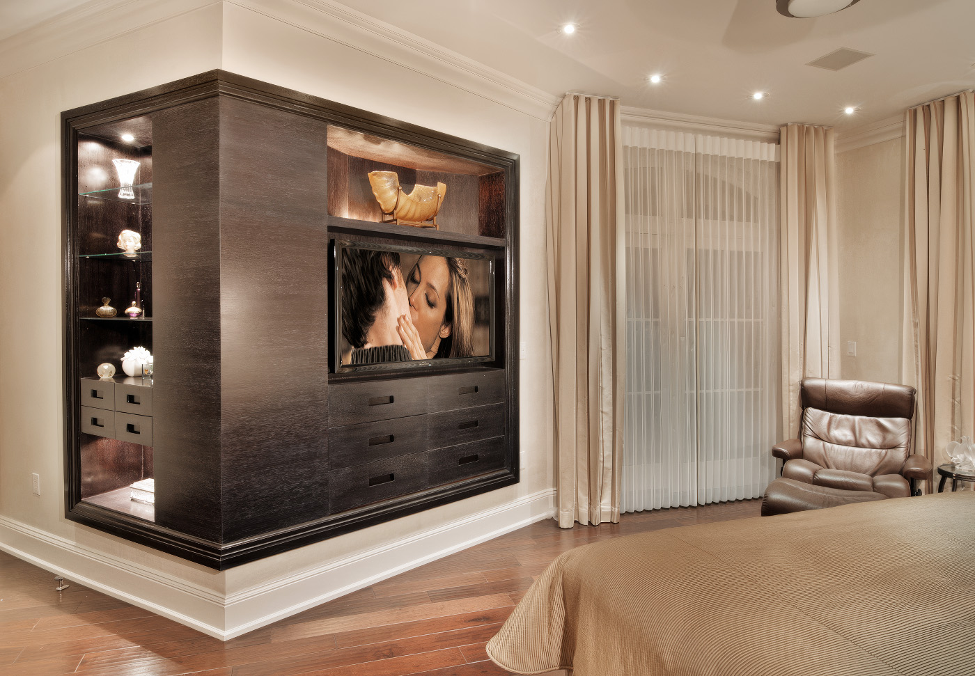 Transitional Modern Bedroom featuring concave drawer faces, custom inset door handles and built-in display and TV cabinetry in Espresso stained Rift Oak and Tabu veneer.
