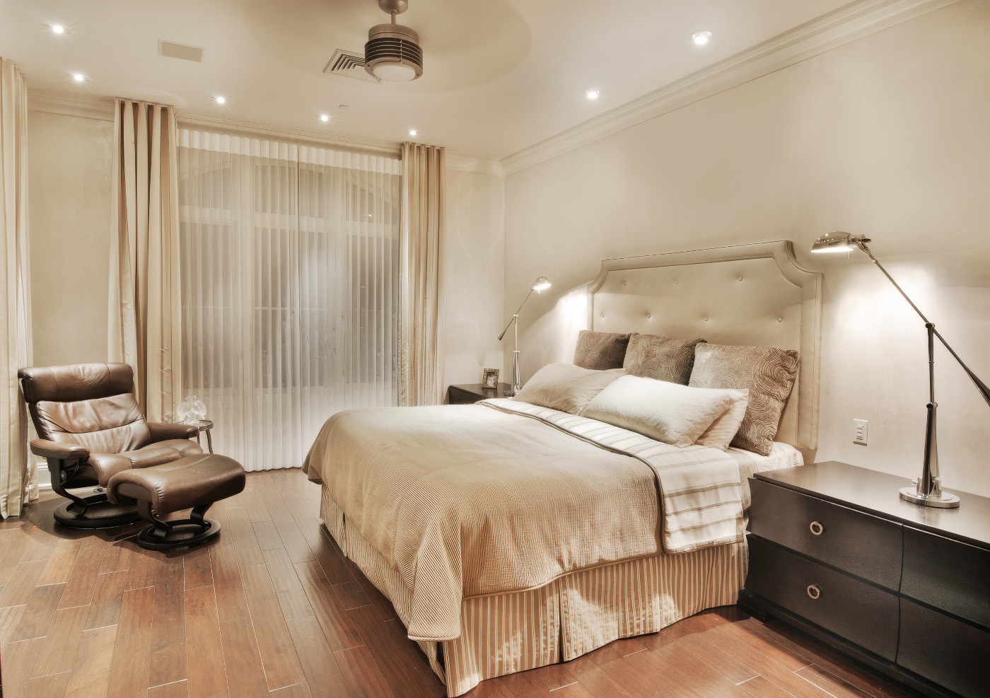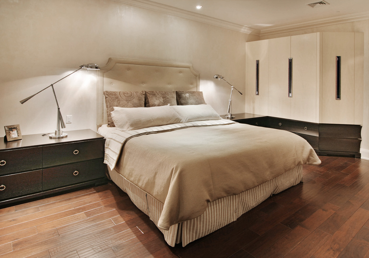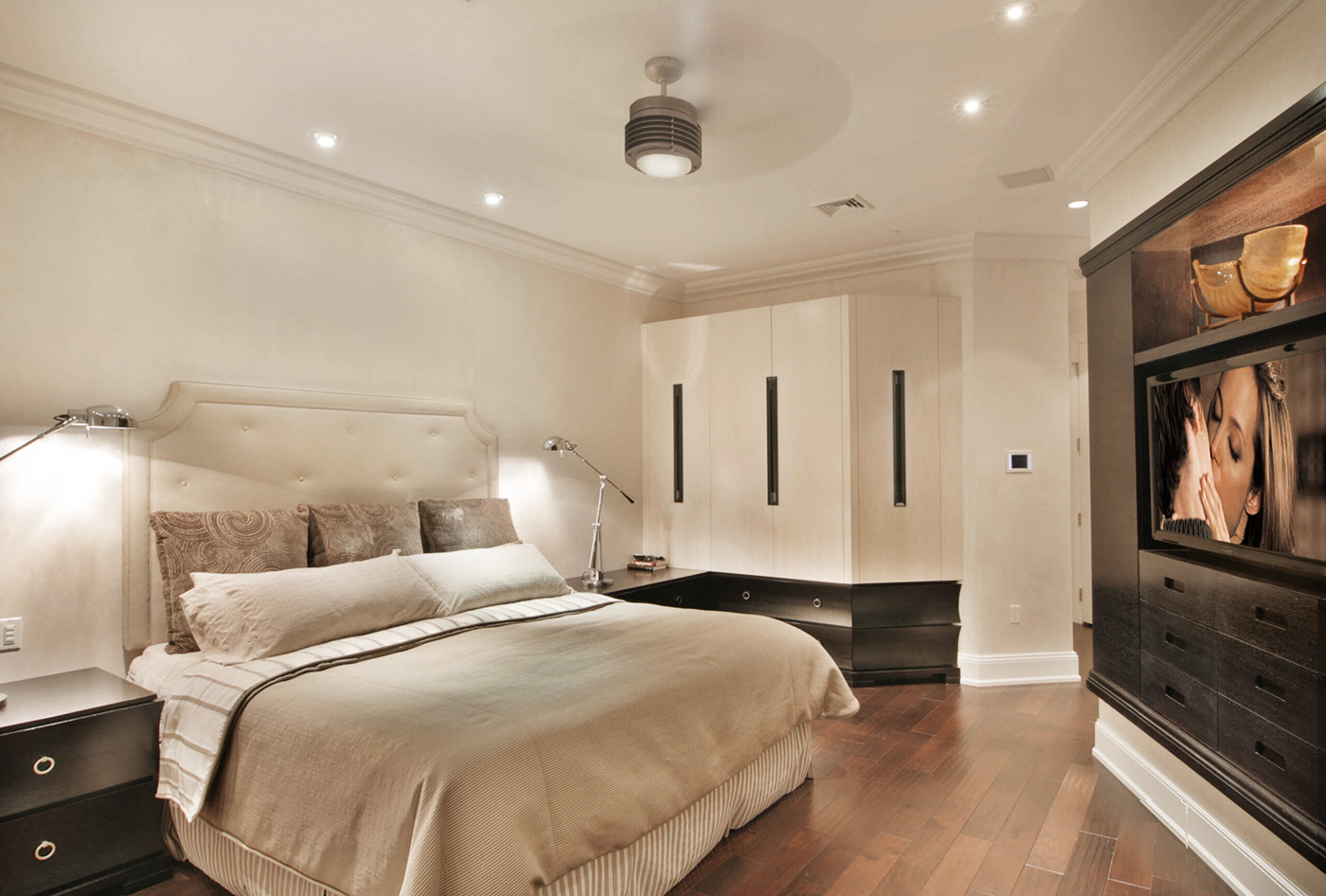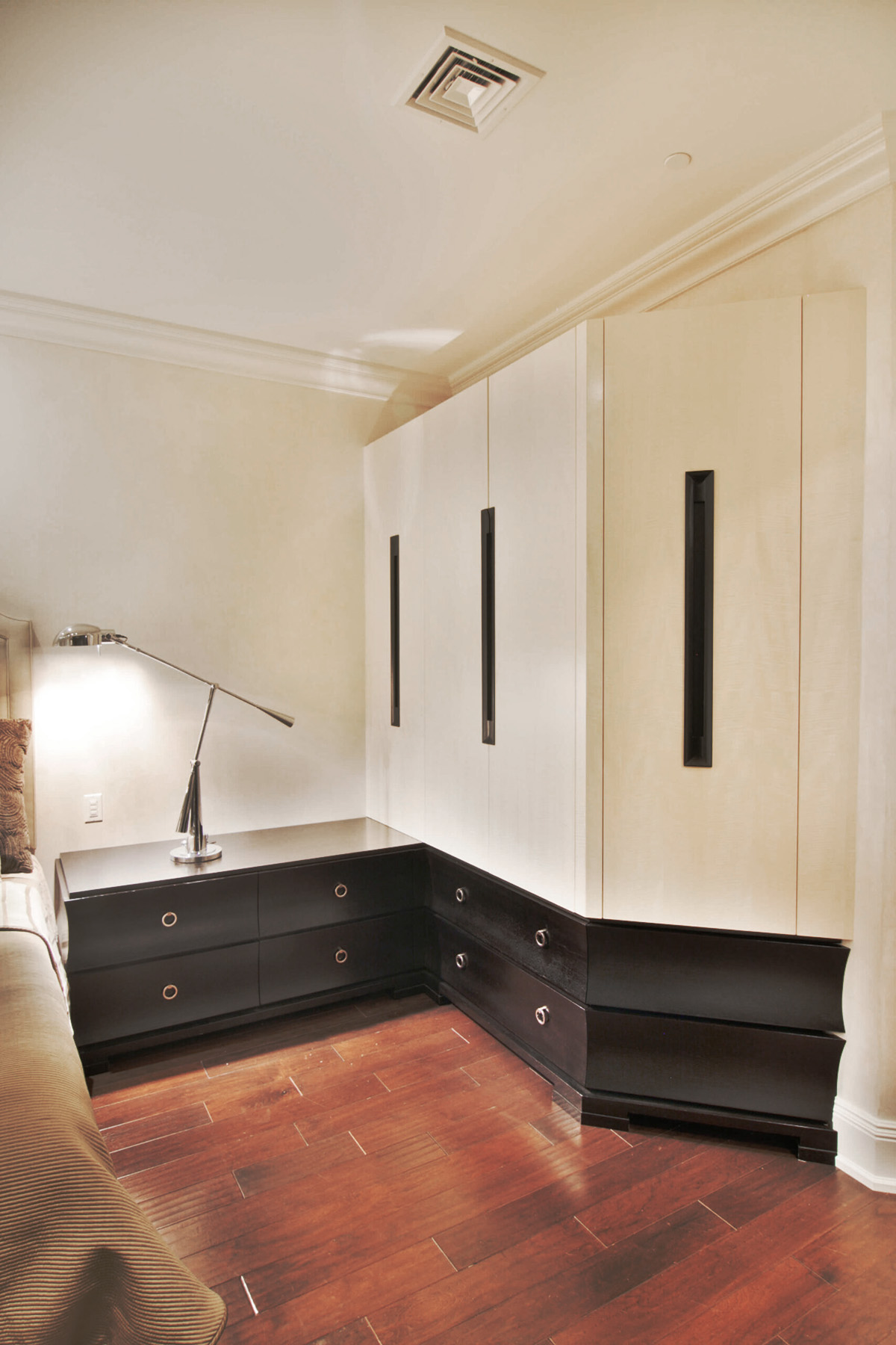 Transitional Modern Bedroom featuring concave drawer faces, custom inset door handles and built-in display and TV cabinetry in Espresso stained Rift Oak and Tabu veneer.