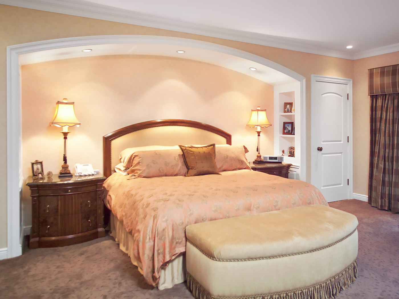 Classic Traditional Bedroom with custom made night tables set in arched alcove with built in shelving across from dresser etegier.