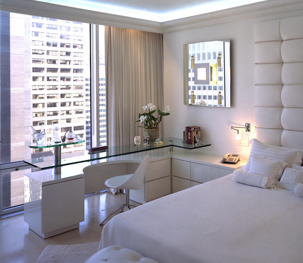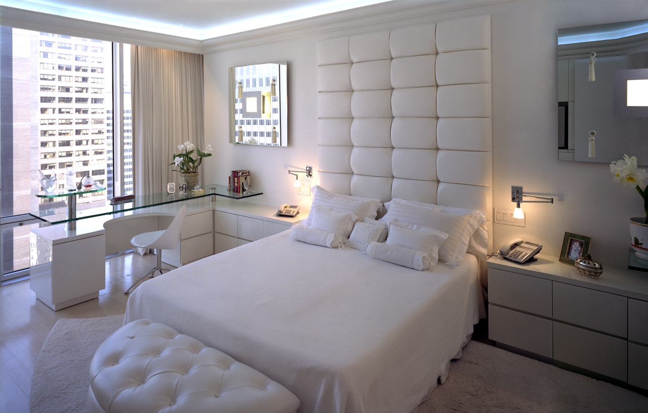 White Lacquer Bedroom with a tall tufted faux leather headboard, and a wrap around dressing table with floating glass counter supported with polished steel accents.