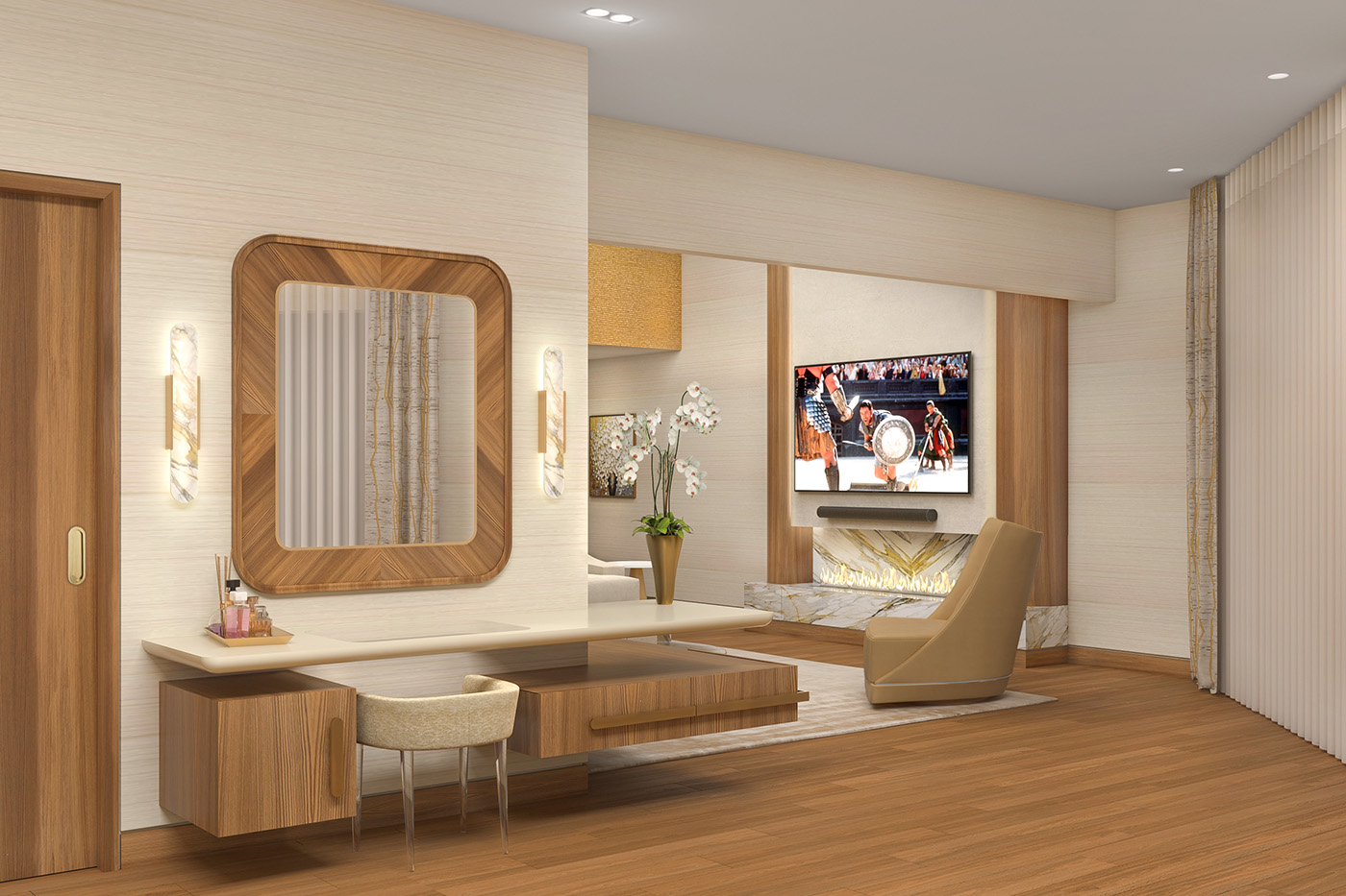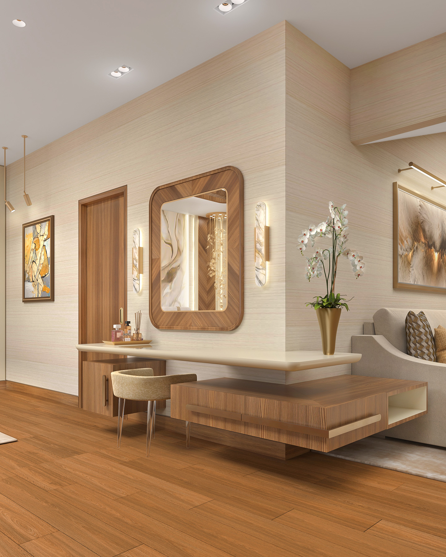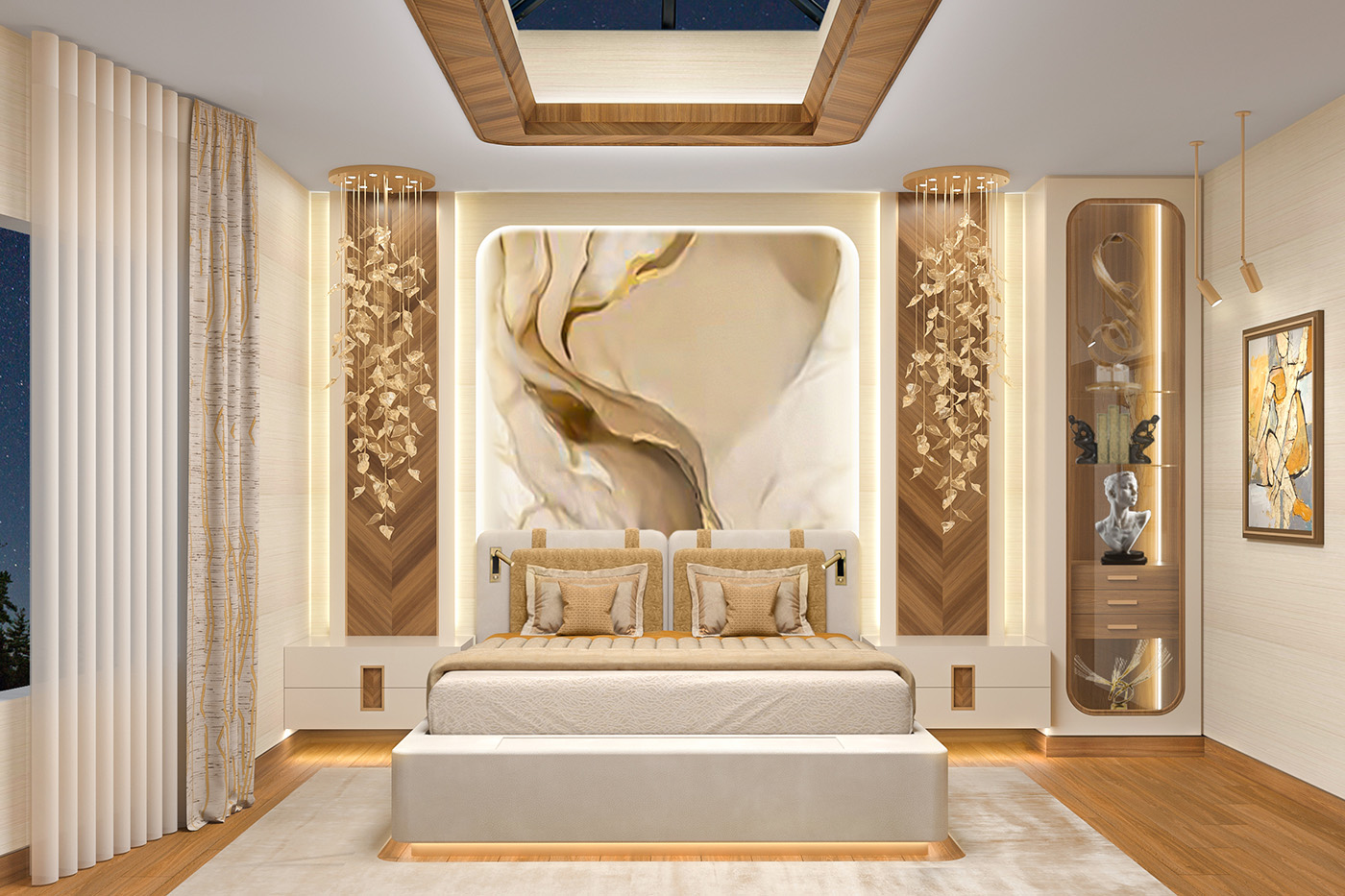 A Floating Dressing Table in Fume Larch and Lacquer transitions to the Media Salon and unites both spaces with a Continuous Stepped Down Floating End Table. There is a Custom-Made Chevron Mirror Design above the Dressing Table, and a Chevroned Frame trims the Skylight above the bed.