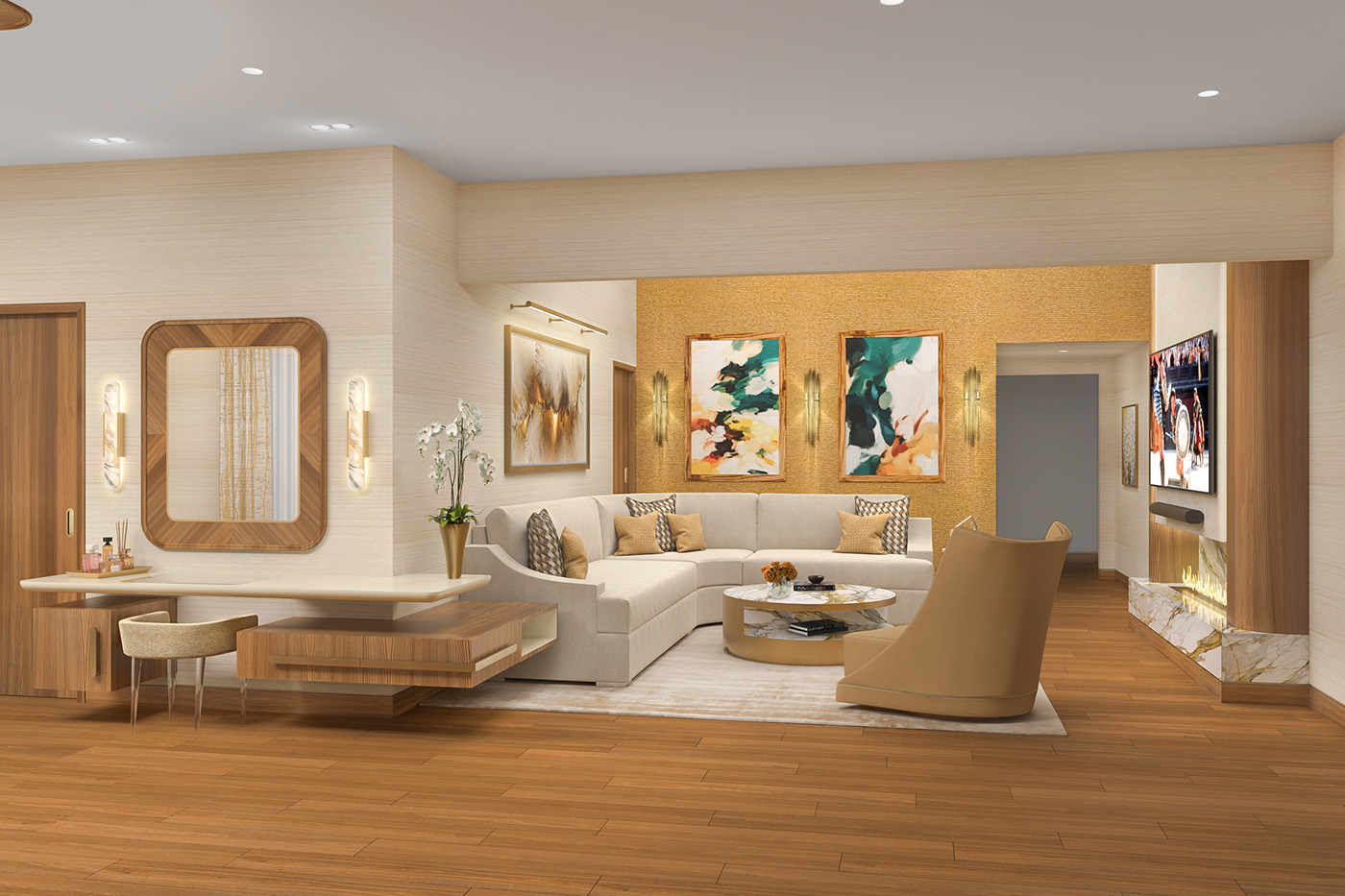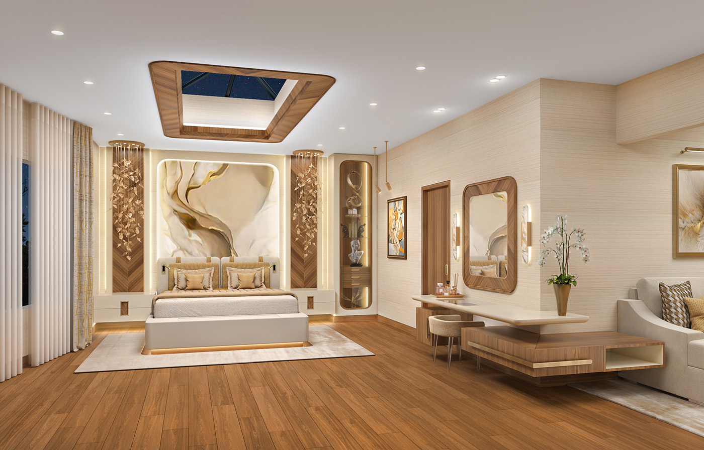 This Alluring Modern Bedroom with Media Salon pulls out all the stops in terms of design lay out, materials, finishes and its’ overall unique aesthetic appeal.