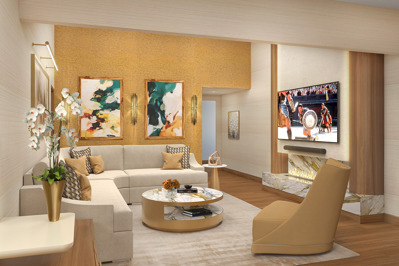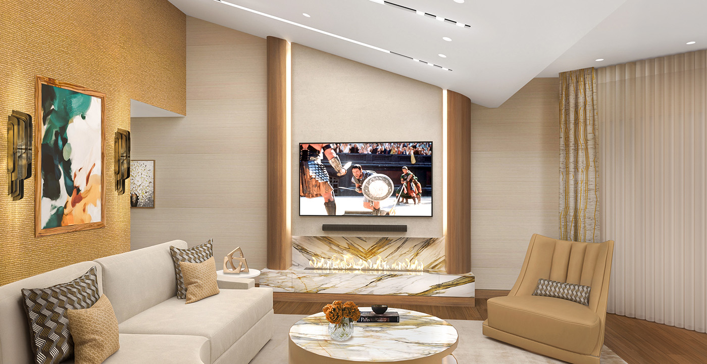 In the media salon around the corner from the bed area is a TV Fireplace Wall that is installed to the vaulted ceiling. This exciting focal point is also finished in Fumed Larch and contrasted with Calacatta Gold Porcelain. This Entertainment Wall Design accommodates an 85″ TV, a Wall Mounted Sound Bar and a 72″ Bio Flame Linear Alcohol Fireplace. Half-columns in Fumed Larch flank the TV and fireplace and concealed in the base are two storage drawers with porcelain faces as well as an access panel to refuel and service the alcohol fireplace unit.