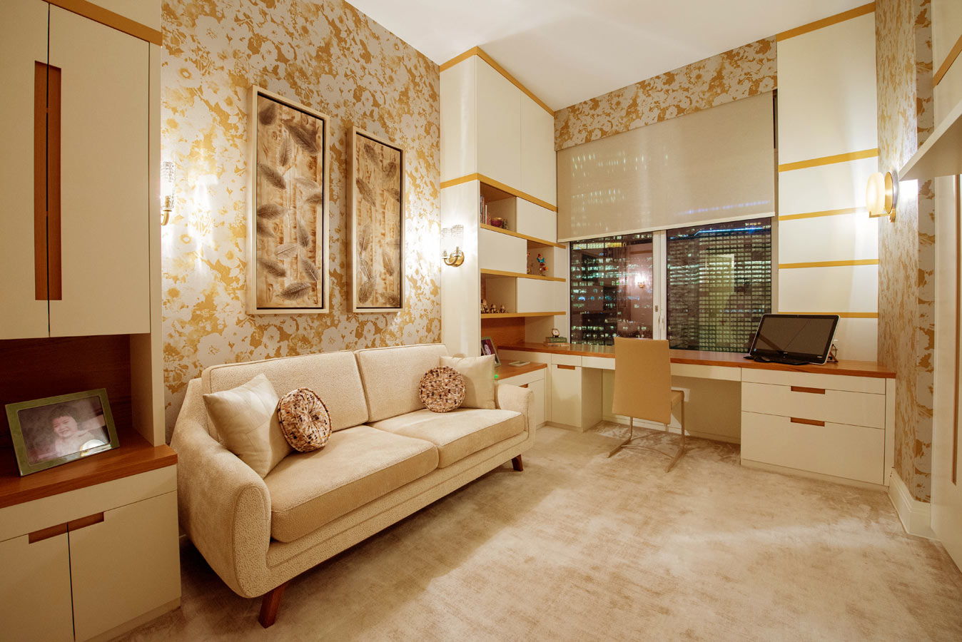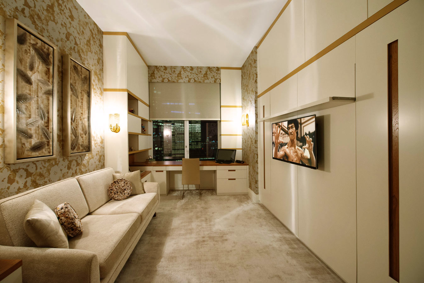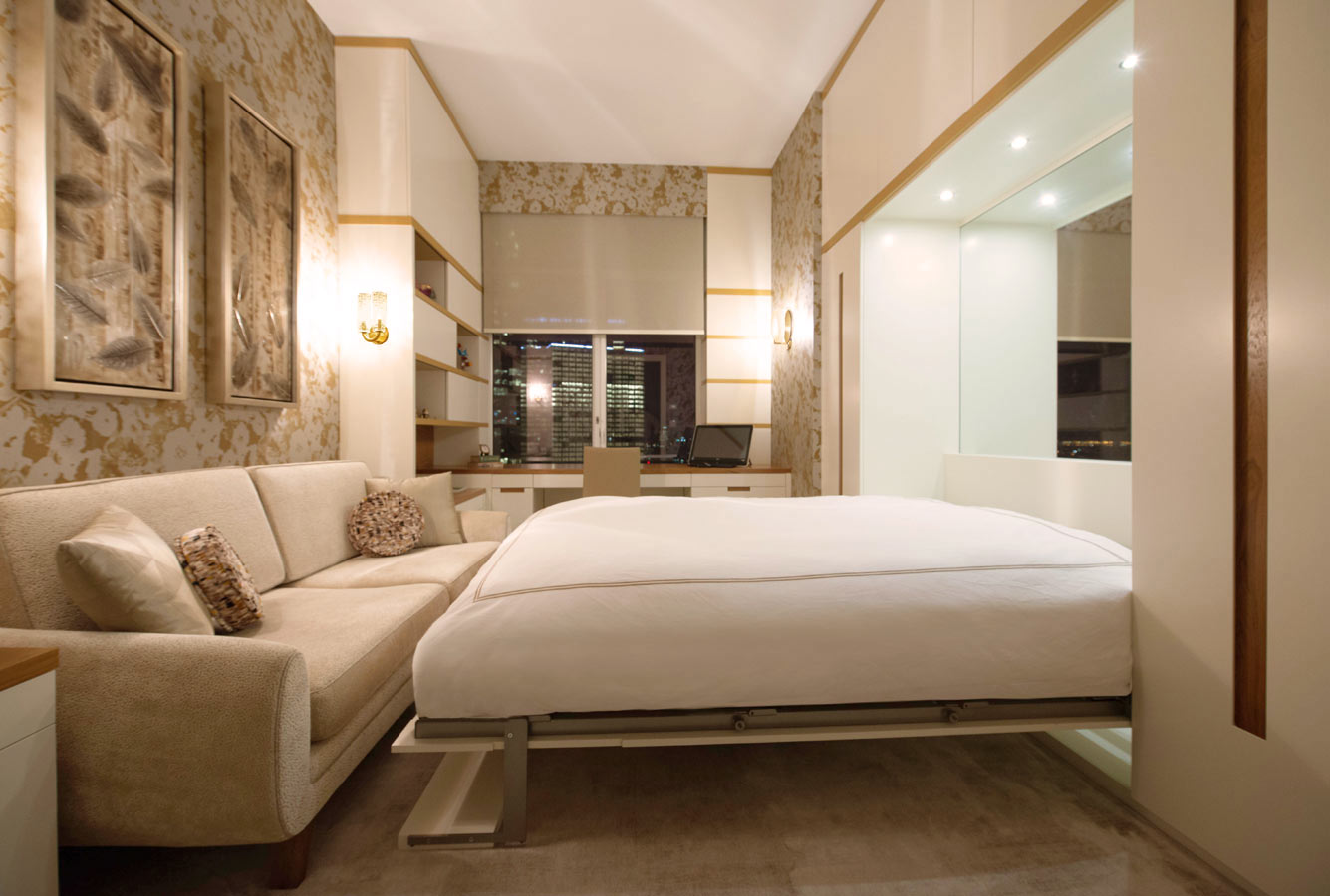 The panel bed easily converts this modern study and TV room into an comfortable guest bedroom. The interior of this panel bed design, which utilized the renowned Richelieu panel bed mechanism features a headboard, interior lighting and wall mirror.