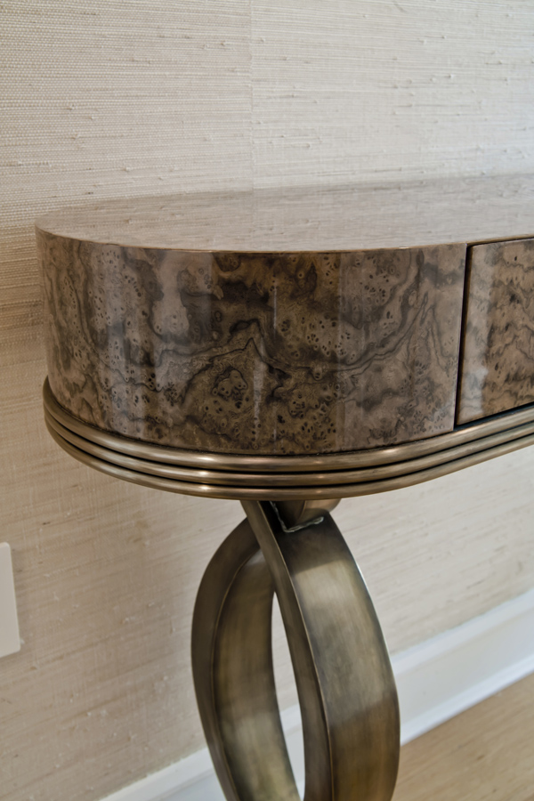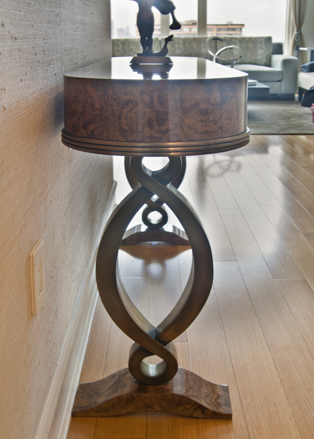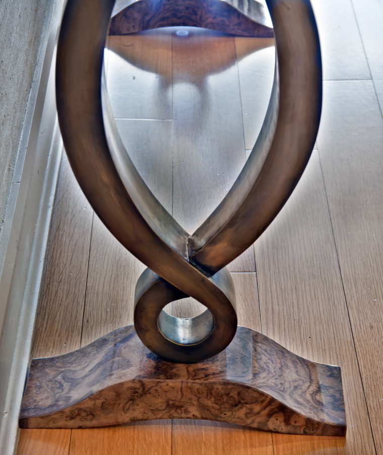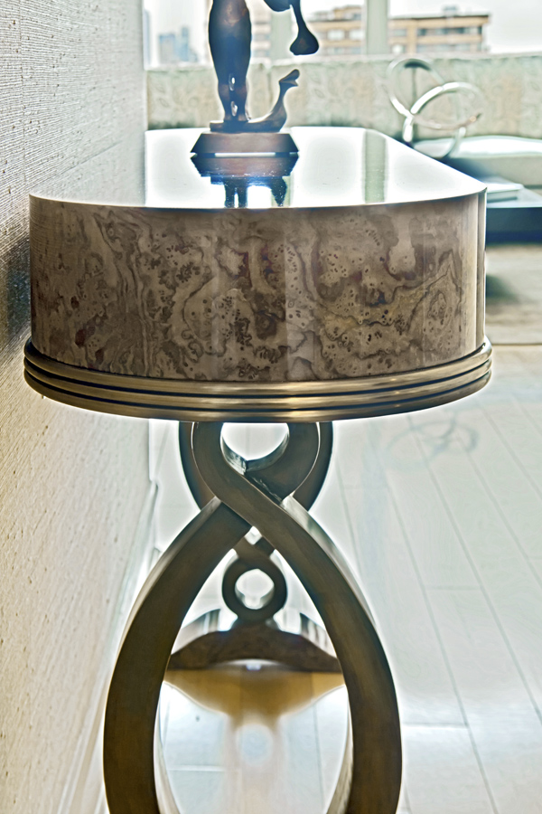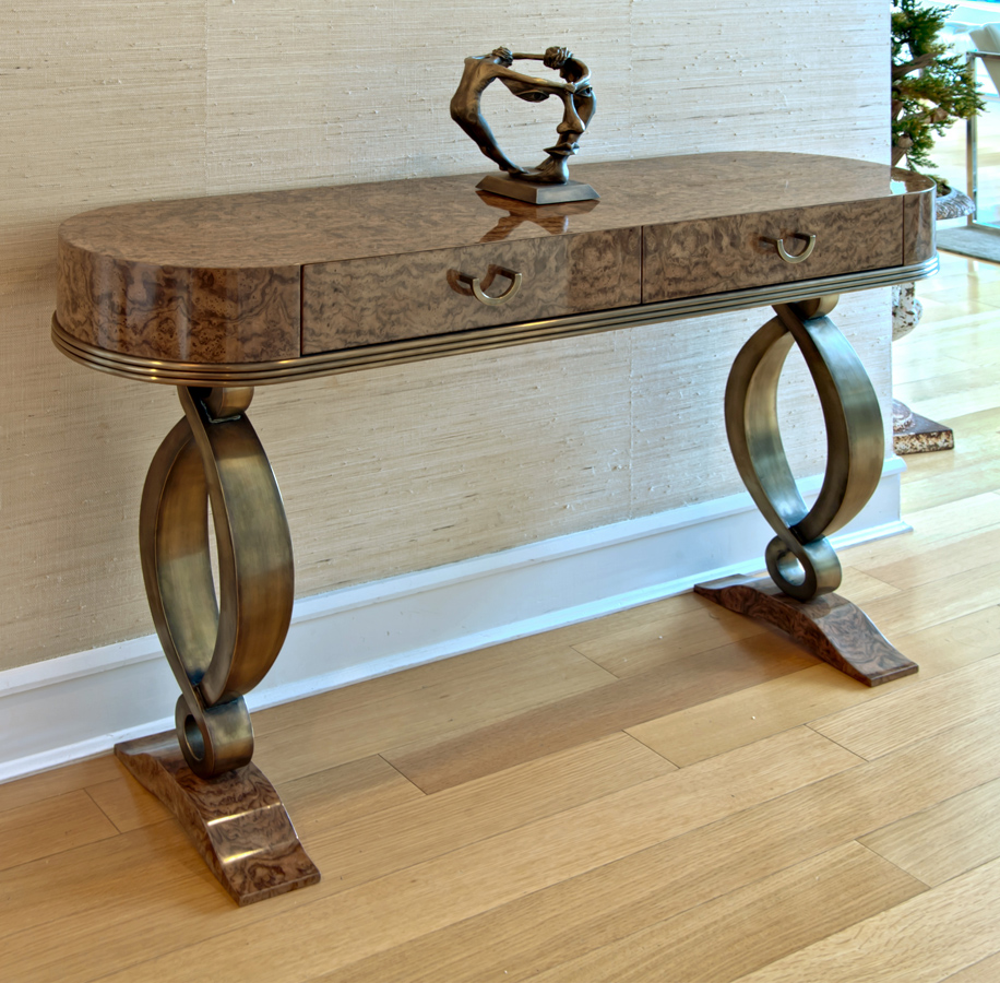 Bronze and Walnut Burle Wall Console in high gloss lacquer merges art, craft and excitement.