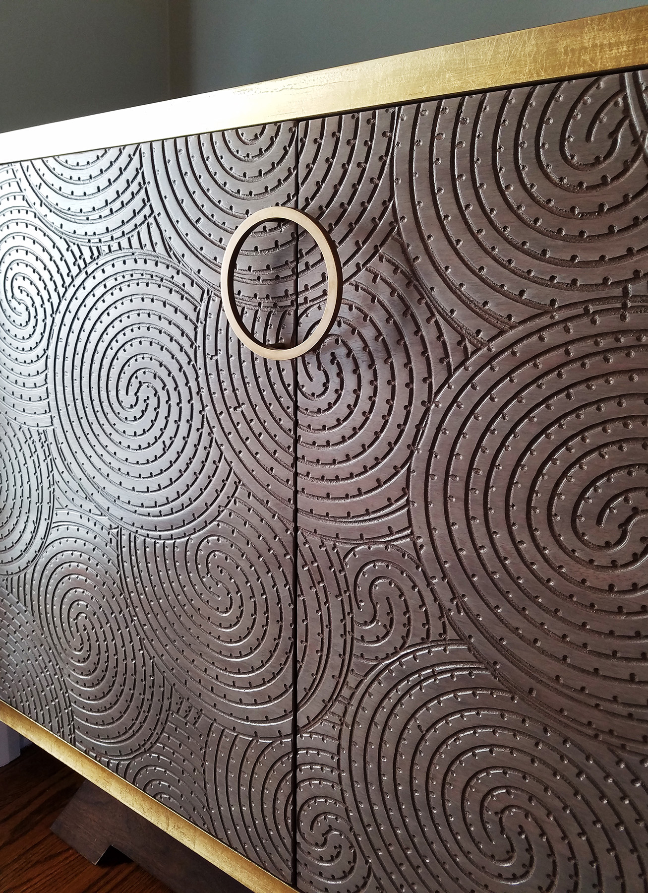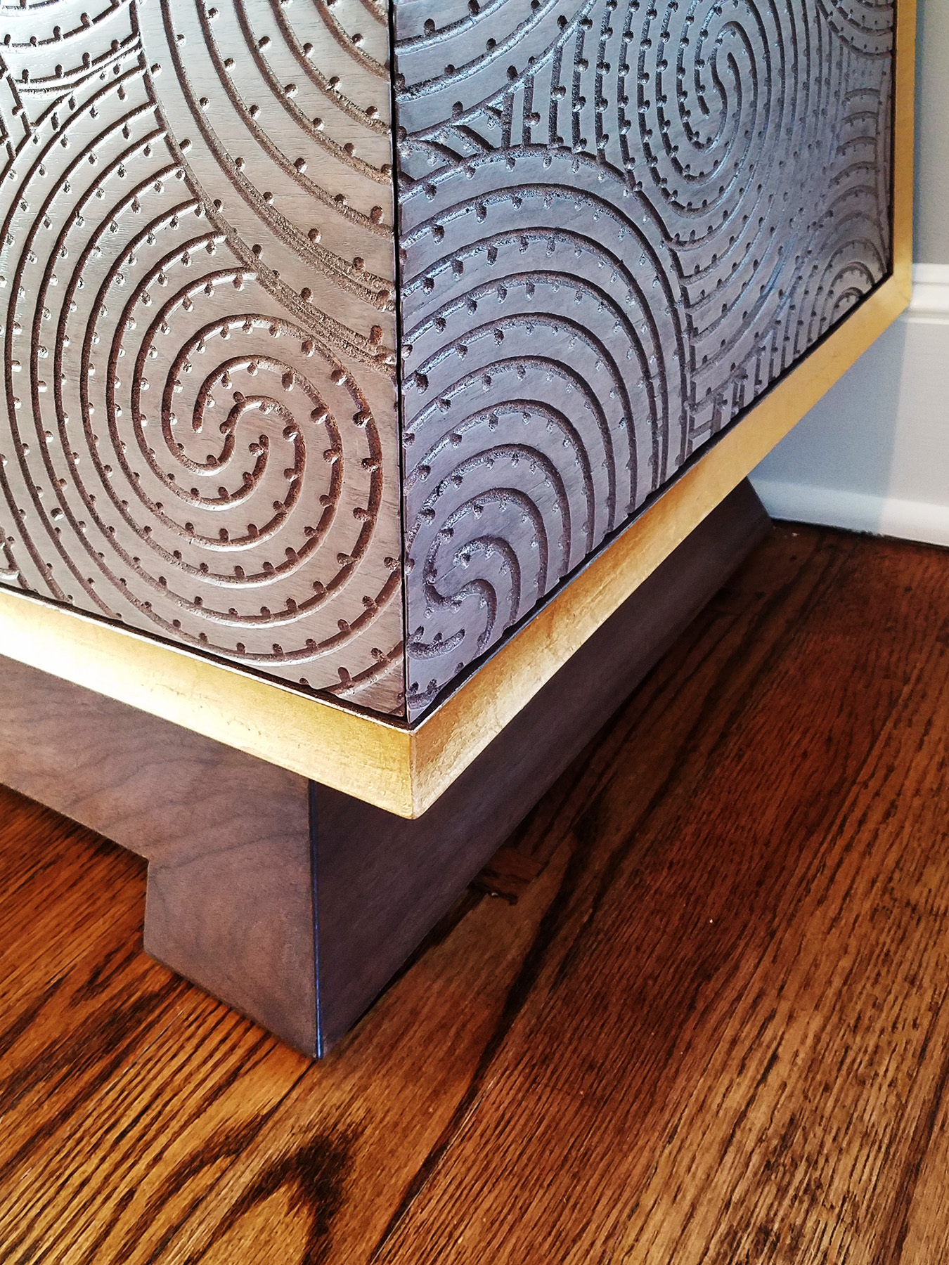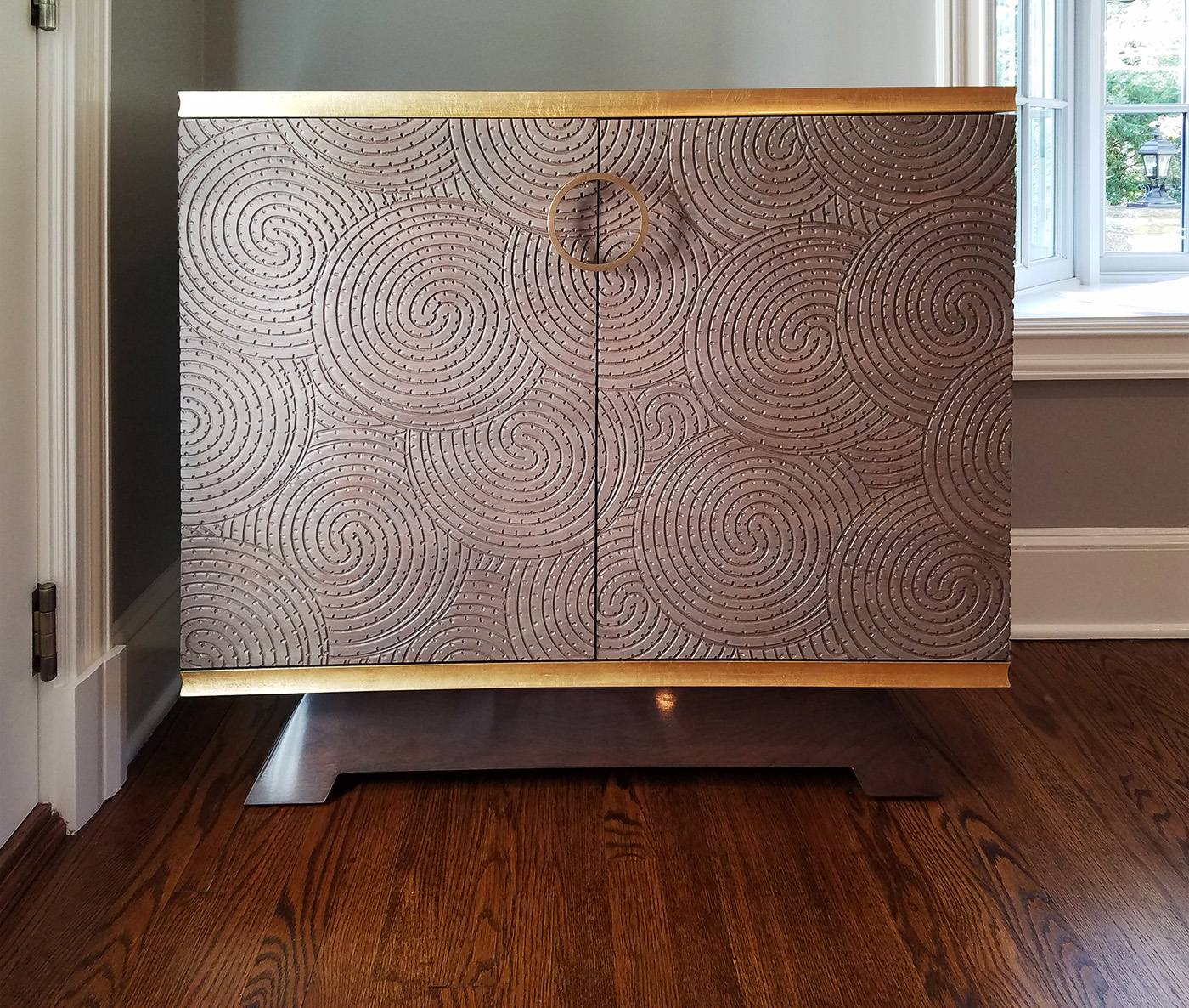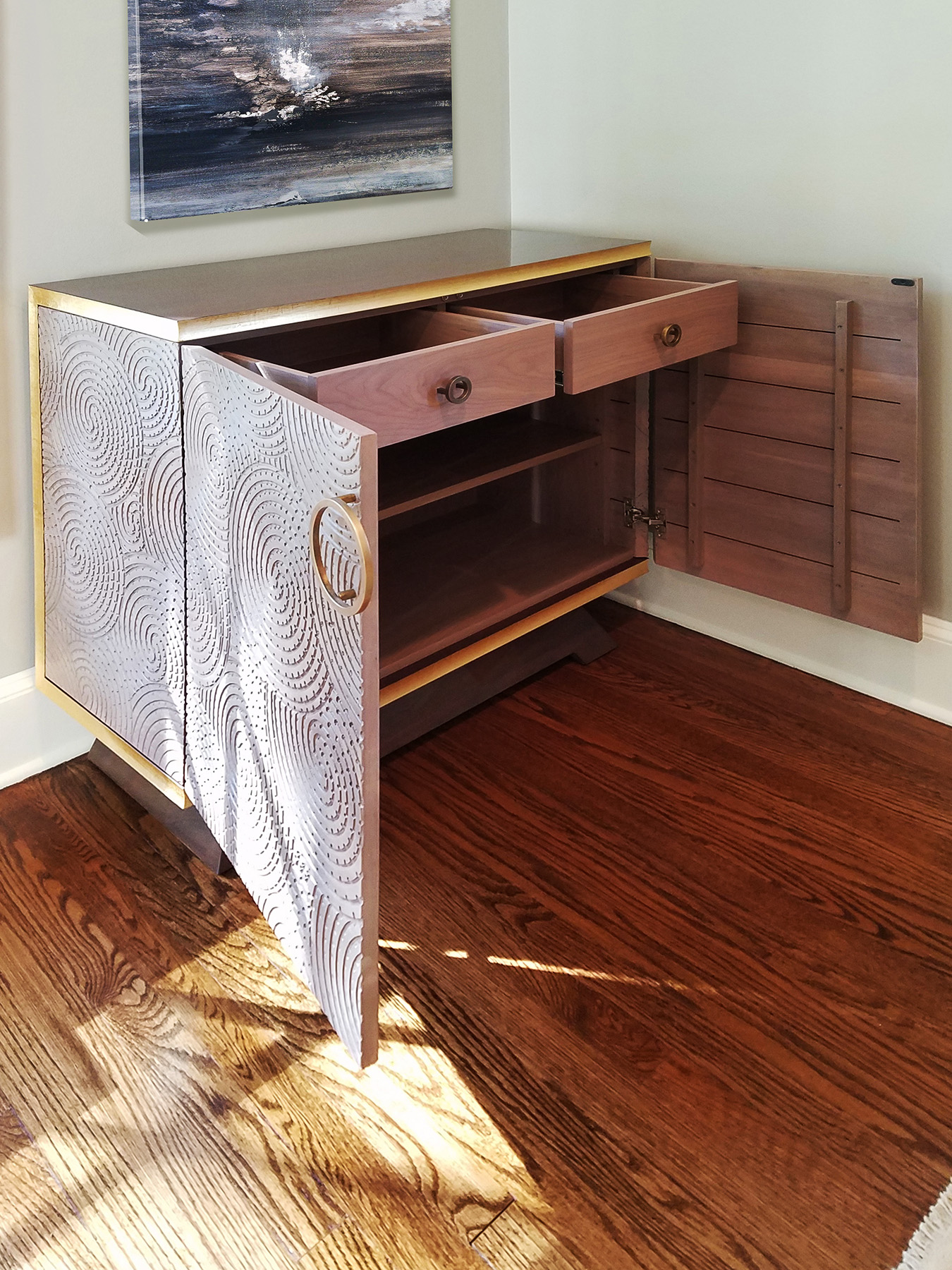 Swirls of Carved Walnut make the fronts and sides of these pieces stunning and unique. This fine, handcrafted millwork is trimmed with Gold Lead and features flared bases, custom outfitted finished cabinet interiors and custom-made Circular Bronze Pulls.
