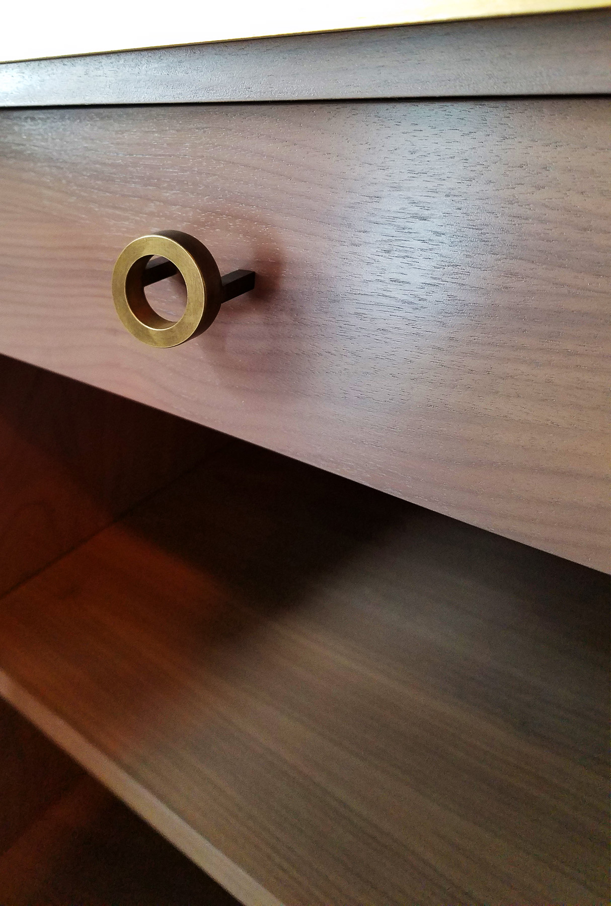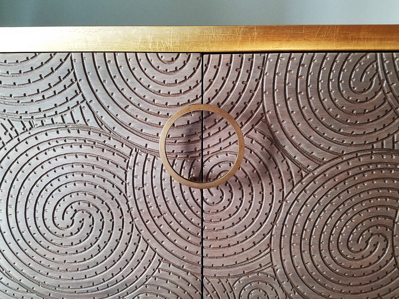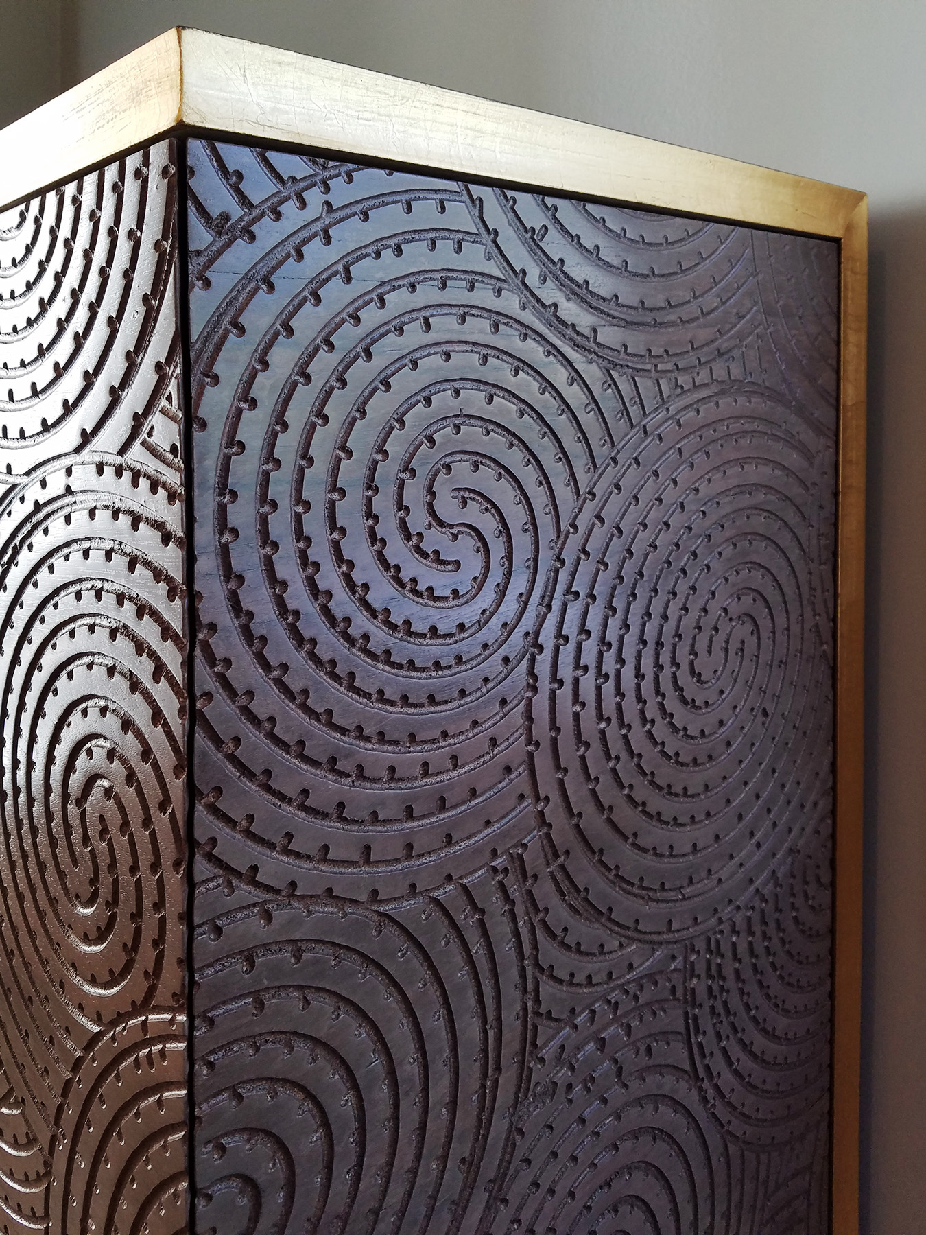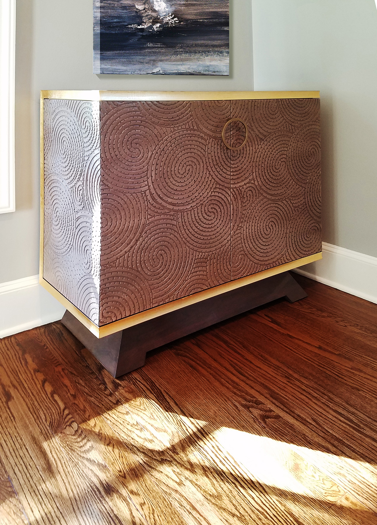 Swirls of Carved Walnut make the fronts and sides of these pieces stunning and unique. This fine, handcrafted millwork is trimmed with Gold Lead and features flared bases, custom outfitted finished cabinet interiors and custom-made Circular Bronze Pulls.