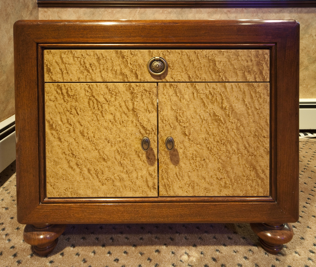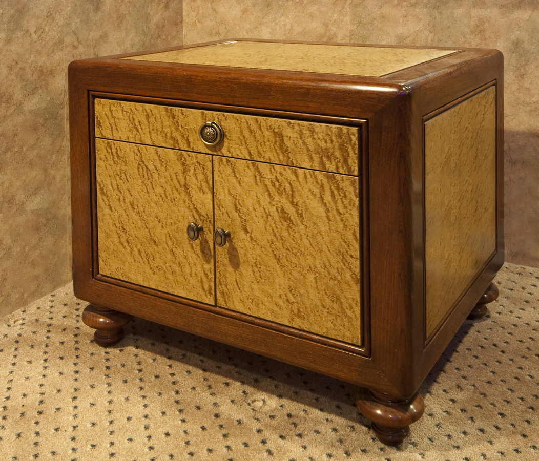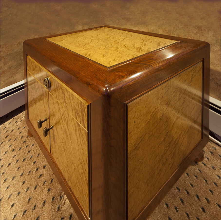 Precious Cube End Table in Birds Eye Maple and solid Mahogany.